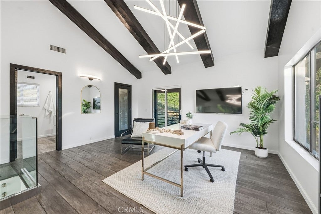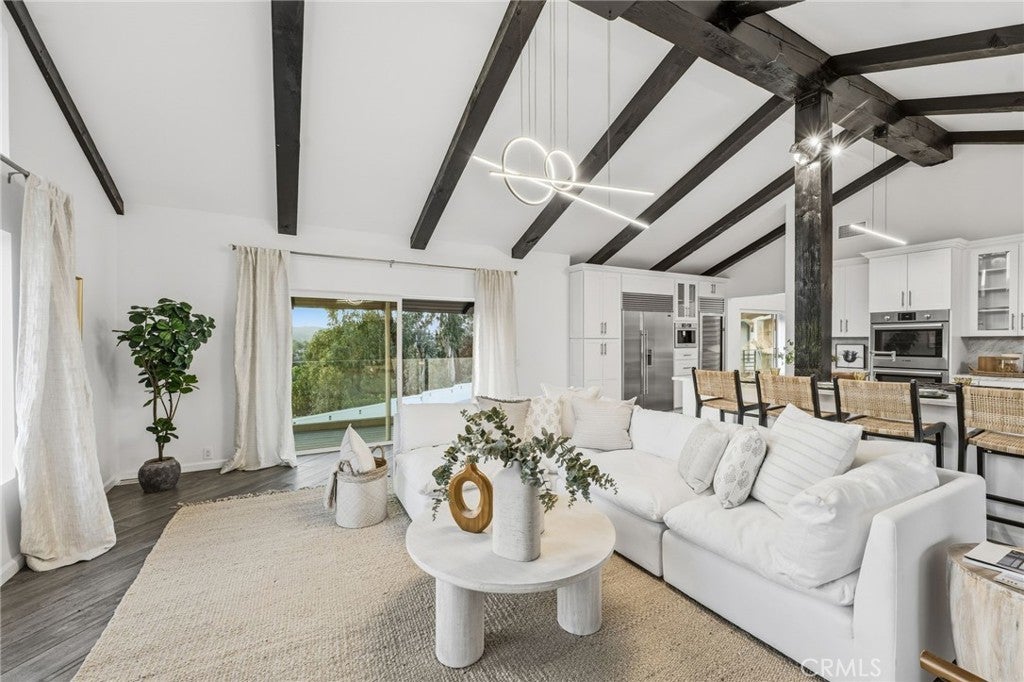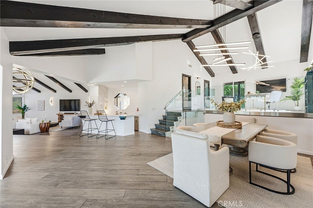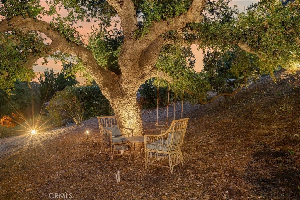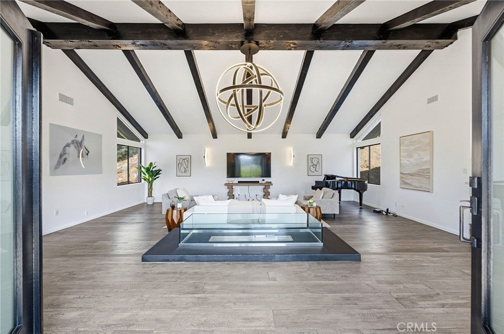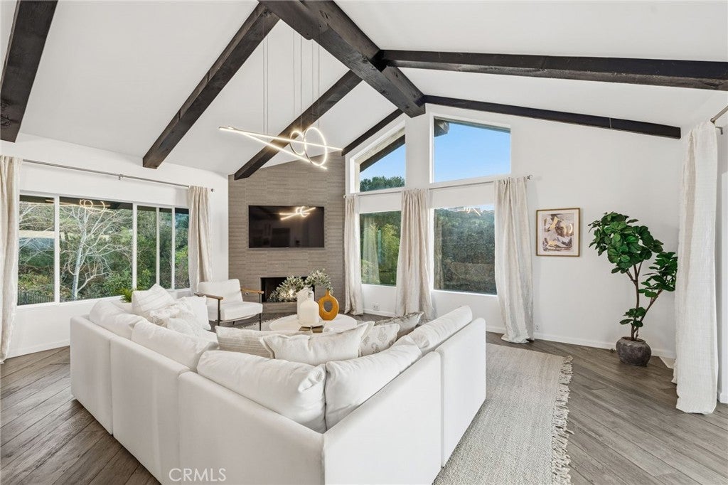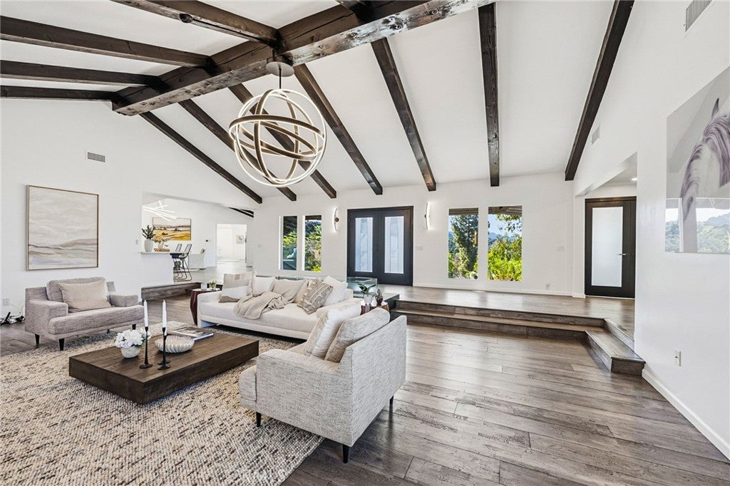 Built for sunsets! Hilltop views and stylish California living come together in this private Westlake Village estate. Perched at the top of a hill, this custom-built home offers refined style, privacy, open skies and sweeping sunset views in the idyllic Westlake Trails. A grand double-door entry opens to soaring, beamed ceilings, wide plank flooring and expansive walls of glass that fill the home with natural light and panoramic views from nearly every living space. Sleek and stylish contemporary finishes blend with warm California character, creating an atmosphere that feels sophisticated and relaxing. A grand scale living room with dramatic ceilings flows past a built-in bar and into the formal dining area, bordered by a wall of windows and glass capturing hillsides and sunsets. The open layout continues into an inviting kitchen and family room. The thoughtfully-designed kitchen, with oversized island, glass-front cabinetry and Carrara marble surfaces is equipped with high-end appliances including built-in espresso and wine refrigeration. A statement, full-height tiled fireplace anchors the family room, while sliding doors open to a veranda spanning the length of the home capturing golden light and sunset views. The flexible floor plan provides versatility with two-bedroom suites on separate levels, plus a large loft with en-suite bath and private balcony, ideal to create a fourth bedroom, office or studio. A private window-lined corridor leads to a tranquil primary suite filled with natural light, hillside views, private balcony and direct access to the pool terrace. The spa-inspired bath embraces an open, resort-style design with beautiful dark stone finishes, oversized shower and walk-in closet. Outdoor spaces throughout the property offer a variety of ways to relax, gather and take in the views. The expansive terrace and pool deck are perfect for capturing breezes, city lights and incredible views of summer fireworks, while a garden nook tucked into the hillside creates a quiet retreat. A three-car garage and expansive, long driveway provide ample parking and extra play space and a magnificent oak tree, with swings swaying from twisted branches, provide shade and storybook charm to this quiet retreat home. A peaceful hillside home designed for panoramic views, privacy and lifestyle perfectly situated in one of the most sought-after neighborhoods of Westlake Village.