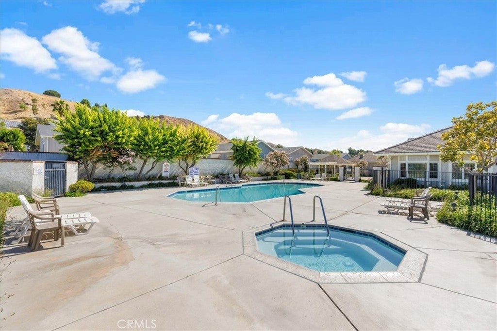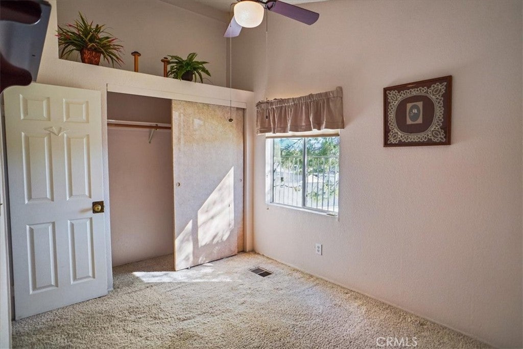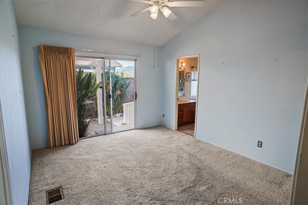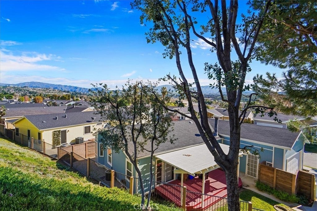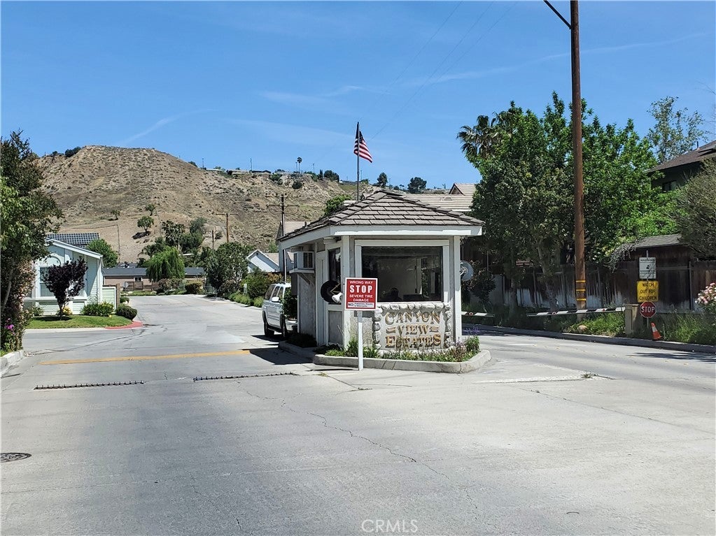 Situated within the gated community of Canyon View Estates, this popular Plan 1 home is currently the most attractively priced property in the neighborhood—an incredible opportunity to enjoy resort-style living in a highly desirable setting. Filled with natural light, the home captures beautiful mountain and hillside views and reflects true pride of ownership. Thoughtful updates include a newer roof (approximately five years old), newer support jacks within the concrete foundation, upgraded air conditioning and HVAC system, newer water heater, and a recently re-tiled shower in the primary bath. The kitchen offers warm wood-grain cabinetry, laminate countertops, a built-in microwave, gas range and stove, and includes the refrigerator. A lovely window above the sink overlooks the manicured front yard. Tile flooring flows through the kitchen, while the dining area features stylish wood laminate flooring. Ceiling fans in both bedrooms, the living room, dining area, and kitchen enhance year-round comfort. Sliding glass doors from the living room and primary bedroom lead to a private side patio highlighted by vibrant Bird of Paradise plants and sweeping mountain and valley views—an inviting space to relax or entertain. The generous laundry room provides ample cabinetry for storage, with washer and dryer included. The direct-access garage features substantial built-in shelving and convenient side-yard access. Canyon View Estates is a leased land community, offering the opportunity to own the home while leasing the land (currently approximately $1,650 per month). Residents enjoy exceptional amenities including two swimming pools, a sports/tennis court, two playgrounds, a banquet/recreation room with kitchen, RV parking (subject to availability), beautifully maintained greenbelts, and 24-hour gate attendant service. Just beyond the gates is Discovery Park with its scenic trails. Ideally located near shopping, dining, freeway access, and Metrolink stations, this home offers an outstanding blend of value, comfort, and lifestyle.