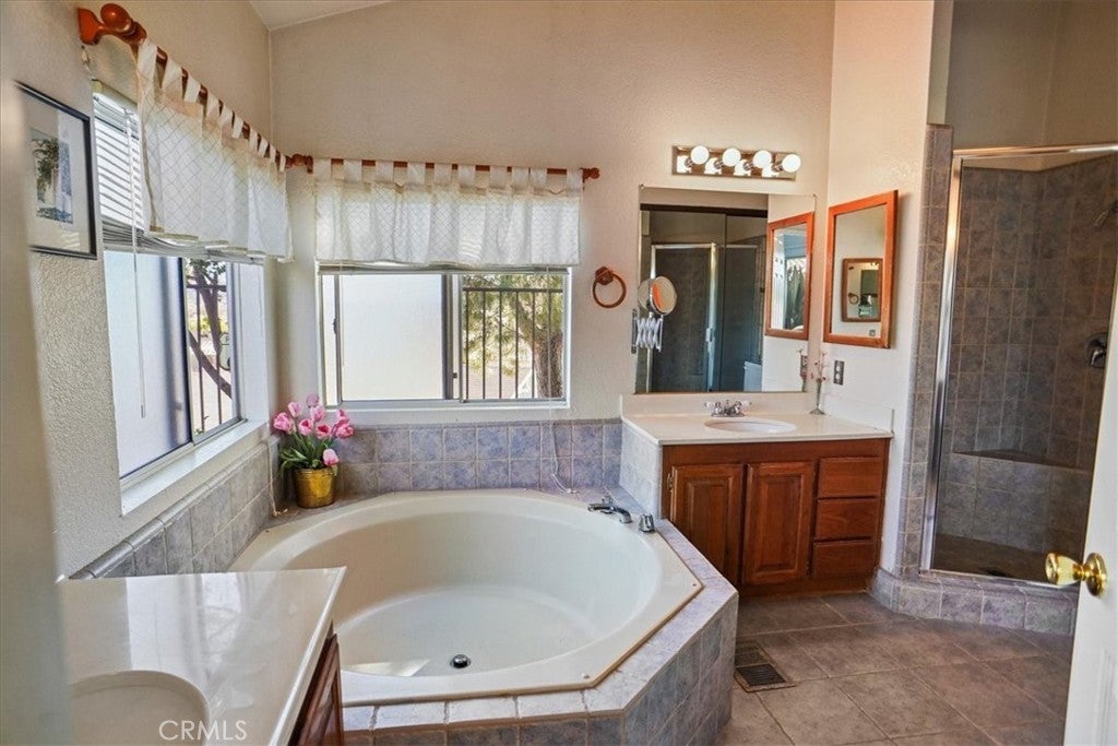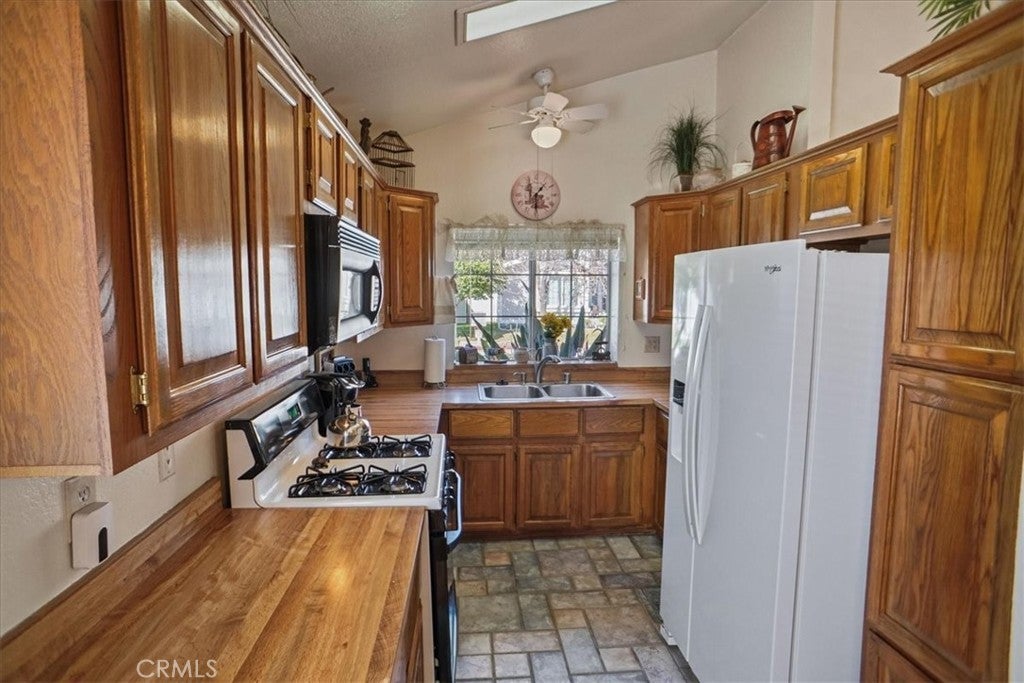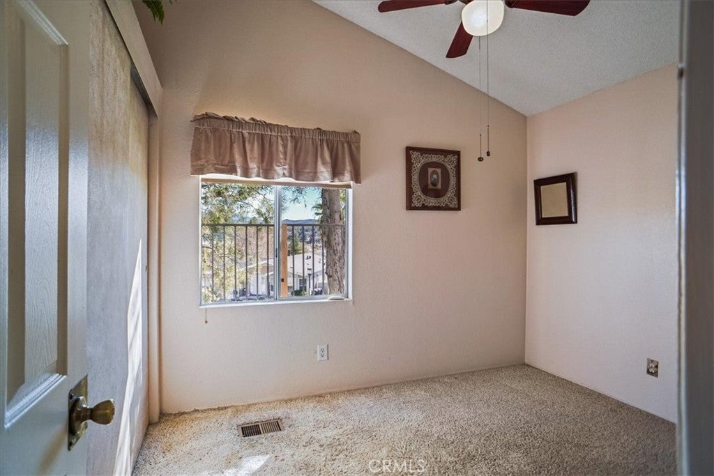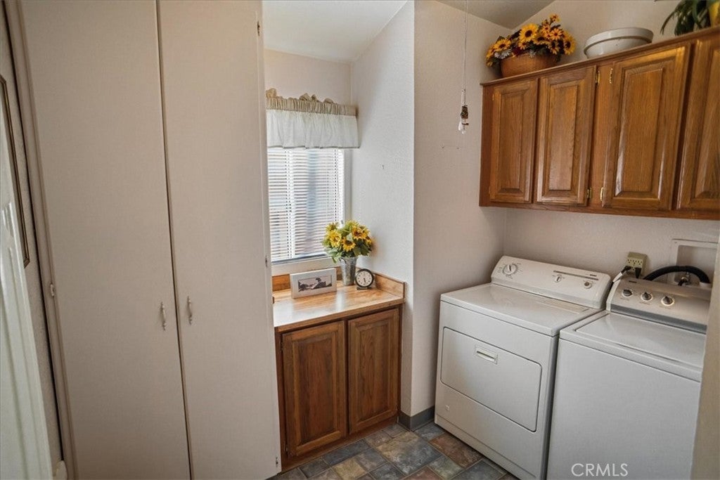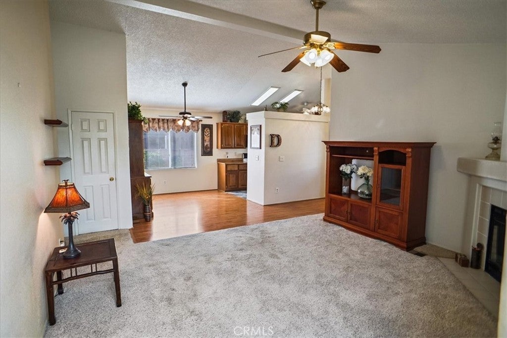 Situated within the gated community of Canyon View Estates, this popular Plan 1 home is currently the most attractively priced property in the neighborhood—an incredible opportunity to enjoy resort-style living in a highly desirable setting. Filled with natural light, the home captures beautiful mountain and hillside views and reflects true pride of ownership. Thoughtful updates include a newer roof (approximately five years old), newer support jacks within the concrete foundation, upgraded air conditioning and HVAC system, newer water heater, and a recently re-tiled shower in the primary bath. The kitchen offers warm wood-grain cabinetry, laminate countertops, a built-in microwave, gas range and stove, and includes the refrigerator. A lovely window above the sink overlooks the manicured front yard. Tile flooring flows through the kitchen, while the dining area features stylish wood laminate flooring. Ceiling fans in both bedrooms, the living room, dining area, and kitchen enhance year-round comfort. Sliding glass doors from the living room and primary bedroom lead to a private side patio highlighted by vibrant Bird of Paradise plants and sweeping mountain and valley views—an inviting space to relax or entertain. The generous laundry room provides ample cabinetry for storage, with washer and dryer included. The direct-access garage features substantial built-in shelving and convenient side-yard access. Canyon View Estates is a leased land community, offering the opportunity to own the home while leasing the land (currently approximately $1,650 per month). Residents enjoy exceptional amenities including two swimming pools, a sports/tennis court, two playgrounds, a banquet/recreation room with kitchen, RV parking (subject to availability), beautifully maintained greenbelts, and 24-hour gate attendant service. Just beyond the gates is Discovery Park with its scenic trails. Ideally located near shopping, dining, freeway access, and Metrolink stations, this home offers an outstanding blend of value, comfort, and lifestyle.