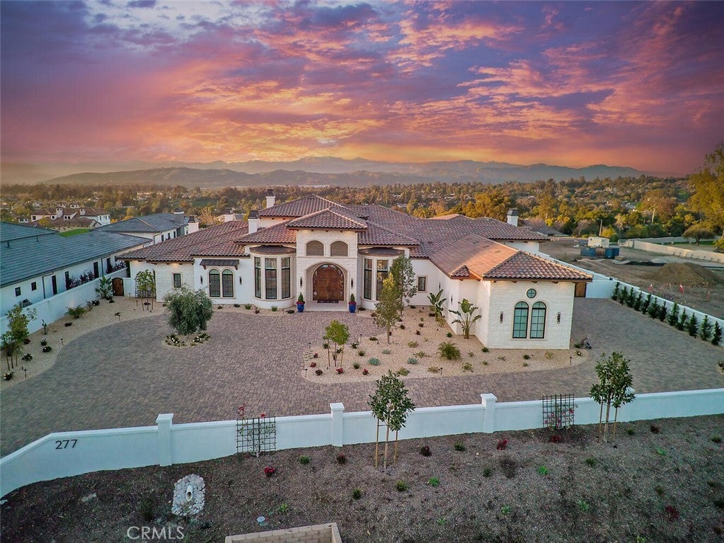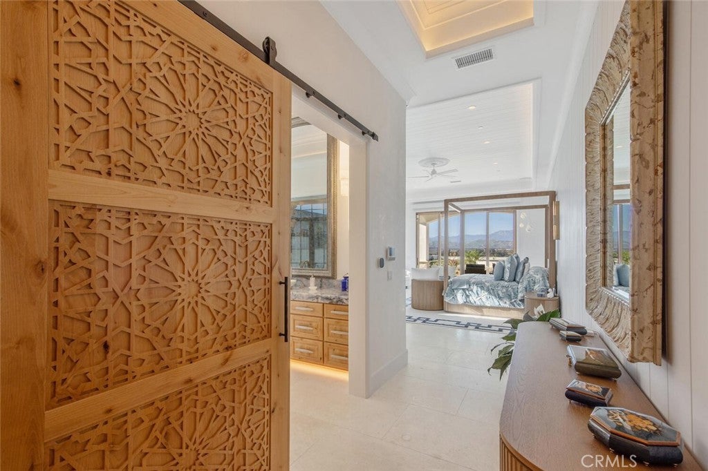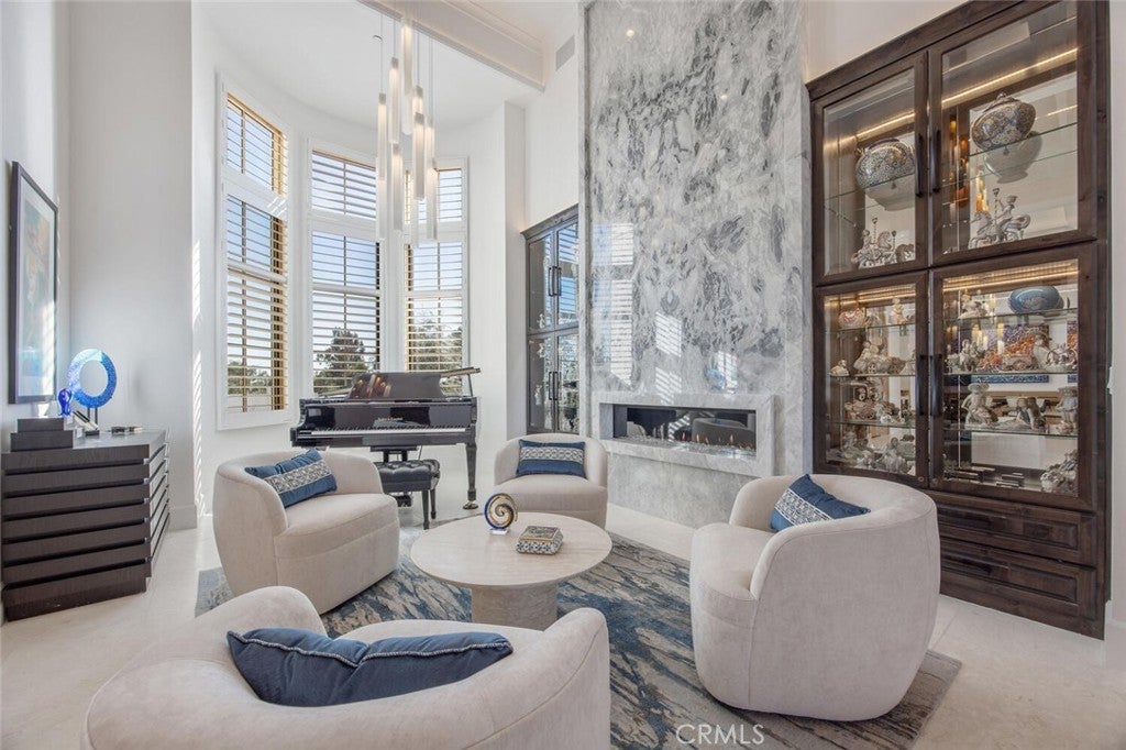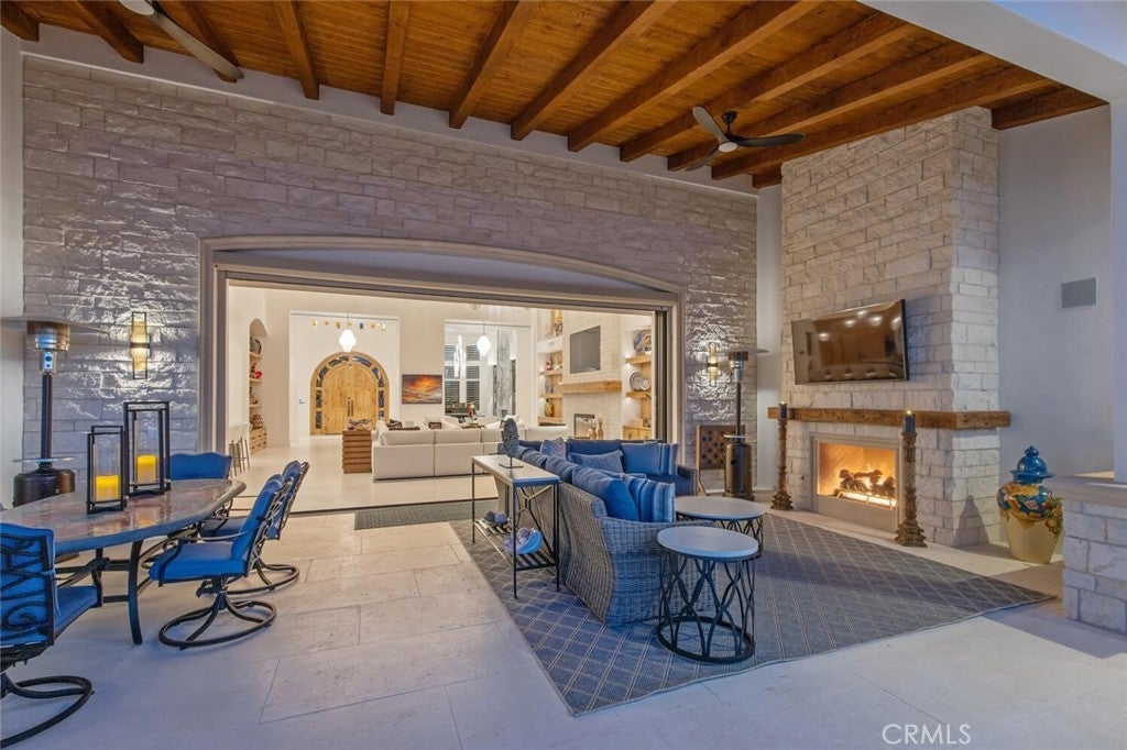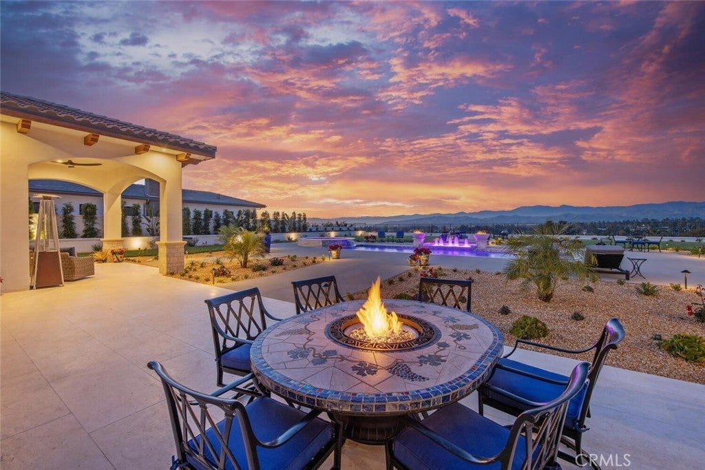Completed in 2025, this single-story architectural residence is set on approximately one acre of gated grounds, blending panoramic views with refined design and resort-caliber living. A dramatic foyer introduces Turkish white limestone floors, hand-applied Venetian plaster walls, and a sculptural multi-tier chandelier. Beyond, the great room soars to 26-foot ceilings with a limestone fireplace and expansive 20-foot disappearing nano doors that dissolve the boundary between interior and exterior living. The turret-style living room is framed by 12-foot windows and anchored by a striking quartzite fireplace, while the formal dining room features custom built-ins and designer lighting. The chef’s kitchen impresses with 15’6” ceilings, custom knotty alder cabinetry, dual navy-stained islands, quartzite countertops, premium appliances, and an adjoining circular breakfast nook. A fully equipped prep kitchen, Butler’s Pantry, and concealed walk-in pantry ensure effortless entertaining. The wine room is a statement piece, clad in backlit gemstone slabs with custom alder racking and a 70-bottle refrigerator. A 50-foot gallery hallway leads to a show-stopping powder room and into thoughtfully designed private spaces, including a tiered theater with 140-inch screen and full bar, and a sophisticated study with quartzite fireplace and French doors opening to a secluded patio. Three secondary bedroom suites feature bespoke finishes and private baths, with one currently styled as a gym overlooking pool and mountain views. The primary suite is a retreat of its own, complete with fireplace, nano doors to the yard, dual custom walk-in closets, and a spa-inspired bath offering a sculptural soaking tub, quartzite vanities, and an oversized backlit quartzite steam shower. Outside, the gated motor court with permeable pavers leads to an oversized three-car garage. The resort-style grounds showcase a covered patio with wood-paneled ceiling, stone fireplace, and outdoor kitchen. The beach-entry pool features a 10-foot spa, waterfall, fire bowls, and tranquil fountain, complimented by designer pavers. A detached casita offers complete privacy with limestone floors, a full kitchen, bedroom suite, designer bath, and covered patio with quartzite bar. An extraordinary estate blending architectural presence, refined craftsmanship, and resort-caliber amenities.