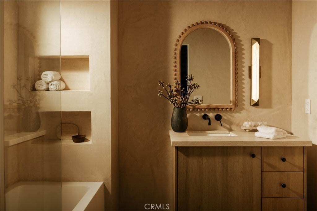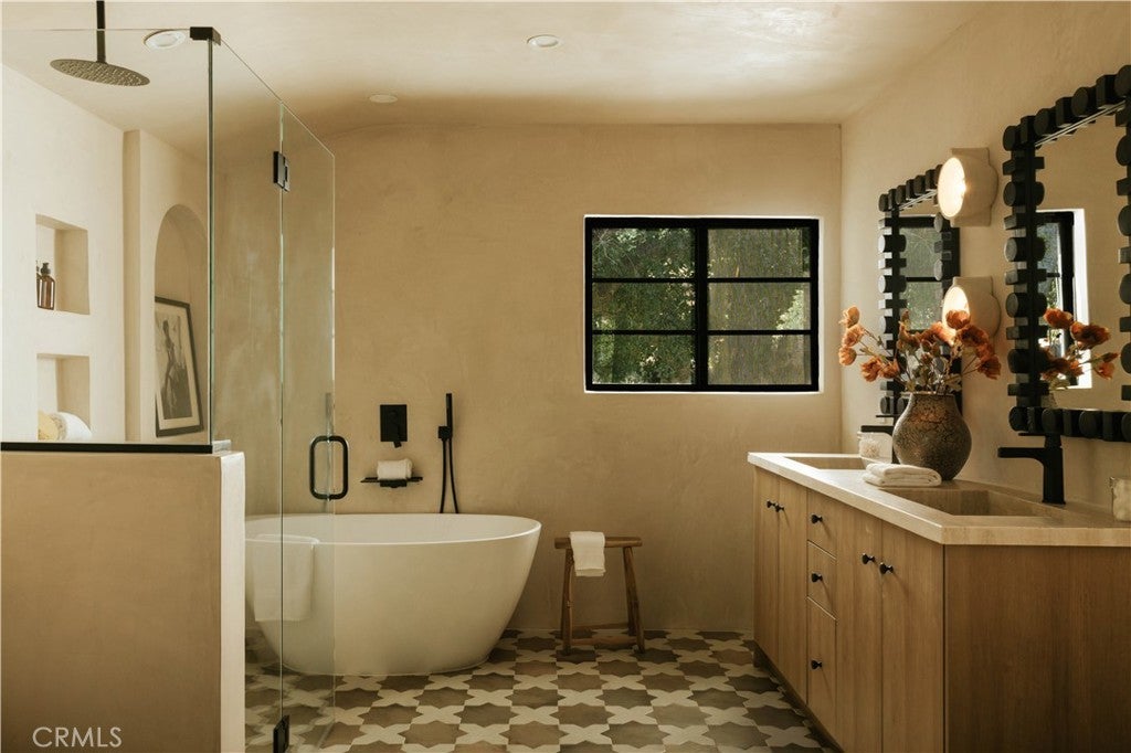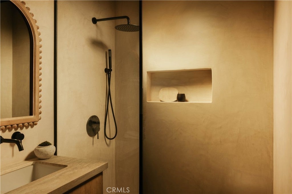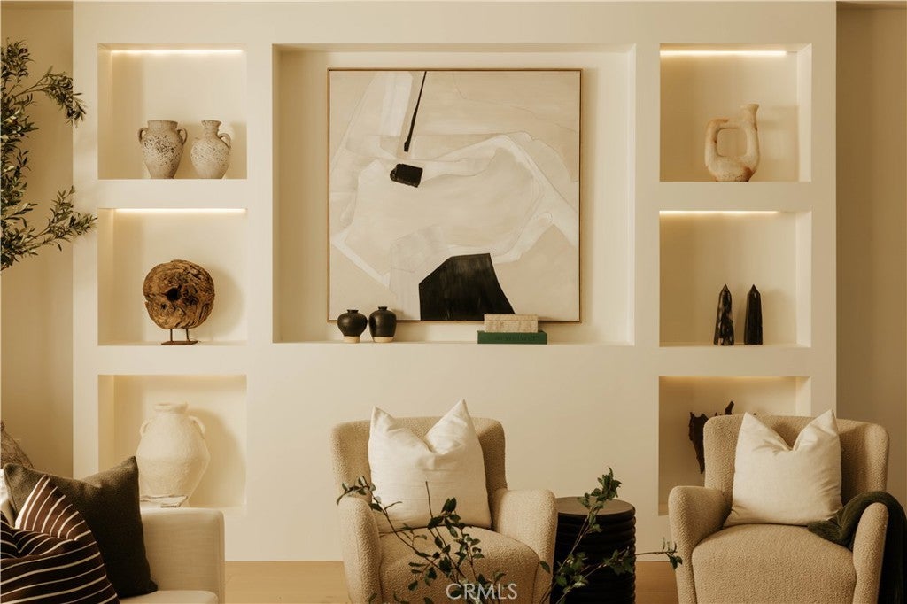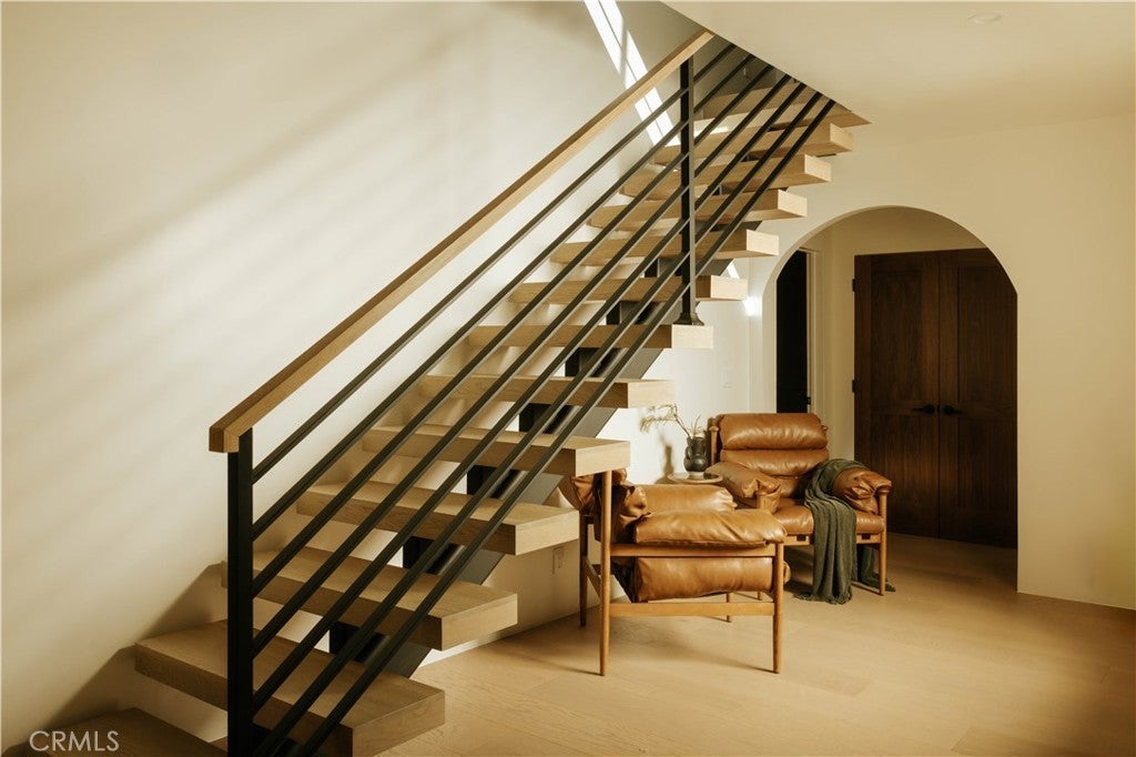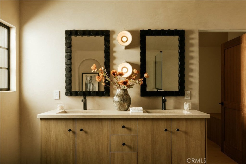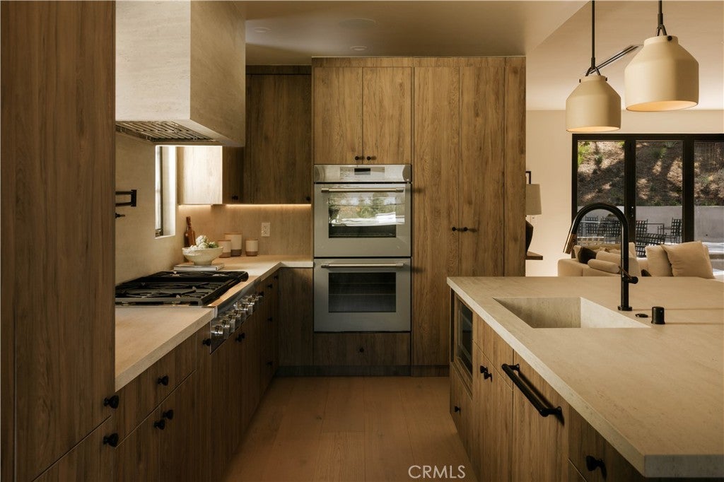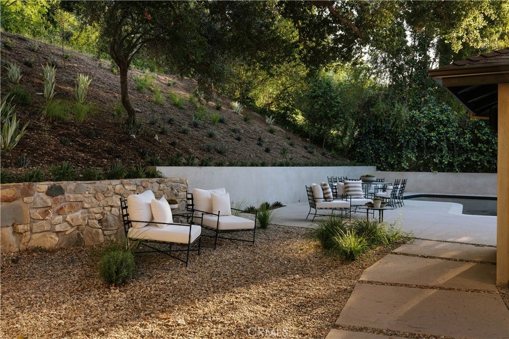 Perched above the street with commanding views, this gated Encino estate offers a rare blend of privacy, scale, and refined design. Set behind a private driveway south of Ventura Boulevard, the residence has been meticulously reimagined to embody a sophisticated, modern Mediterranean aesthetic. Every detail has been thoughtfully curated, with a full rebuild including new plumbing, electrical, and roof systems. Interiors are defined by a rich, organic palette of white oak floors, clay and hand-applied plaster walls, and custom walnut cabinetry, layered with exposed wood beams and sculptural architectural lines that evoke understated luxury. Designed for both grand entertaining and elevated everyday living, the main living spaces unfold with effortless flow, bathed in natural light and seamlessly connecting to the outdoors. The chef’s kitchen serves as a striking centerpiece, appointed with travertine-look surfaces, integrated Thermador appliances, and a sculptural island that anchors the space with quiet sophistication. Bathrooms are finished in microcement, offering a clean, gallery-like aesthetic that complements the home’s natural materials and refined tone. The primary suite is a private sanctuary, designed with a spa-like sensibility, while each secondary bedroom reflects the same level of craftsmanship and intention. Outdoors, the grounds feel like a secluded retreat. A Pebble Tec pool, multiple lounge areas, and expansive entertaining spaces are set against a backdrop of sweeping views, creating an atmosphere that is both serene and cinematic. Modern living is elevated through a fully integrated smart home system, with seamless control of audio, security, and climate. All of this is just minutes from the vibrant amenities of Ventura Blvd, including top-rated restaurants, shops, grocery stores, and hiking trails. The home is also conveniently close to prestigious private schools & public schools, offering the best of both privacy and convenience.