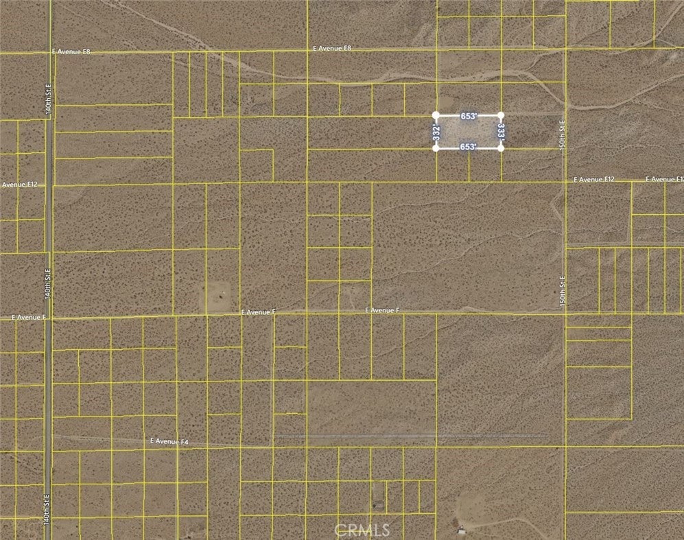 Very nice 5-acre land parcel, located within the LA County Waterworks District! This parcel is also believed to have frontage on E Ave F-10 (buyer to verify). There are many ranch homes around this parcel. This parcel is very close to Ave G and 140th St E, both of which are paved streets. This parcel is also very close to the south gate of Edwards AFB. Water should be available for connection through Waterworks and electricity may potentially be accessed from a cluster of homes south of the property. This parcel is the perfect opportunity for someone looking to build a home, install a mobile home, or camp in an area that is secluded but not totally isolated. Lots of land with a close-in location at a great price!