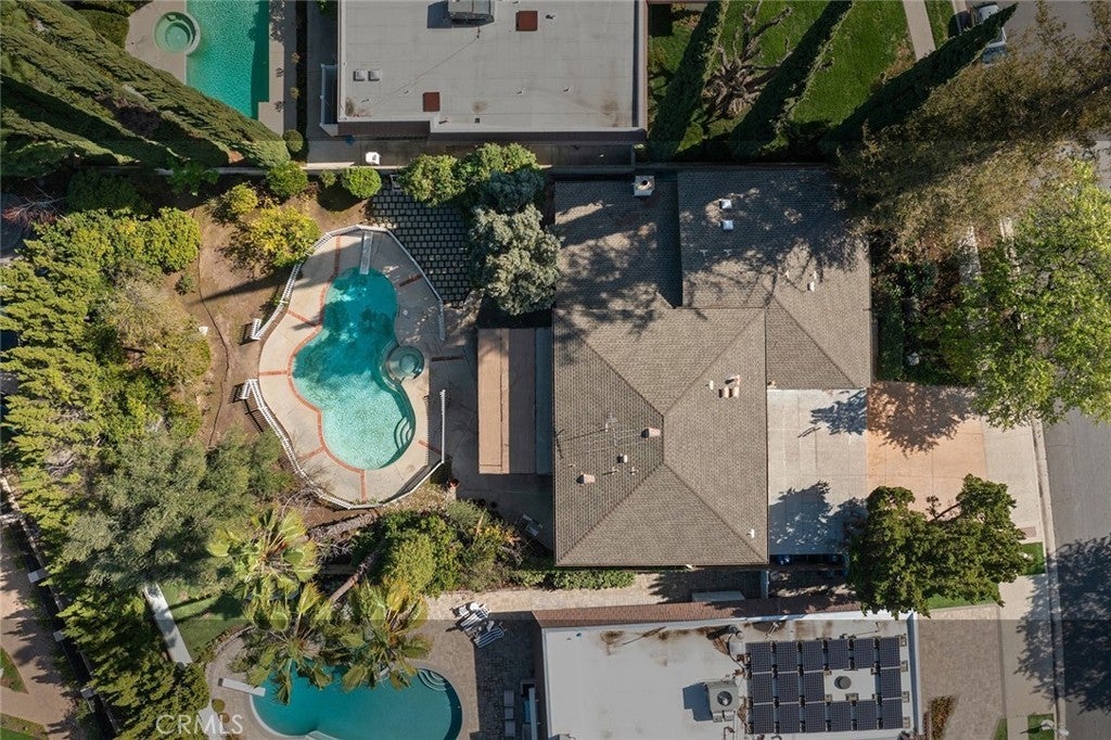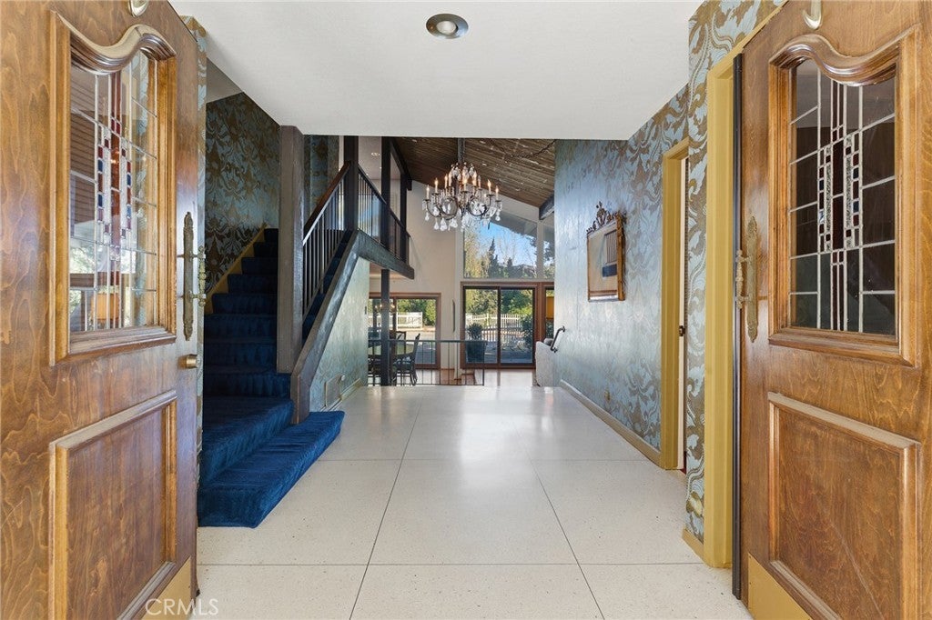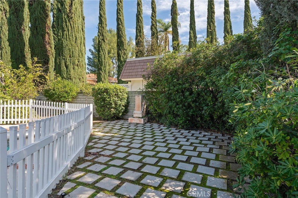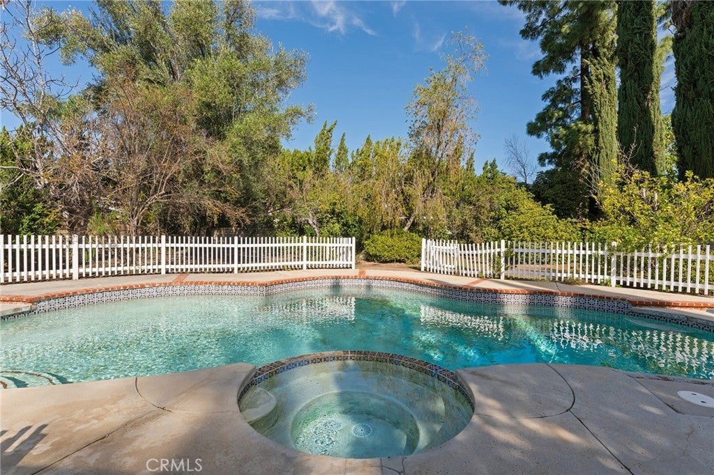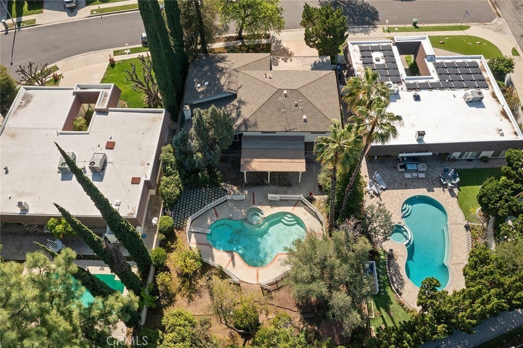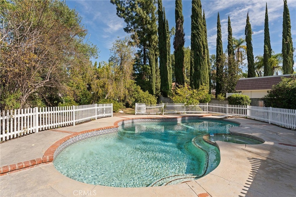 Incredible opportunity to purchase a Mid-Century timepiece offered on the market for the first time in almost 50 years. Located on a quiet cul-de-sac West of Valley Circle, the sprawling property sits on an impressive 11,000+ SF flat lot, with one of the largest usable backyards in the neighborhood. Wide frontage is adorned with mature trees, lush landscaping, and driveway that leads to a 3-car attached garage. A tiled covered front porch with original double front doors opens to a grand entry foyer with original terrazzo tiled flooring, coat closet, and guest powder bathroom. The formal living room boasts gorgeous vaulted wood beamed tongue and groove ceilings, brick fireplace, and two sets of Pella glass sliders that open to the backyard. The formal dining room has direct kitchen access and another glass slider that opens to the covered patio. Separate family room has wood product walls, built-in bookshelves, and a stellar walk-in wood paneled wet bar with sink, wine storage, and custom built-ins. The spacious kitchen overlooks the yard and features island, peninsula, custom cabinetry, Sub Zero fridge/freezer, Thermador stovetop, double ovens, pantry space, and separate breakfast room with another slider that opens to the yard. The oversized primary suite is located on the first floor featuring large walk-in closet, original built-in desk with wardrobe closets, and private en-suite bathroom with dual sinks, walk-in shower, and separate roman soaking tub. Upstairs you will three additional well appointed bedrooms plus bonus loft that overlooks the living room with built-in bookshelves making it the ideal flex space for office or den. One of the secondary bedrooms has an en-suite bathroom and the other two share a large hall bath. There is also a laundry room with direct access to the 3-car garage with great storage. The entertainer’s backyard boasts freeform pool & spa, covered patio, BBQ center, full growth olive tree, mature palms, variety of of fruit trees including fig/pomegranate/lemon, and an expansive area that extends beyond the pool with endless possibilities including guest house/court/etc. Adjacent to dining/shopping at the Westfield Mall/Village, The Calabasas Commons, Warner Center, & zoned for award-winning El Camino & Hale charter schools.