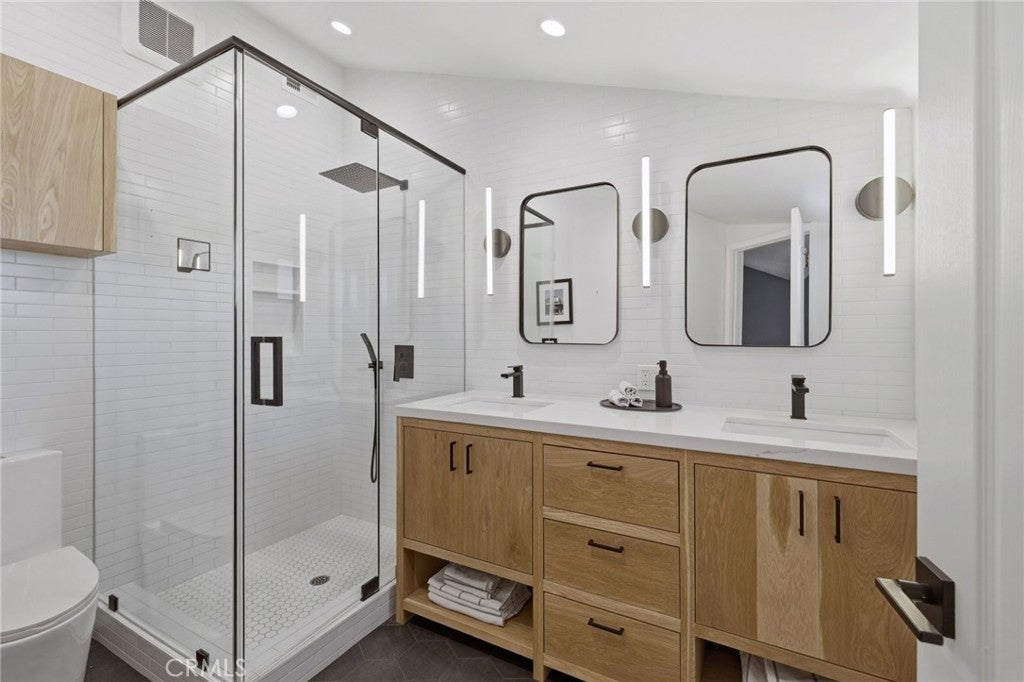 Welcome to this beautifully renovated 4-bedroom, 3-bathroom gated home in highly desirable Sherman Oaks. Step inside to discover thoughtful upgrades throughout. The spacious primary suite features soaring cathedral ceilings, abundant natural light, additional storage space, and a sliding glass door that opens directly to the backyard retreat. The luxurious en-suite primary bath showcases dual vanities, a large walk-in shower with rainfall fixtures, subway tile finishes, custom white-oak cabinetry, and extra storage. All three bathrooms have been fully renovated in recent years with high-end finishes including subway tile, rainfall showers, and custom white-oak vanities. The second bedroom also features its own en-suite bath, making it perfect for guests or multigenerational living. The third and fourth bedrooms offer generous closet space and comfortable layouts. Beyond the cosmetic updates, major system improvements provide peace of mind: the electrical panel, HVAC system, plumbing, flooring, fireplace, recessed lighting, and chandeliers have all been replaced or refurbished. The private backyard is designed for both relaxation and entertaining, complete with a heated pool and direct access to the 2-car garage, which includes a dedicated Level 2 EV charging outlet. Additional street parking is available for guests. This move-in-ready home combines modern upgrades, a prime location, and exceptional functionality. Ideally located within walking distance to top-rated schools including Notre Dame High School, Louis Armstrong Middle School, and Chandler Elementary, this home also offers convenient access to the 101, 405, 134, and 170 freeways — making commuting throughout Los Angeles effortless.