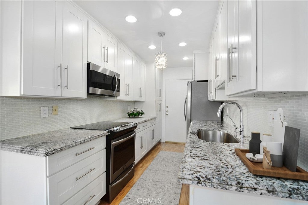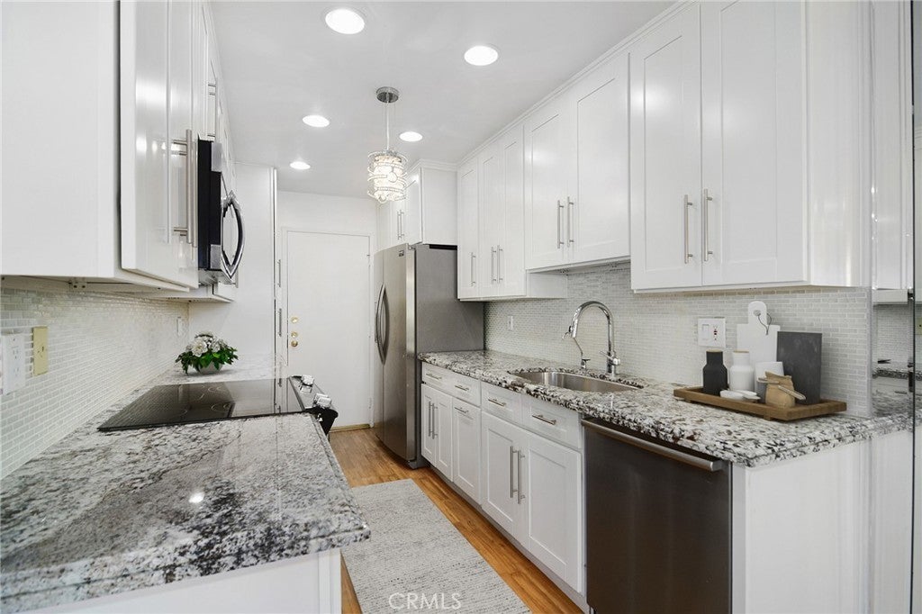 Beautifully renovated Encino condominium—move-in ready and waiting for you. This prime, front-facing corner unit with only one shared wall and two convenient parking spaces offers serene views of lush greenery—not your neighbor’s living room. Smooth ceilings, recessed lighting, and attractive flooring create a warm, welcoming entry. The stunning kitchen features a convenient service entrance, custom cabinetry, distinctive granite countertops, quality stainless-steel appliances (including refrigerator), and an exquisite tile backsplash. A large private balcony invites you to read, relax, or dine surrounded by nature. The primary bedroom is a true retreat, filled with natural light from a large window that frames tranquil exterior views. Mirrored wardrobes plus a walk-in closet provide excellent storage, while the beautifully remodeled en-suite bath boasts a striking walk-in shower. A spacious secondary bedroom and tastefully upgraded second bath complete the interior. At the heart of this well-maintained community, enjoy a refreshing pool and soothing spa. All this and just a short stroll to Ventura Boulevard. Don’t miss this exceptional opportunity.