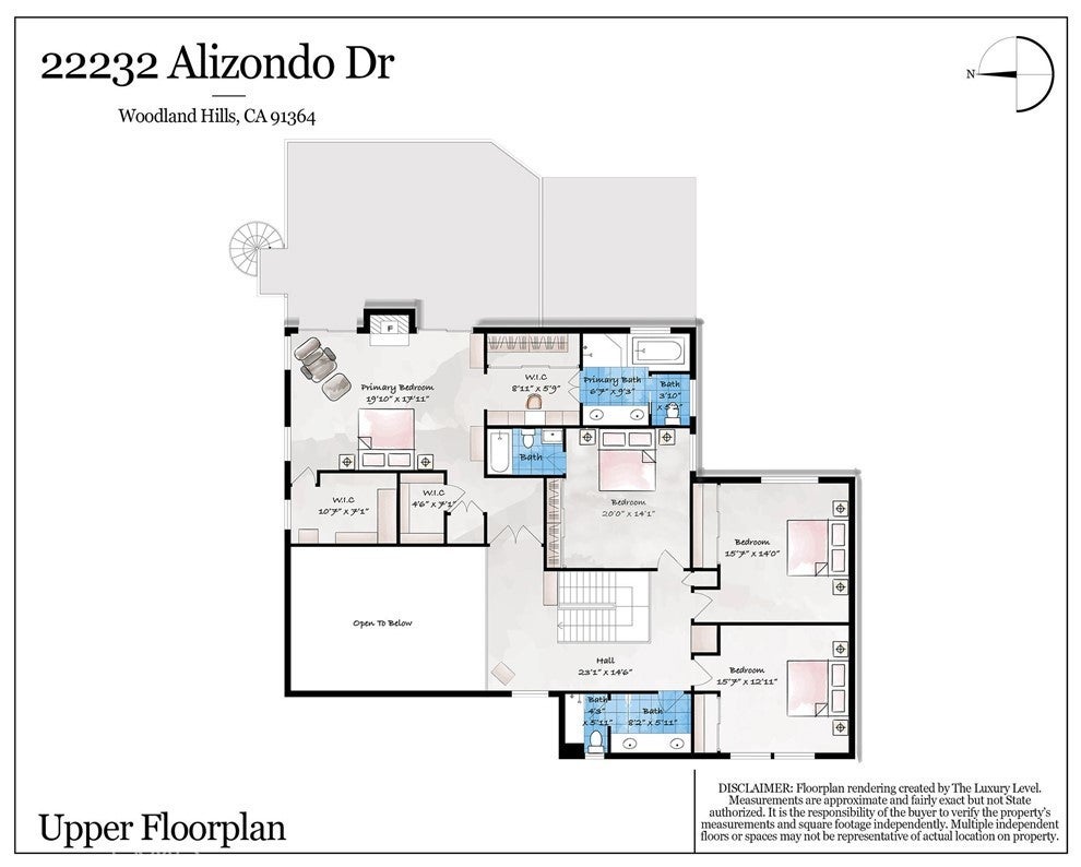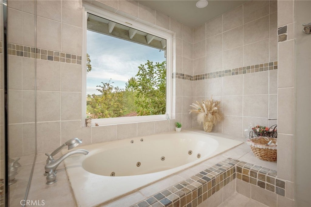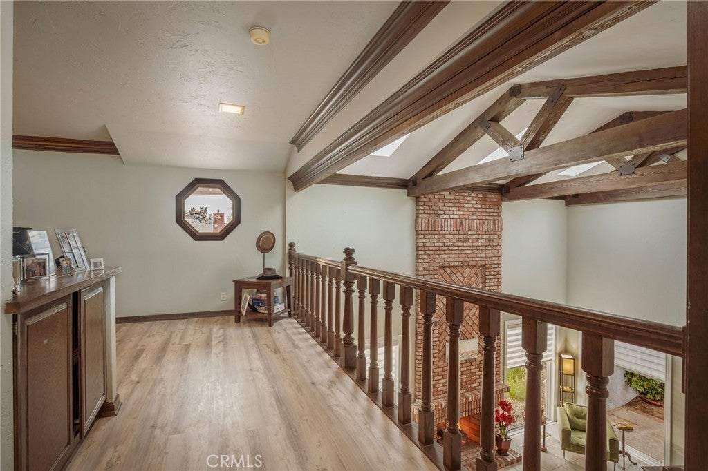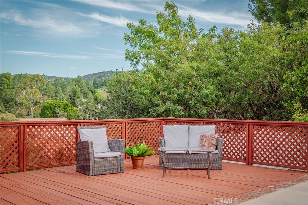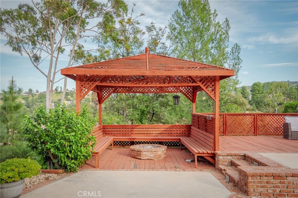 Incredible sunrise and panoramic valley views on a quiet cul-de-sac! This spacious home offers timeless architectural character, great outdoor spaces and practical updates on an expansive hillside in a fabulous Woodland Hills neighborhood. A circular driveway and low-maintenance California native landscaping lead to a covered arched brick portico and double front doors. Inside, the entry reveals a classic wood-railed staircase and opens to a formal living room. Exposed structural truss beams span the vaulted ceiling, large windows invite natural light and a striking floor-to-ceiling brick fireplace create a truly incredible space. The large kitchen captures wide valley views and has been updated with custom shaker cabinetry, quartz countertops, stainless steel appliances, a large center island, and ample storage space. Adjacent, a warm, traditional formal dining room features a decorative glass-inlaid swinging door. A comfortable family room with a corner brick fireplace connects to both spaces, creating an inviting everyday living space. A guest bathroom and complete guest suite complete the lower level. Upstairs, the flexible floor plan offers three additional bedrooms, one ensuite and two with an easy shared bathroom. The generously sized primary suite features a third fireplace, multiple closets, linen storage, and direct access to a large private balcony with sweeping hillside and valley views. A spiral staircase connects the balcony to the backyard below. The backyard sanctuary is surrounded by mature trees and offers a variety of unique usable areas including a large pool and spa, built-in BBQ, gazebo-covered firepit, deck area, over-sized covered patio with both dining area and relaxed lounge area. The oversized side-yard areas offer flexibility to create additional spaces for play, gardening or sports. The east-facing orientation brings in morning light and comfortable shade during warm afternoons. This incredible view lot offers plenty of privacy with sweeping views of the surrounding valley. New windows and doors enhance natural light and improve energy efficiency, and the newer solar system helps reduce energy costs. Solid wood interior doors add both character and improved privacy throughout the home. Panoramic views, morning light, and shaded afternoons paired with enduring architectural details and generous indoor and outdoor space to create a private hillside home with lasting character in the West Valley make this home hard to beat.