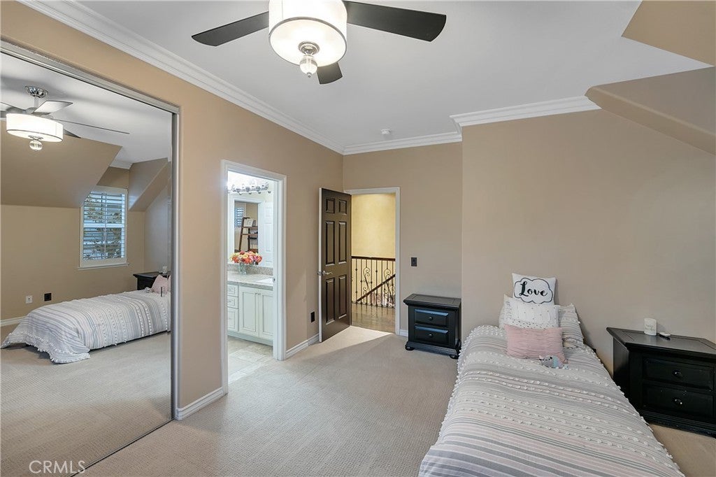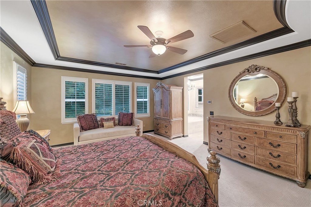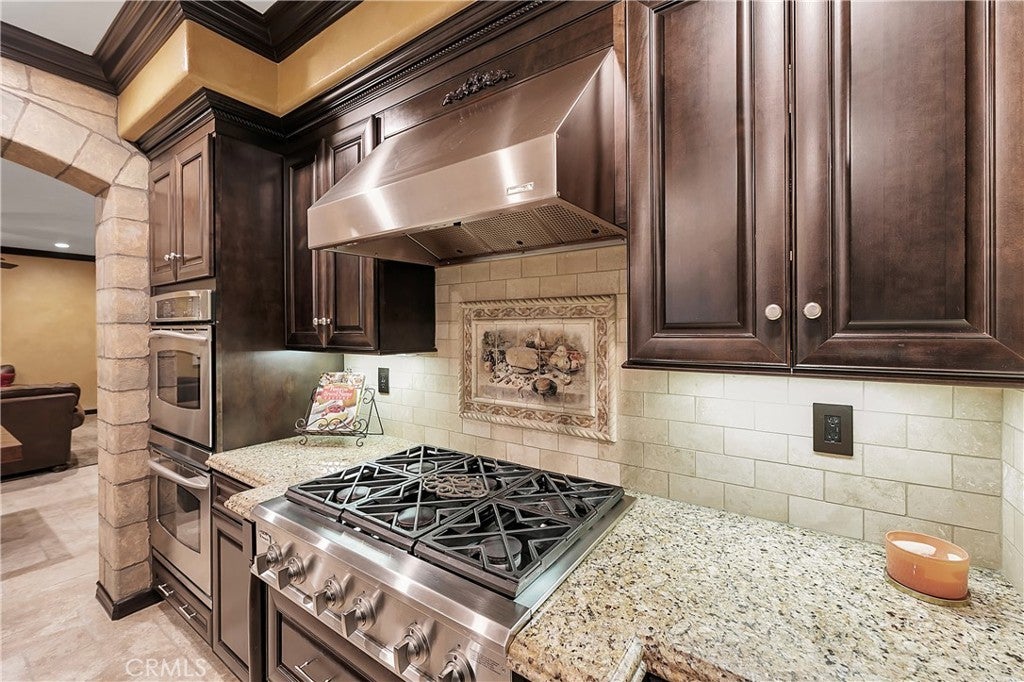 Welcome to this beautifully upgraded two-story home located in the highly sought-after Tesoro community. From the moment you enter, you’re greeted by a grand formal entry with mosaic tile flooring and an elegant formal living and dining area highlighted by Versailles travertine flooring and custom faux and Venetian plaster finishes. The stunning chef’s kitchen serves as the heart of the home, featuring granite countertops, Omega cabinetry, a double oven, and a 4-burner cooktop with griddle, all opening to a warm and inviting family room with a stone fireplace, crown molding, and designer accents throughout. Upstairs, the spacious primary suite offers dual crown molding, a comfortable sitting area, and a spa-inspired bathroom complete with separate vanities, a soaking tub, and a rain shower. Three additional upstairs bedrooms provide ample space, while a downstairs bedroom suite, thoughtfully converted from the third garage with its own private entrance from the front courtyard, offers flexibility for guests, multigenerational living, or a private office. Additional highlights include a beautifully upgraded downstairs bathroom with tiled shower and an upstairs laundry room with sink and folding station. Step outside to your own private resort-style backyard featuring a sparkling pool with Baja shelf and slide, a raised spa, covered patio with gas fireplace, built-in BBQ with granite counters, elevated seating deck, and a separate firepit area, perfect for entertaining or relaxing year-round. The meticulously landscaped grounds are enhanced with Malibu lighting, creating a warm and inviting evening ambiance. Completing the home is a private front courtyard, spacious driveway, and a two-car garage with generous storage. Enjoy access to Tesoro’s exceptional HOA amenities along with convenient proximity to award-winning schools, parks, shopping, and dining. This is a rare opportunity to own a truly exceptional home in one of Valencia’s most desirable communities!