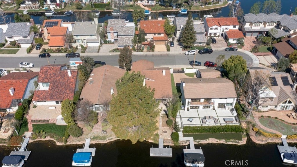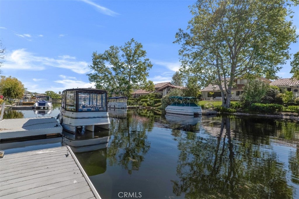 Set on a quiet cul-de-sac along the shores of iconic Westlake, this 4-bedroom, 2.5-bath two-story home captures the essence of the Westlake waterfront lifestyle with expansive patios, a private dock, and a floor plan designed to celebrate the lake at every turn. A tiled entry opens to a dramatic living room with soaring two-story vaulted ceilings, recessed lighting, warm wood-style flooring, decorative tile fireplace accents, and oversized glass sliders that frame the water and invite seamless indoor-outdoor living. Just beyond, a step-down terracotta tile firepit lounge with wet bar creates an unforgettable setting for entertaining against the backdrop of the lake. The kitchen offers wood cabinetry, tile counters, stainless appliances, tile flooring, a sunny breakfast nook, and its own slider to the patio, making everyday living feel like a retreat. Downstairs, the current office with built-in shelving and front yard access can easily serve once again as a bedroom, adding flexibility for guests, work-from-home needs, or multigenerational living. Upstairs, the landing overlooks the main living space and leads to 3 additional bedrooms. The spacious primary suite enjoys dual closets, an en-suite bath with dual sinks and tub/shower, plus a private lake-view deck for morning coffee or evening unwinding above the water. Secondary bedrooms are both good sized, one offers stunning vaulted ceilings and a private balcony, and share a ¾ Jack and Jill bath, offering character and versatility. Outside, the large rear patio is perfectly positioned to relax, dine, and soak in the energy of life on Westlake, complete with a kitchen pass-through, steps down the embankment, and direct access to your own dock for boating, paddling, or sunset cruises. With wood siding and stucco charm, direct-access 2-car garage, side patio, laundry hookups, and newer AC, this is a rare opportunity to enjoy one of Westlake’s most desirable settings, close to the neighborhood’s scenic beauty, lakeside recreation, and the vibrant dining, shopping, and lifestyle amenities that make Westlake Village so sought after. Don’t miss this chance for a dream lakefront lifestyle.