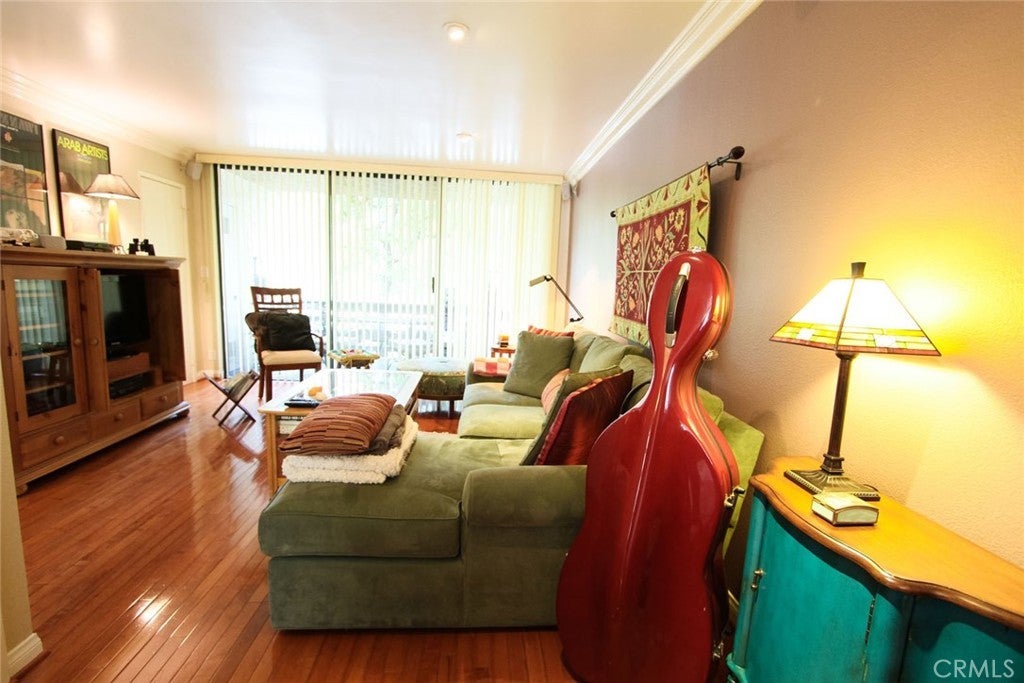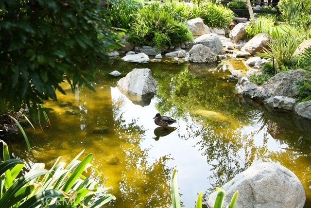 This is the most sought-after Plan A model in Warner Village, offering peaceful views of lush landscaping, koi ponds, and flowing waterfalls. This rare 3-bedroom, 3-bath corner unit combines privacy, space, and resort-style amenities in a highly walkable location. The open-concept layout is ideal for everyday living and entertaining, featuring an Italian marble entry, a formal living room with marble fireplace, and multiple outdoor spaces. The kitchen includes granite countertops, a breakfast bar, terrazzo gray slate flooring, and a new refrigerator, and it opens to a spacious family room and patio overlooking the park-like grounds. A formal dining area overlooks the living room below, adding light and dimension. Interior features include hardwood floors, crown molding, recessed lighting, vaulted ceilings, surround sound, fresh interior paint, mirrored closets, and tiled upstairs baths. With only one shared wall, the unit is exceptionally quiet and private. Outdoor living includes one balcony with sweeping treetop views and two patios, including a front patio that doubles as prime seating for summer Concerts in the Park. A bonus room with built-ins offers flexible space for a home office or storage. An attached two-car garage is included. Residents enjoy access to a private gated pool and spa, tennis courts, gym, and racquetball courts, all connected by scenic walking paths and wooden bridges. The property is within walking distance to The Village at Topanga, restaurants, and shopping.