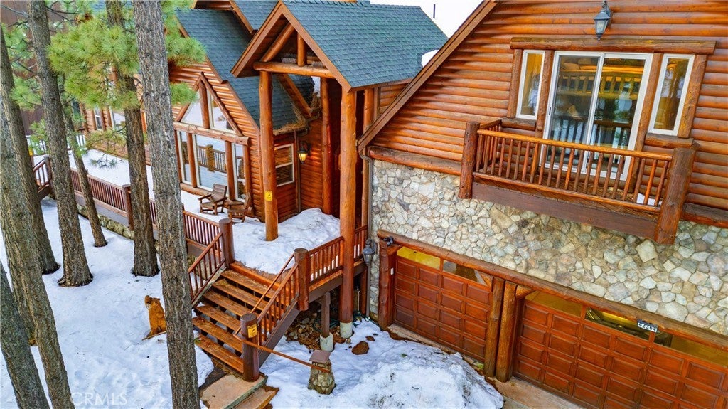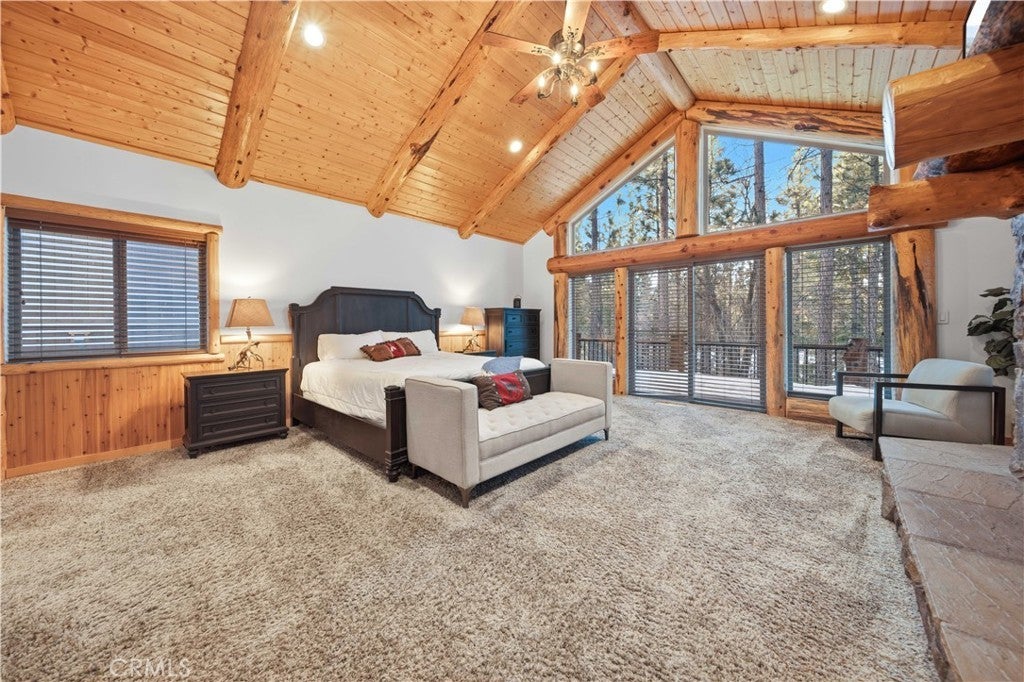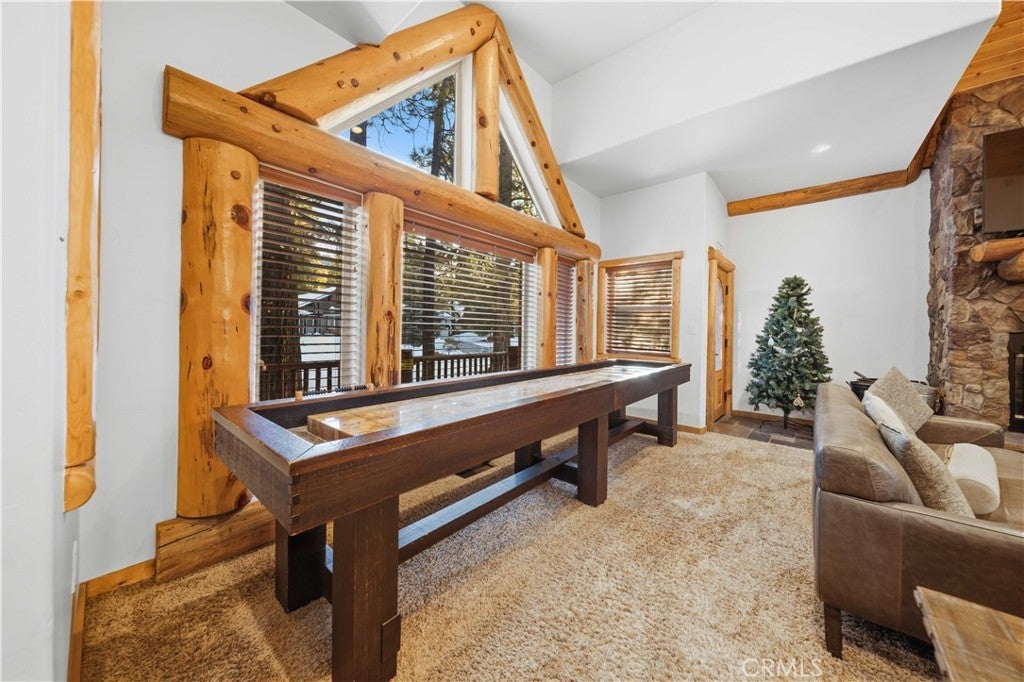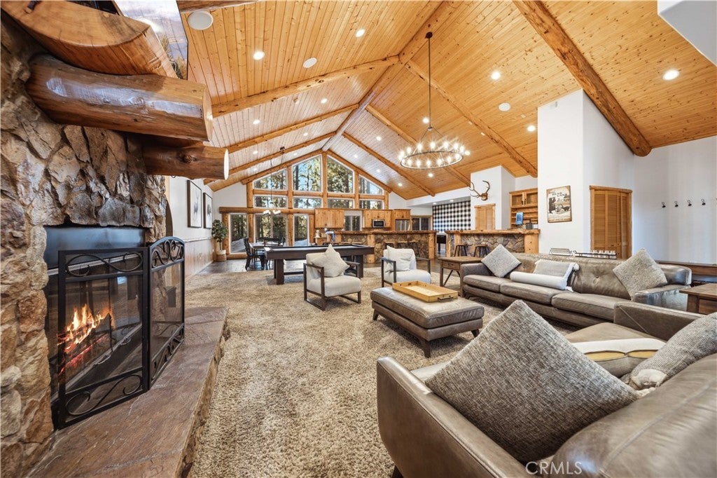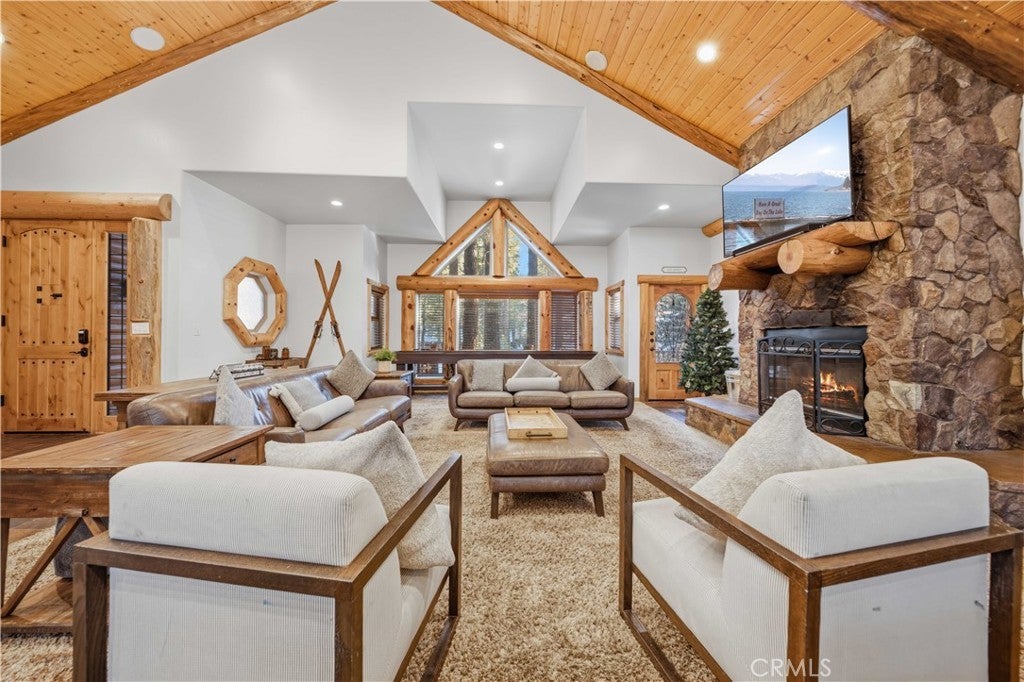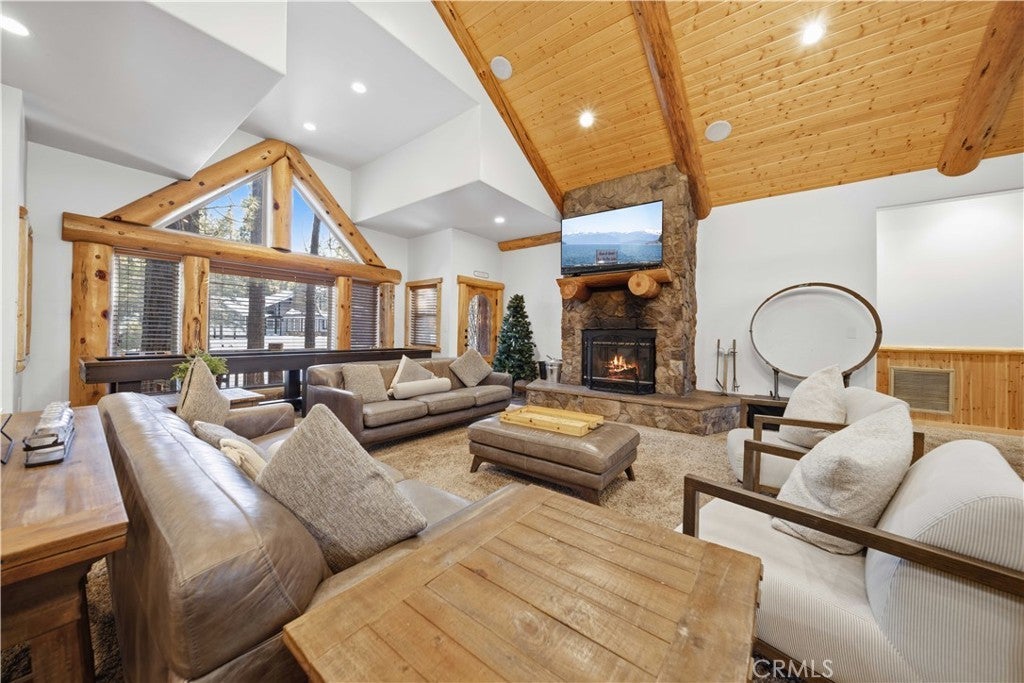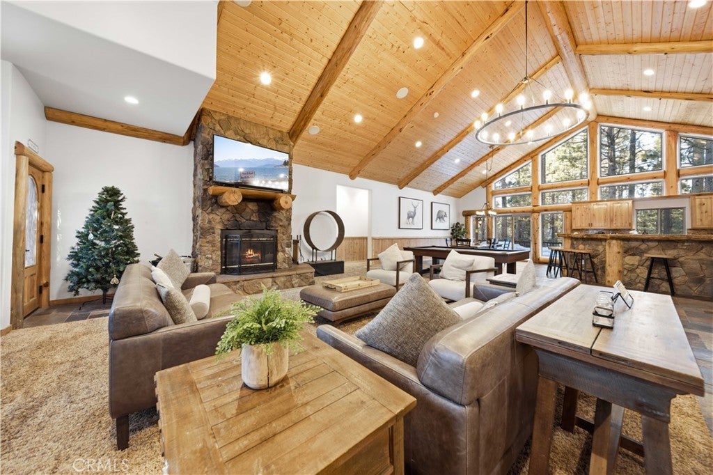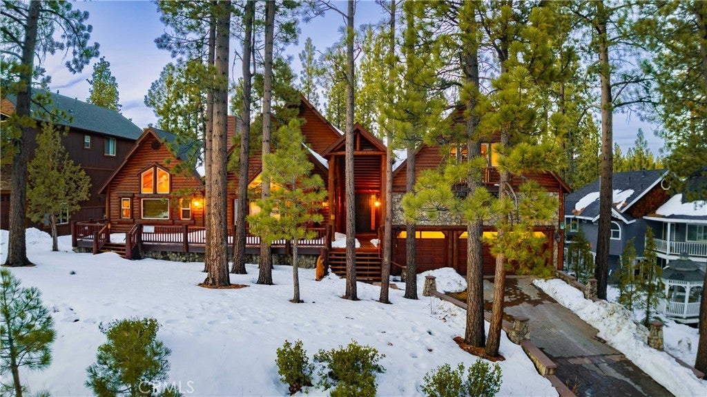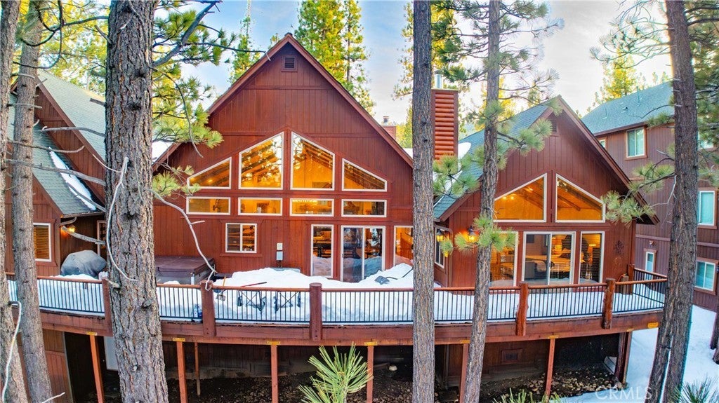 Stunning views from this one-of-a-kind log style home located in one of Big Bear Lake's most coveted areas. This home offers a prime position between both major ski resorts - Nestled in upscale Heavenly Valley Estates, the home sits just ~4-minute drive to Snow Summit and 5-minute drive to Bear Mountain. Few Big Bear locations offer this effortless access to both resorts in one stay. Quiet, private, forested luxury setting in an exclusive neighborhood - Heavenly Valley Estates features custom homes on large lots (this one: 0.35 acres) with sylvan privacy, mature trees, and underground utilities (no overhead power poles spoiling views). It delivers a peaceful upscale escape with photogenic, high-end curb appeal featuring a log-home style, expansive redwood deck with hot tub, and pristine mountain-forest backdrop. The open floorplan is perfect for entertaining and hosting, featuring a spacious living room with a fireplace that connects to the dining area, kitchen and bar. The entertainer's kitchen features a large center island with ample seating and extensive counter space. There are 4 bedroom and 3.5 bathrooms. Three of the bedrooms are luxurious suites, each with its own bathroom and closet. An additional bunk room is located above the garage. Outside you will find an expansive red wood deck where you can relax in the hot tub or entertain guests while enjoying the fresh mountain air. There is an attached 3 car garage with ample parking. This property is a highly sought after vacation rental with strong revenue history - The area (and this exact home when previously rented) supports large groups (sleeps 16 comfortably), 5-star reviews, and $90K+ annual gross in a high-demand pocket. Central-yet-quiet positioning drives better year-round occupancy than slope-distant or overly touristy zones, with easier management due to short drives for cleaners/owners. Guest-friendly logistics & parking - plus proximity to free Big Bear trolleys/shuttles to resorts and town. Guests rave about hassle-free arrivals/departures-unlike congested Village or lakefront areas with tight parking and traffic during peak seasons. This location combines the best of both worlds-world-class winter ski access + effortless summer lake/Village fun-in a serene, upscale pocket that supports premium pricing and high occupancy with lower "guest friction" than busier or more remote Big Bear spots. It's a turnkey performer for anyone targeting Southern California's ski-and-lake vacation market.