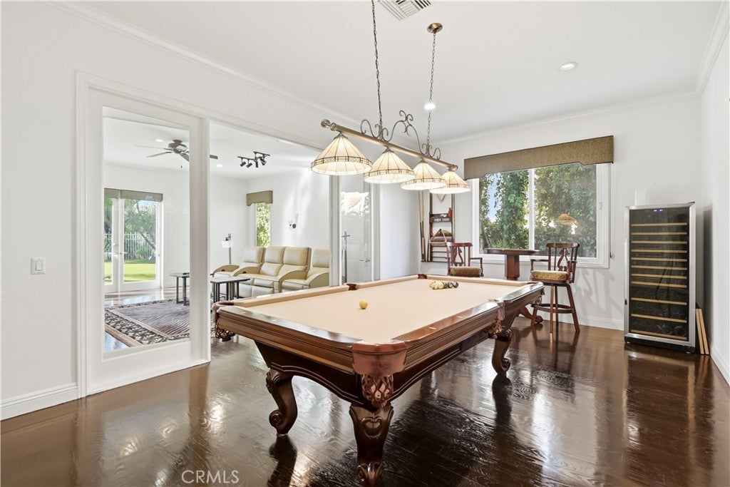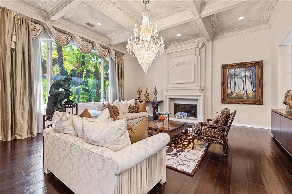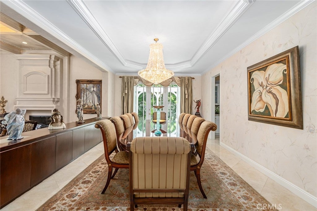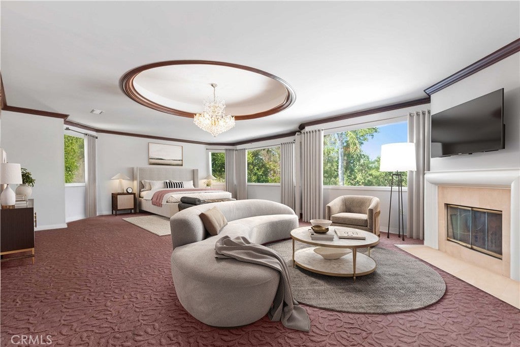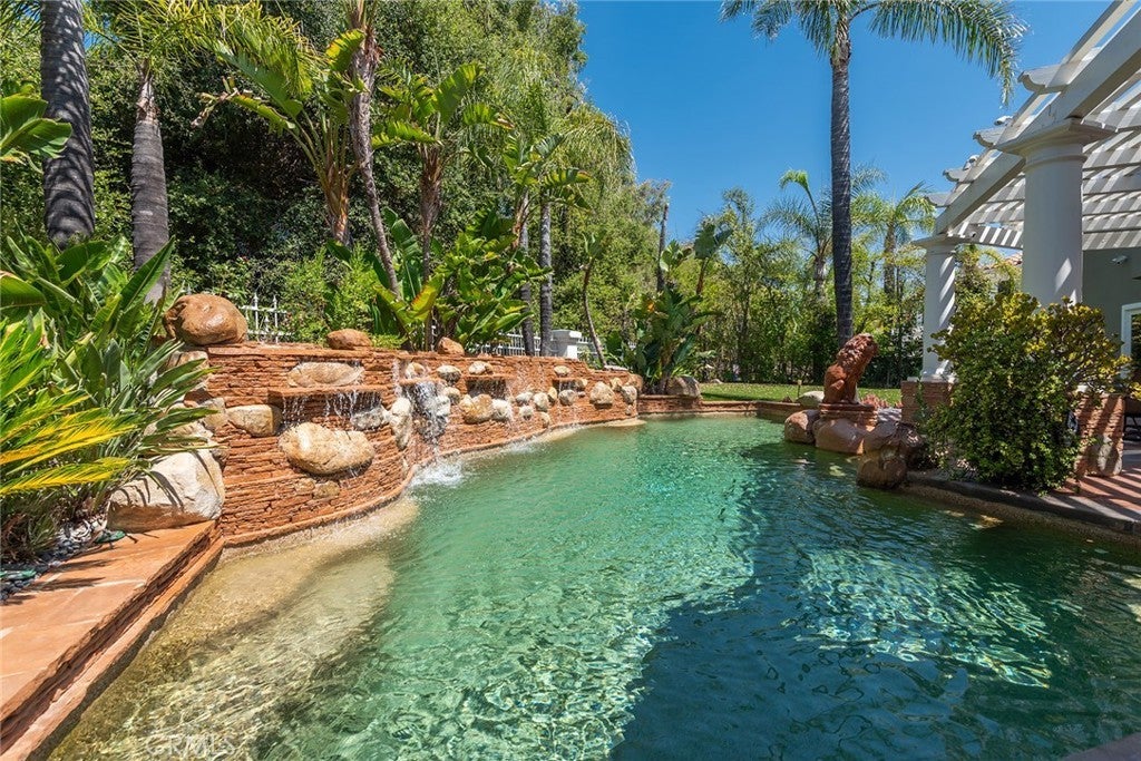 Located in the prestigious guard-gated community of Mountain View Estates this customized and expanded Plan 7 offers 6868 sq. ft. of refined living space with 6 en-suite bedrooms, including 2 primary suites, plus a 4-car garage. En-suite bedrooms 5 and 6 are currently used as a home theater and a large game room, providing excellent flexibility for modern living. Set on a single-loaded cul-de-sac, the home features beautiful curb appeal and meticulous maintenance. A dramatic 2 story foyer showcases a sweeping wrought-iron staircase, marble floors, & a Murano glass chandelier. The spacious family room includes custom built-ins, hardwood floors, a wet bar, and a fireplace, opening to the expansive kitchen with grand dining area, walk-in pantry, large center island, & butler's pantry. The elegant formal dining room offers French doors to a charming side yard, a crystal chandelier, and built-in buffet cabinetry. The formal living room features coffered ceilings, hardwood floors, a fireplace, & another crystal chandelier. The main primary suite boasts a fireplace, 2 oversized walk-in closets, a spa style bathroom with dual vanities, spa tub & separate shower. The second primary suite includes 2 closets and a bathroom. Two additional en-suite bedrooms complete the upper level. The backyard is a private tropical oasis with lush landscaping, a beach entry saltwater pool, stacked stone & rock waterfalls, & a separate spa. A built-in BBQ, covered patio, & artificial lawn create in ideal setting for entertaining or relaxing. Additional features include a 4 zone heating & air, low maintenance artificial grass, water softner, & a Tesla Virtual Power Plant providing backup power for up to 82 hours. Located in the award winning Las Virgenes School District, near restaurants, shopping & a short drive to Malibu beaches.