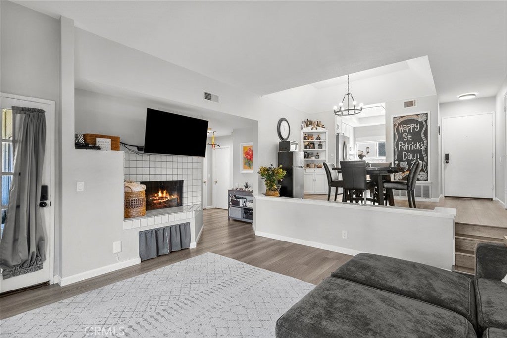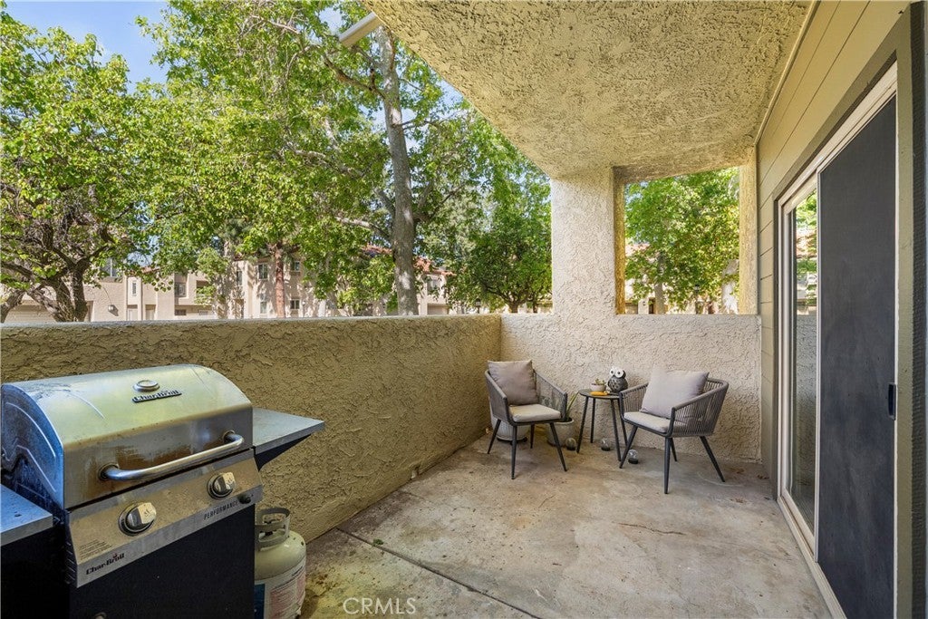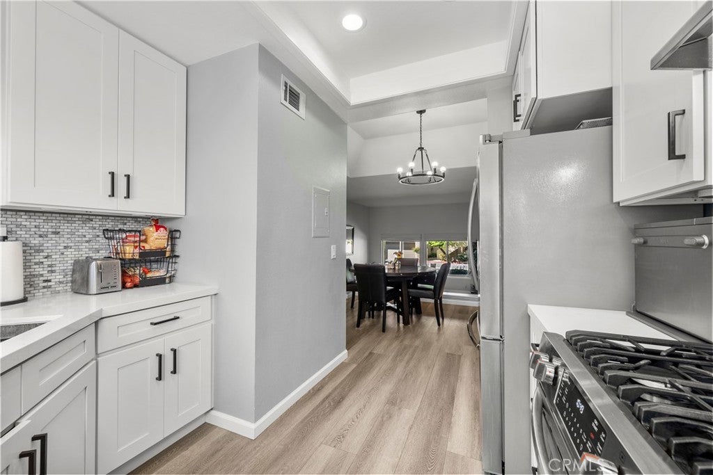 Welcome home to this charming, turnkey 2-bedroom lower-level condo offering style, comfort, and convenience in one beautifully upgraded package. From the moment you step inside, you’ll appreciate the light-filled, open layout featuring soaring ceilings, fresh paint, and upgraded luxury vinyl flooring that create a warm and inviting atmosphere. The remodeled kitchen is designed to impress with newer stone countertops, white custom cabinetry, stainless steel appliances, a farmhouse sink with upgraded faucet, and a designer tile backsplash—perfectly blending modern finishes with everyday functionality. The kitchen flows seamlessly into the open dining area and spacious living room, where a cozy fireplace creates the ideal setting for relaxing or entertaining. Large windows fill the home with natural light, private patio off the living room, creating a perfect indoor-outdoor living space. The oversized bedrooms offer exceptional comfort, including a generous primary suite with direct patio access. The beautifully upgraded bathroom features dual sinks, granite countertops, custom white cabinetry, designer tile flooring, and a separate tub and shower area with custom tile surround, delivering both style and practicality. Additional highlights include indoor laundry area, dual-pane windows, one garage parking space plus one assigned parking space, and access to outstanding community amenities including a pool, spa, tennis courts, parks, and optional RV storage. Ideally located close to dining, shopping, schools, and recreation, this move-in-ready home offers an unbeatable combination of upgrades and location. Hurry—homes like this don’t last long!