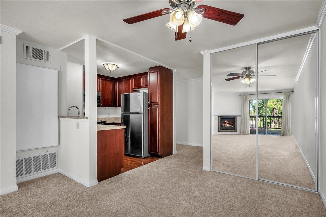 Welcome to resort-style living at The Met in Woodland Hills, a premier 24-hour guard-gated, amenity-filled community in the heart of Warner Center. This rare larger 1-bedroom, 1-bath corner unit (690 sq ft) is ideally located on the 2nd floor with no unit above, offering extra privacy and peaceful surroundings. A unique feature of this floor plan is the long entry foyer—unlike many units—providing a welcoming sense of arrival and a comfortable separation between the front door and the main living spaces. Enjoy beautiful tree, mountain, and sky views from the private balcony. The light-filled interior features new carpet throughout, fresh interior paint, a cozy fireplace, granite countertops, and a new HVAC system (installed within the past year). The home also offers excellent storage, including two large closets in the bedroom, an additional closet off the dining area, abundant kitchen cabinetry, and extra storage in the balcony closet. This desirable location within the building is close to both the elevator and stairs for added convenience. The unit includes two assigned parking spaces and there is ample guest parking nearby. Perfectly situated within the community, the building is directly across from many of The Met’s top amenities, including the large resort-style pool, 6 lighted tennis courts, indoor basketball and racquetball courts, a state-of-the-art fitness center, and sauna. There are three additional pools throughout the community, including one located right next to this building with its own jacuzzi. Residents also enjoy Food Truck Fridays by the pool during the summer, beautifully maintained grounds, a children’s play area, pet-friendly environments, an on-site HOA office, and the peace of mind of 24-hour security. Located just minutes from The Village, Costco, Topanga Plaza, Whole Foods, Ventura Blvd., and the 101 Freeway, and close to the future Rams Village at Warner Center, which will feature the Los Angeles Rams practice facility along with new retail, dining, and entertainment. A fantastic opportunity to own in one of Woodland Hills’ most desirable resort-style communities.