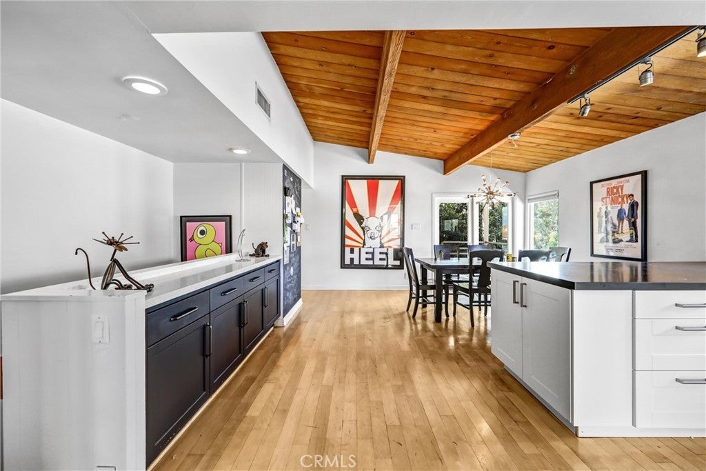 Beamed Ceilings, Breakfast Bar, Balcony, Breakfast Area, Ceiling Fan(s), Eat-in Kitchen, High Ceilings, Living Room Deck Attached, Pantry, Quartz Counters, Recessed Lighting, Storage, Bedroom on Main Level, Main Level Primary, Primary Suite, Walk-In Closet(s), Track Lighting, Unfurnished, Wired for Data