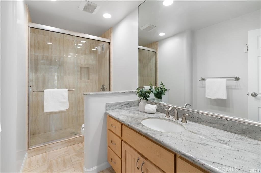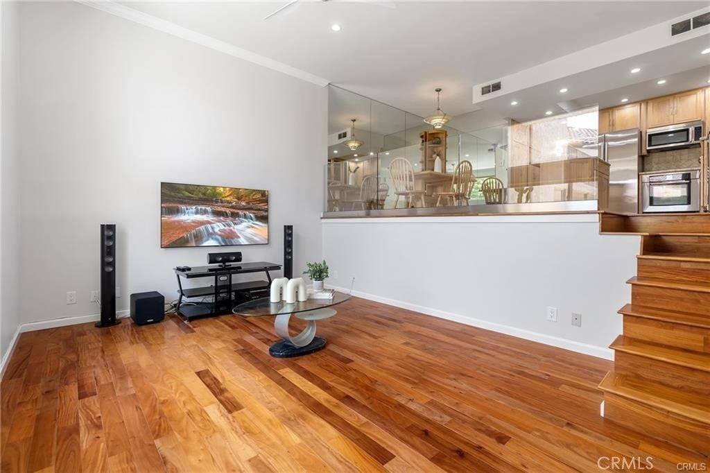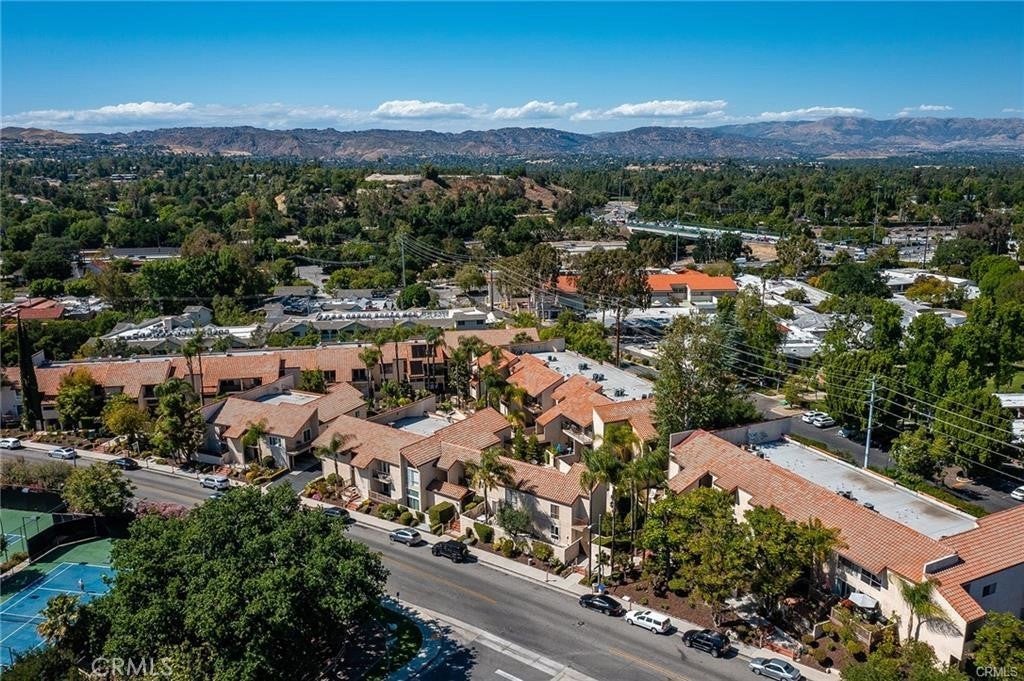 Beautifully maintained and partially furnished 2-bedroom, 2-bath condominium located in the heart of Calabasas. This light-filled home features an open floor plan with soaring ceilings, recessed lighting, and stylish glass railings overlooking the kitchen and dining area. The updated kitchen includes granite countertops, center island with bar seating, ample cabinetry, and Bosch appliances. The spacious primary suite offers wall-to-wall mirrored closets and an updated en-suite bathroom with a large walk-in shower. The secondary bedroom is generously sized with a private balcony. Additional highlights include wood flooring, dual-pane windows, ceiling fans, and in-unit washer hookups. Private gated front patio with landscaping and bistro seating creates a charming outdoor retreat. Shared garage includes two tandem parking spaces, private storage unit, and EV charger outlet. Community amenities include a heated pool and spa, with laundry facilities nearby. Prime location directly across from Calabasas Lake and close to the Calabasas Swim and Tennis Club, The Commons, Old Town Calabasas, farmers market, shopping, dining, and top-rated Las Virgenes schools.