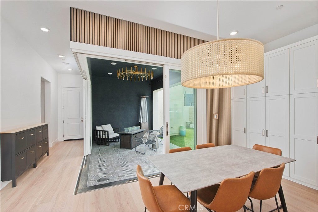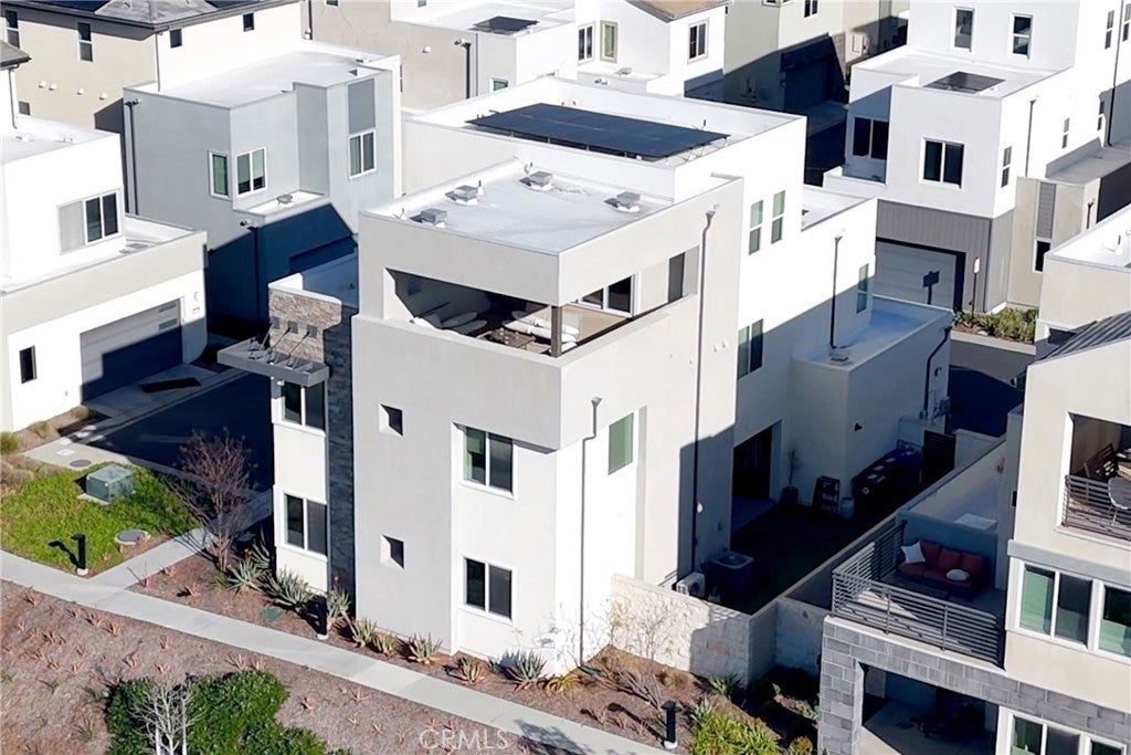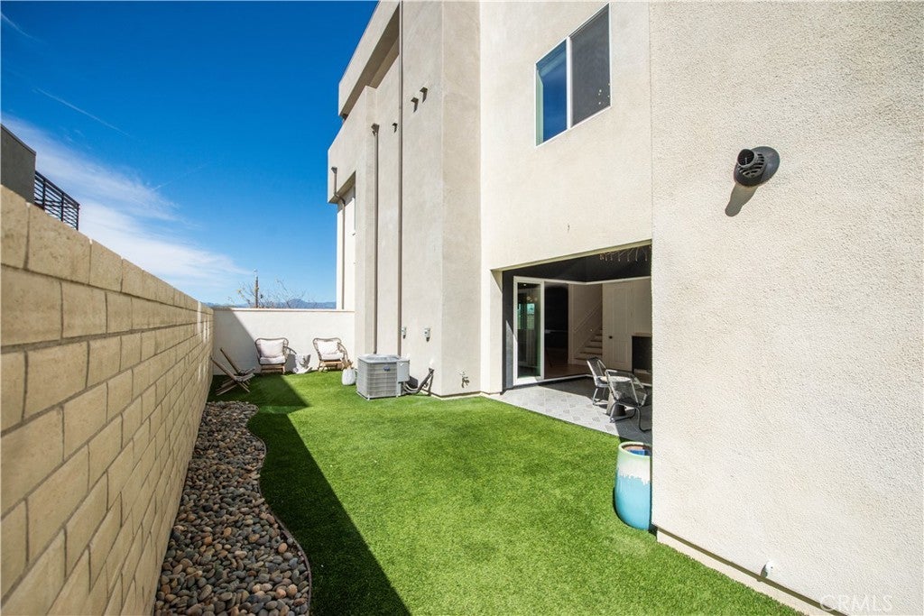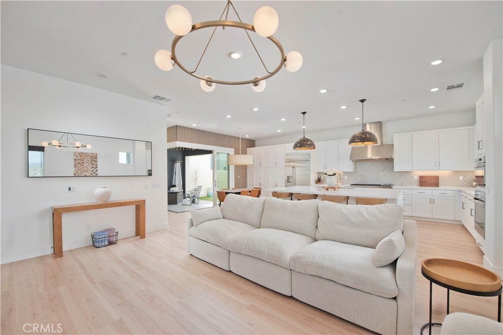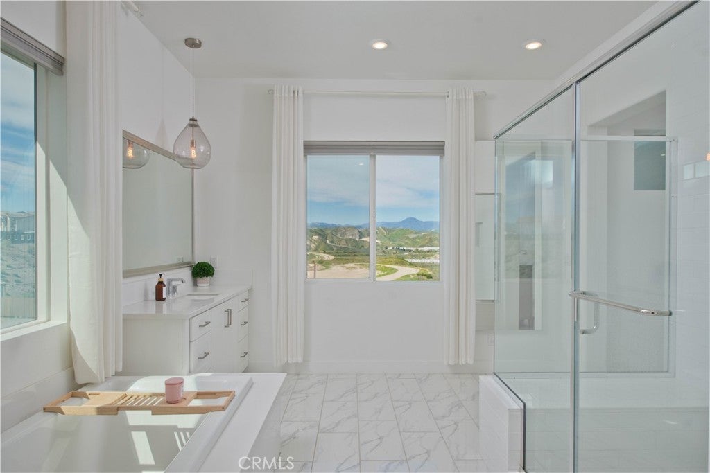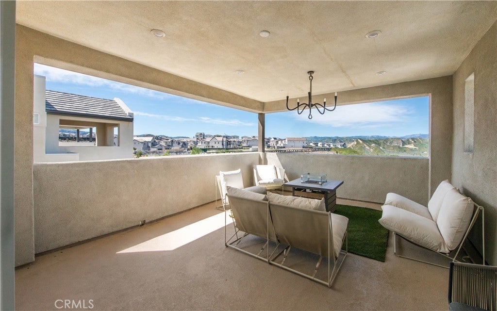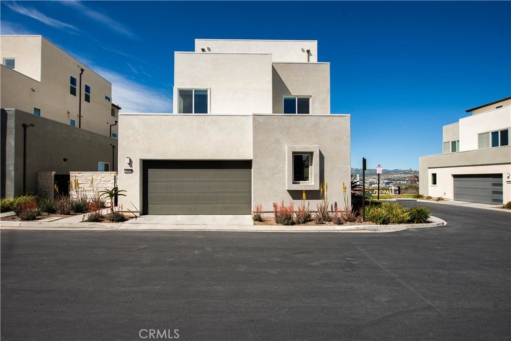 Welcome to this stunning modern detached home in the Rosemist community of FivePoint Valencia. Situated on a prime corner lot, this expansive 5-bedroom, 4.5-bathroom, three-story residence offers over 3,300 square feet of thoughtfully designed living space with scenic mountain views. Upon entry, you’re greeted by a bright open-concept floor plan featuring sleek laminate flooring throughout and stylish designer light fixtures that create a clean, contemporary feel. The gourmet kitchen features a large center island with bar seating, sleek upgraded countertops with a herringbone backsplash, abundant storage, and stainless steel appliances including a professional-grade 6-burner cooktop with griddle, range hood, and built-in refrigerator. The kitchen opens to the living and dining areas, perfect for both everyday living and entertaining. The first level includes a convenient bedroom and full bathroom with updated fixtures and a Mid-Century modern vanity, ideal for guests or multi-generational living. On the second level, the spacious primary suite offers two closets including a walk-in closet, and an en-suite bathroom with dual vanities and a separate shower and bathtub. The second floor also features three additional bedrooms, including one with its own en-suite bathroom, another full bath, and a laundry room with plenty of storage. The third floor features an expansive bonus room complete with a connecting dry bar and powder room, offering a versatile space ideal for a home office, gym, or media room. Sliding doors open to a covered deck with sweeping mountain views. Designed for indoor-outdoor living, expansive corner sliding doors open to the California Room, seamlessly connecting to the backyard with low-maintenance artificial turf. Additional highlights include an attached 2-car garage with extra storage, direct home access, and two EV chargers, plus solar panels and a backup battery system. Enjoy the community’s impressive recreation areas. Just across the way is Confluence Park, an HOA recreational area featuring swimming pools, a spa and splash zone, lounge areas, a clubhouse, a park, and more. In addition, the community offers a community garden, pump track, and miles of scenic trails for residents to enjoy. Conveniently located minutes from Valencia Town Center, Six Flags Magic Mountain, shopping, dining, parks, and hiking and biking trails, with easy freeway access.