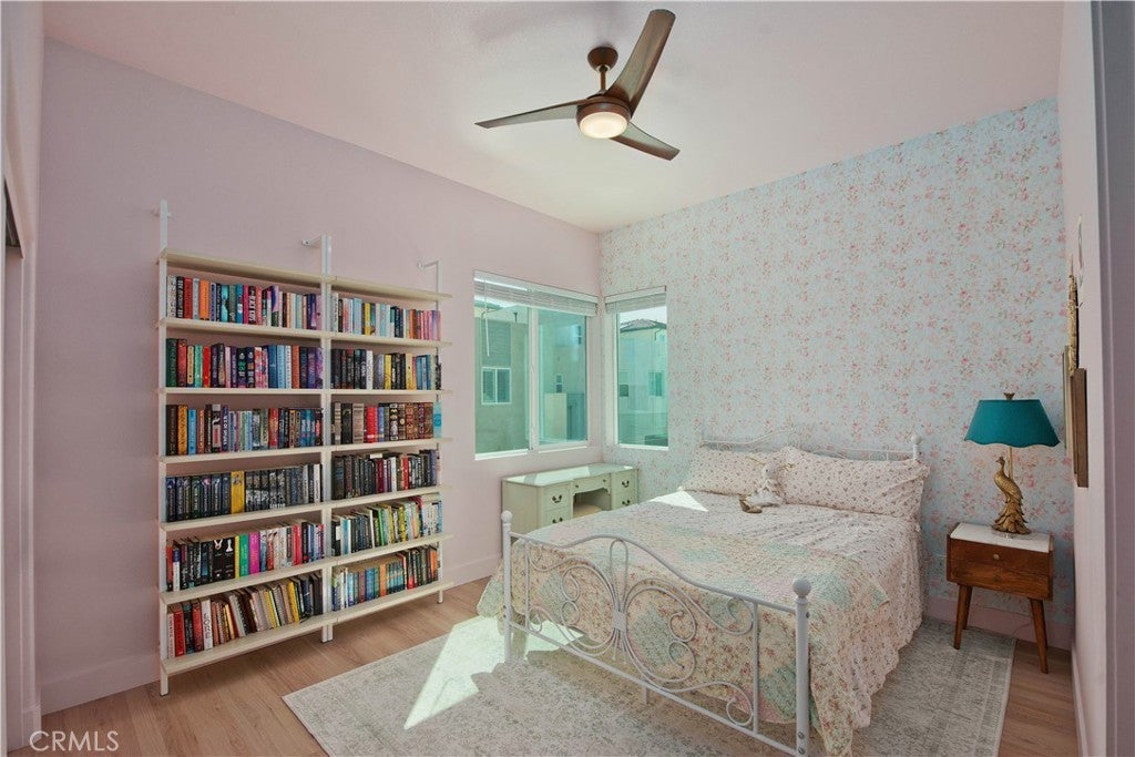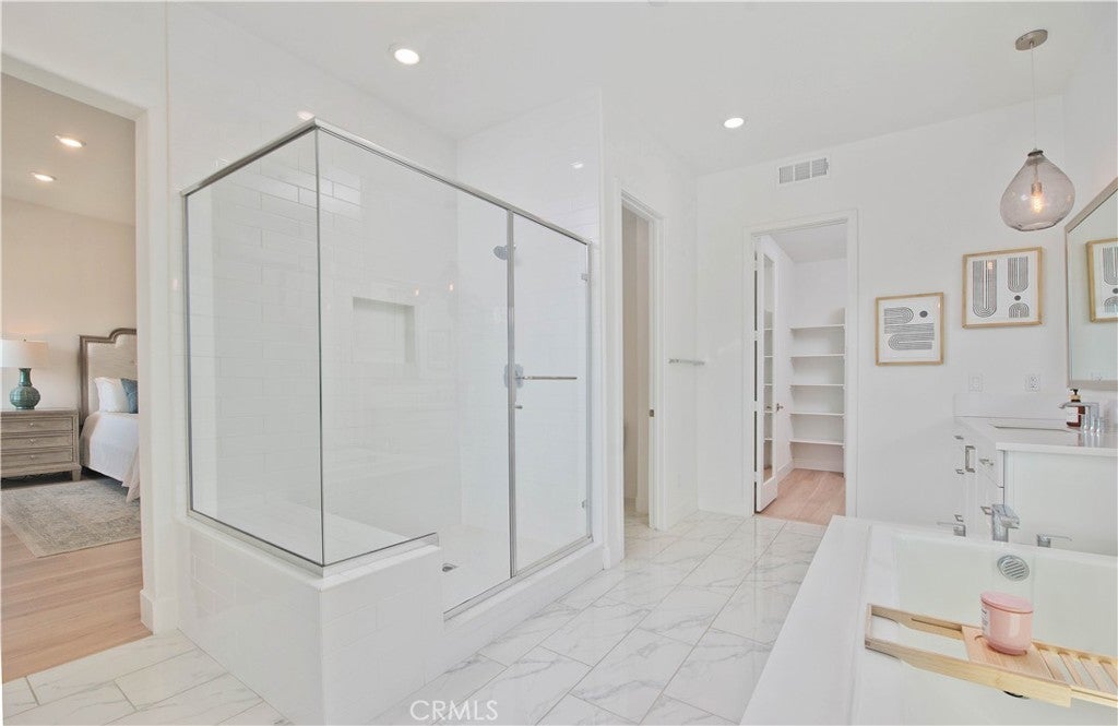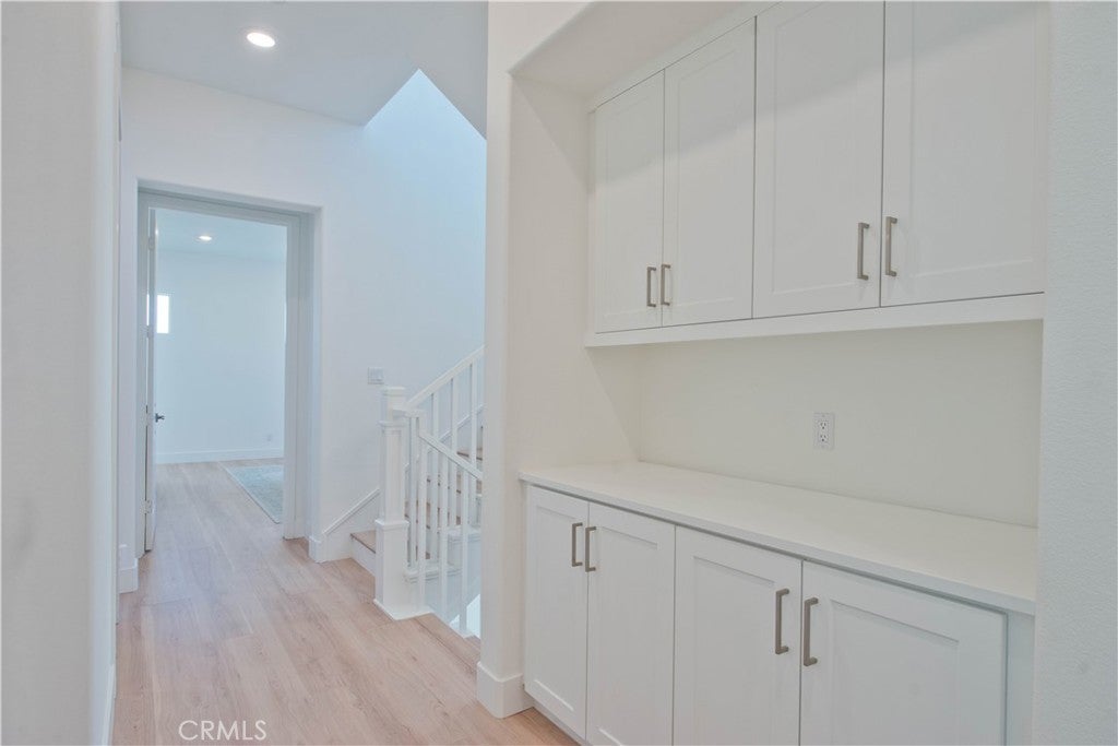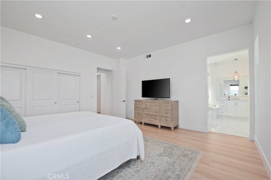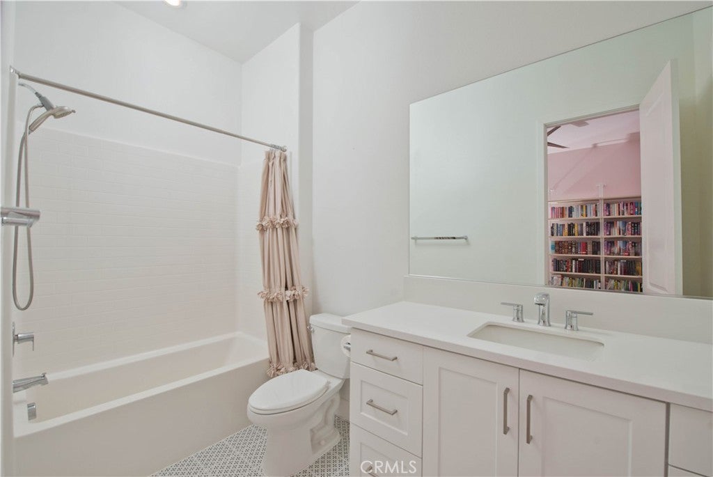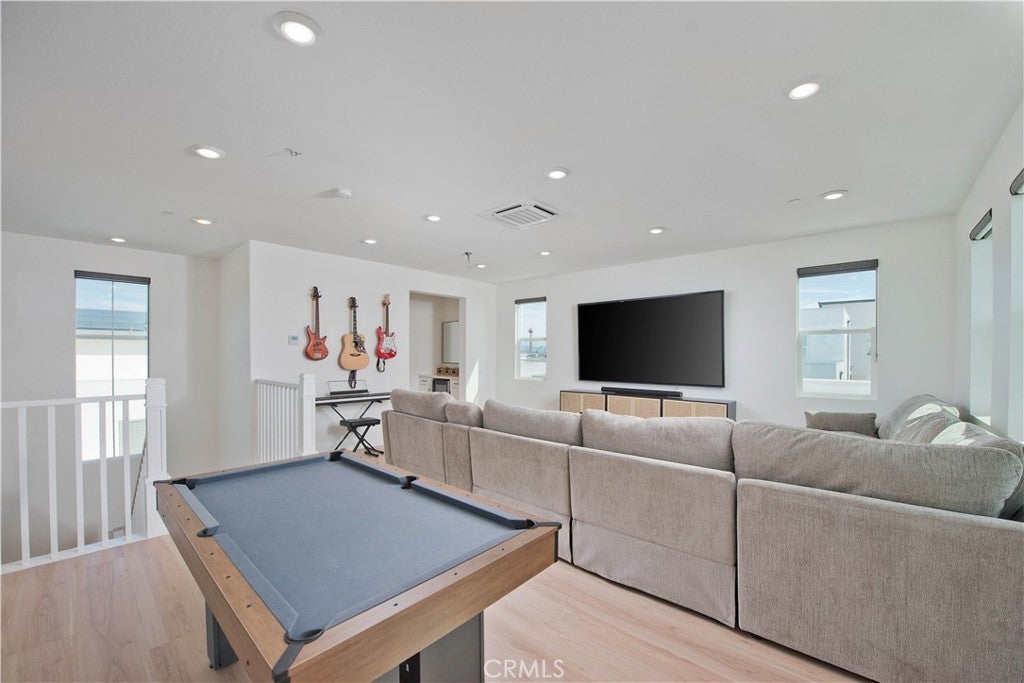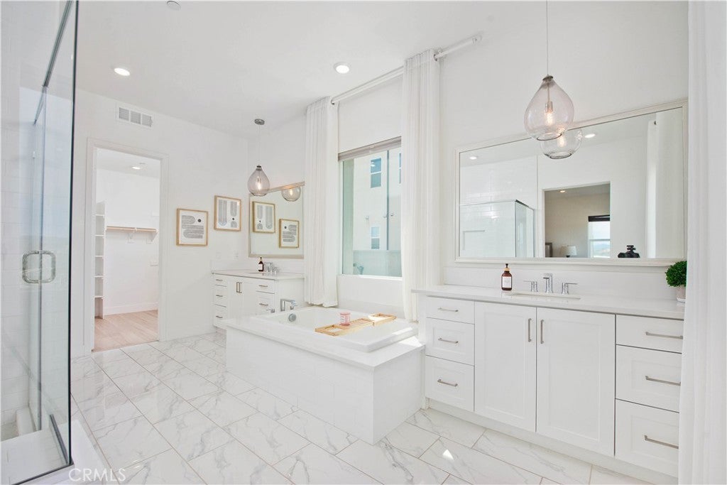 Welcome to this stunning modern detached home in the Rosemist community of FivePoint Valencia. Situated on a prime corner lot, this expansive 5-bedroom, 4.5-bathroom, three-story residence offers over 3,300 square feet of thoughtfully designed living space with scenic mountain views. Upon entry, you’re greeted by a bright open-concept floor plan featuring sleek laminate flooring throughout and stylish designer light fixtures that create a clean, contemporary feel. The gourmet kitchen features a large center island with bar seating, sleek upgraded countertops with a herringbone backsplash, abundant storage, and stainless steel appliances including a professional-grade 6-burner cooktop with griddle, range hood, and built-in refrigerator. The kitchen opens to the living and dining areas, perfect for both everyday living and entertaining. The first level includes a convenient bedroom and full bathroom with updated fixtures and a Mid-Century modern vanity, ideal for guests or multi-generational living. On the second level, the spacious primary suite offers two closets including a walk-in closet, and an en-suite bathroom with dual vanities and a separate shower and bathtub. The second floor also features three additional bedrooms, including one with its own en-suite bathroom, another full bath, and a laundry room with plenty of storage. The third floor features an expansive bonus room complete with a connecting dry bar and powder room, offering a versatile space ideal for a home office, gym, or media room. Sliding doors open to a covered deck with sweeping mountain views. Designed for indoor-outdoor living, expansive corner sliding doors open to the California Room, seamlessly connecting to the backyard with low-maintenance artificial turf. Additional highlights include an attached 2-car garage with extra storage, direct home access, and two EV chargers, plus solar panels and a backup battery system. Enjoy the community’s impressive recreation areas. Just across the way is Confluence Park, an HOA recreational area featuring swimming pools, a spa and splash zone, lounge areas, a clubhouse, a park, and more. In addition, the community offers a community garden, pump track, and miles of scenic trails for residents to enjoy. Conveniently located minutes from Valencia Town Center, Six Flags Magic Mountain, shopping, dining, parks, and hiking and biking trails, with easy freeway access.