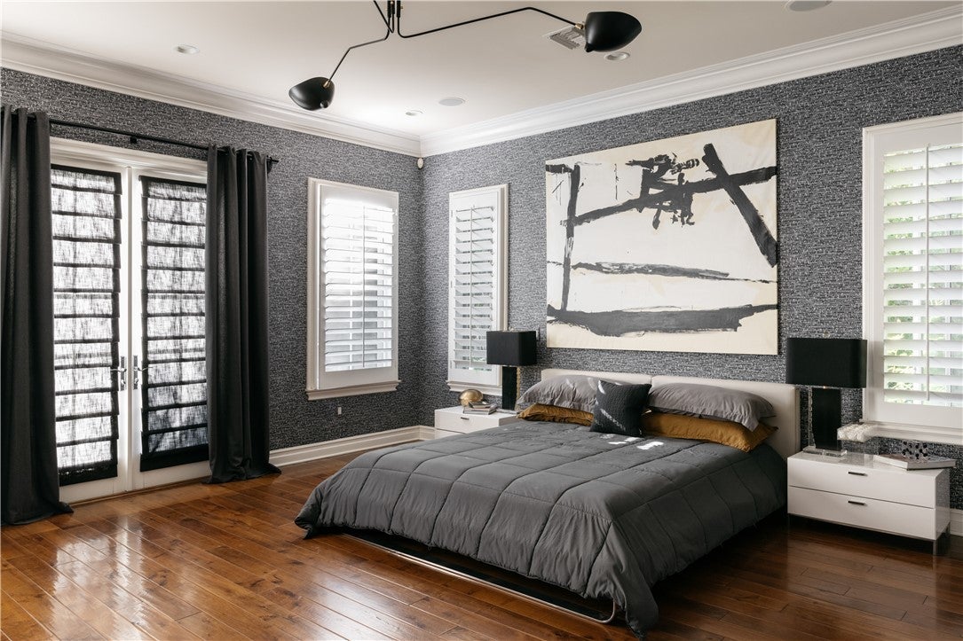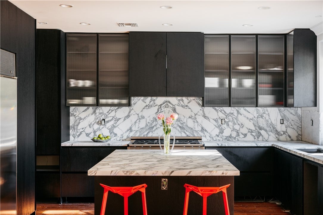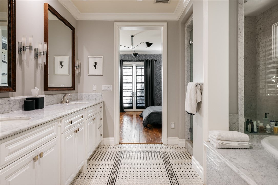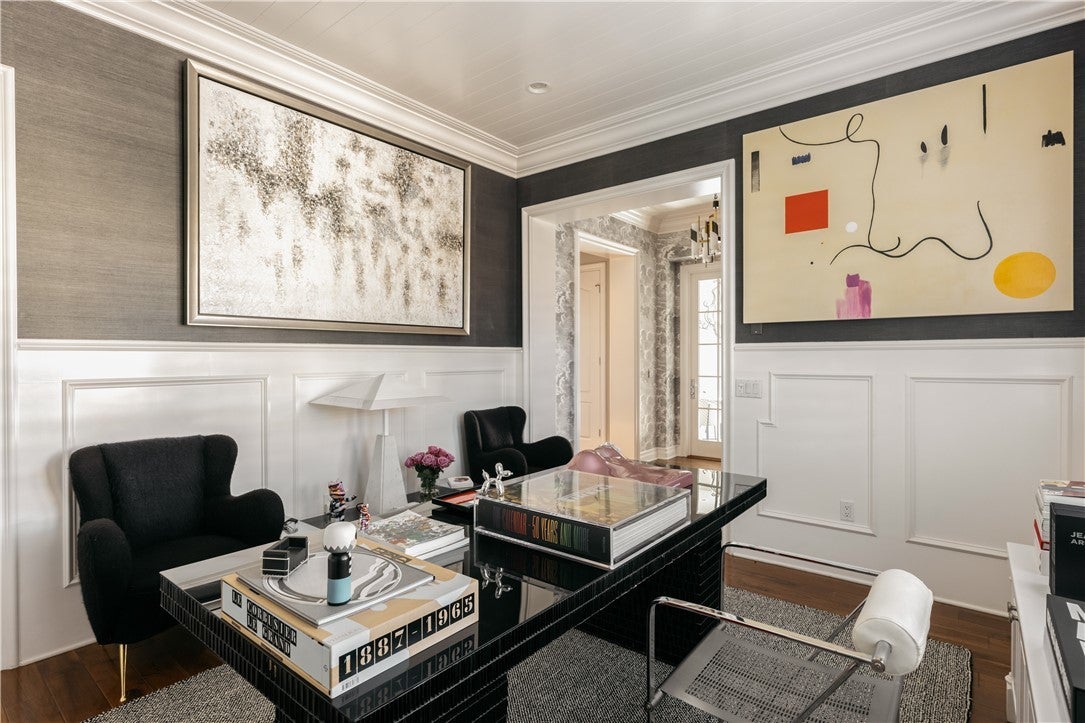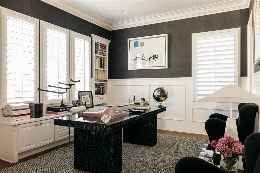 This beautiful, designer home situated in the prestigious, guard-gated, Oaks of Calabasas, has 3 bed 4 bath and an office (could be a 4th bedroom). This masterpiece is elegantly appointed throughout with finishes of the highest quality. The open floor plan design merges sophistication meeting functionality. Enter into a meticulously designed foyer w/office/library and powder room leading to the formal living and dining room with bespoke accent wallpaper, wood floors and high ceilings, intricate moulding and attention to details. Anchored by a central courtyard with a fireplace, outdoor dining, and seating area, natural light bathes the surrounding living spaces. The stunning gourmet kitchen showcases an over-sized working island and marble back-splash accenting the custom textured-glass-front black cabinetry and high-end stainless appliances. A breakfast nook and lavish family room is lined with picture windows and French doors opening into the backyard oasis. The ground floor primary room features a fireplace, spa tub, steam shower, and a customized walk-in closet with led lighting. Two additional en-suite bedrooms and a media/kids area complete the upper level. The landscaped grounds, reminiscent of an artist's garden, create privacy and serenity amongst the open seating, outdoor BBQ/kitchenette, and the resort style pool and spa. Located in the Highly rated Las Virgenes School District and minutes from the Calabasas Commons for shopping, dining, and entertainment.