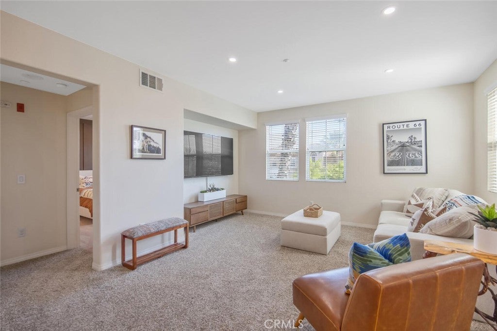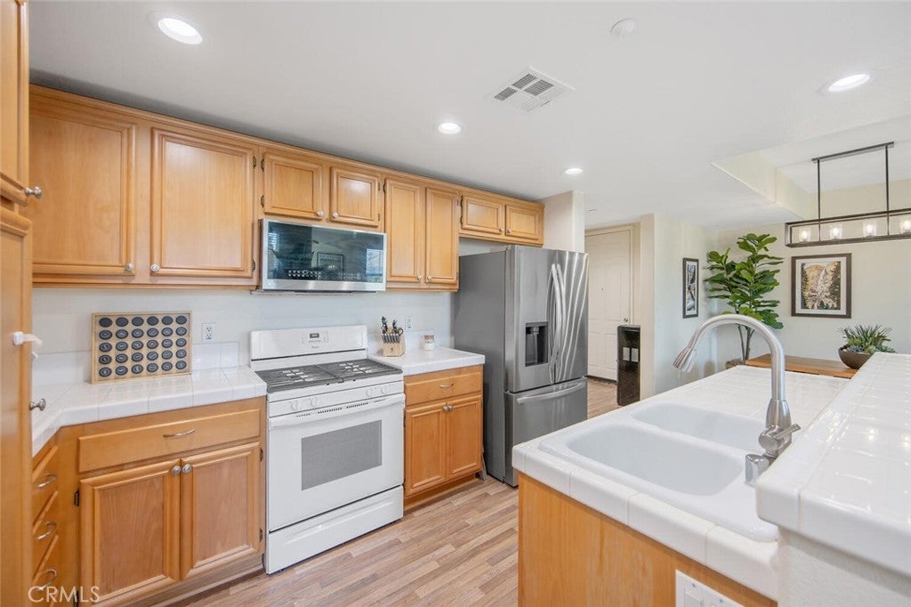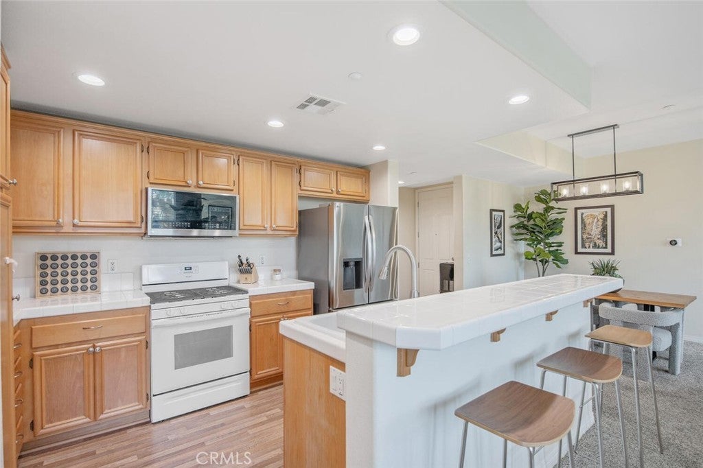 Welcome to Village at the Park's peaceful, relaxing, and carefree lifestyle! Enjoy resort-style living with nearby amenities including pool, spa, clubhouse, gym/exercise room, BBQ area, playground, a convenient little on-site neighborhood market, and the nearby miles-long Calleguas Creek Bike Path! This light and bright 3rd floor corner penthouse is all one level, with one shared wall and nobody above. There are 10 ft ceilings and dual-pane south and east-facing windows, all with mountain/greenery/treetop views. The modern floor plan features a spacious open concept living room, dining area, and kitchen with a large island. There is a private living room balcony, so you can sit outside in the morning sunshine with your tea or coffee or de-stress in the shade at the end of the day. When you enter, you'll pass by a half bathroom and laundry room with plenty of storage, just inside the entry. Continuing through the open living room/kitchen/dining area, to your left is the primary en-suite bedroom with a dual-sink bathroom, and a large walk-in closet. On the other side of the living room, to your right, are 2 additional bedrooms, separated by a full bathroom. One bedroom is currently used as an in-home office (connected fiber optic fast internet), and the other as a yoga/guest room. Also included are 2 single-car garages, offering abundant storage and secured parking for your vehicles. Brookshire HOA maintains the beautifully landscaped common areas, and the HOA fee covers water/sewer, trash, pest control, and exterior window washing, giving you a low-maintenance and worry-free lifestyle. Situated near dining, shopping, parks and with nearby freeway access, this is a rare opportunity for a stylish resort-style living experience. Come and see this exceptional, gorgeous condo, just waiting for you to move in!