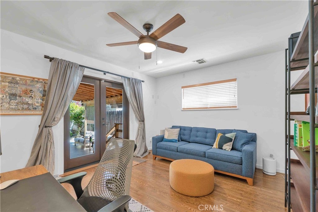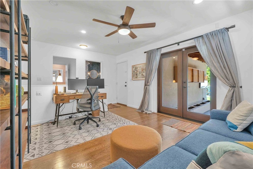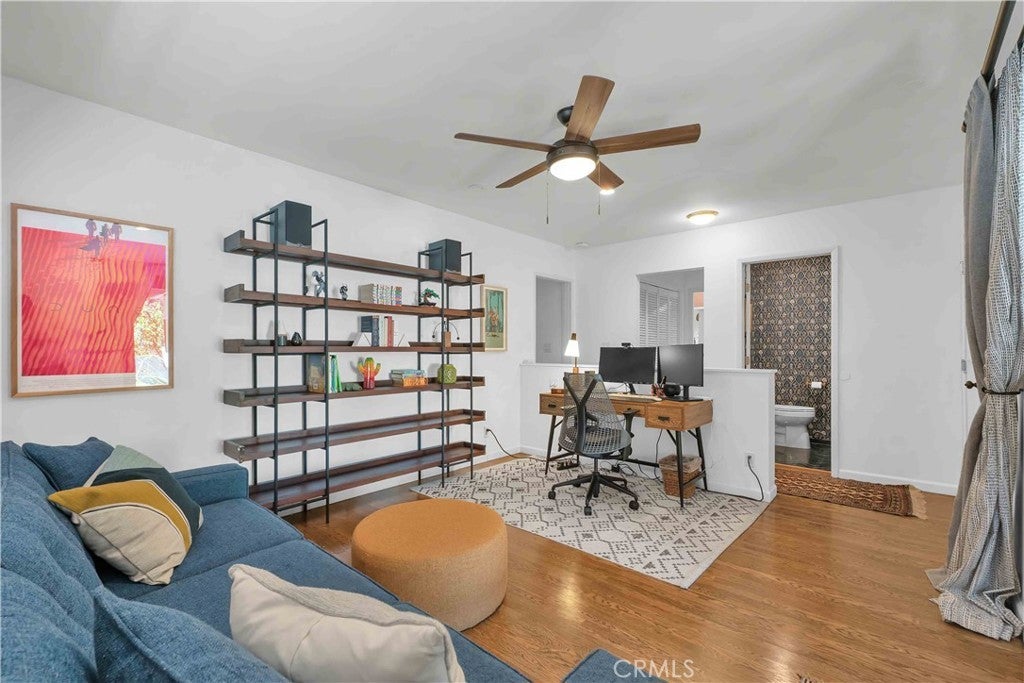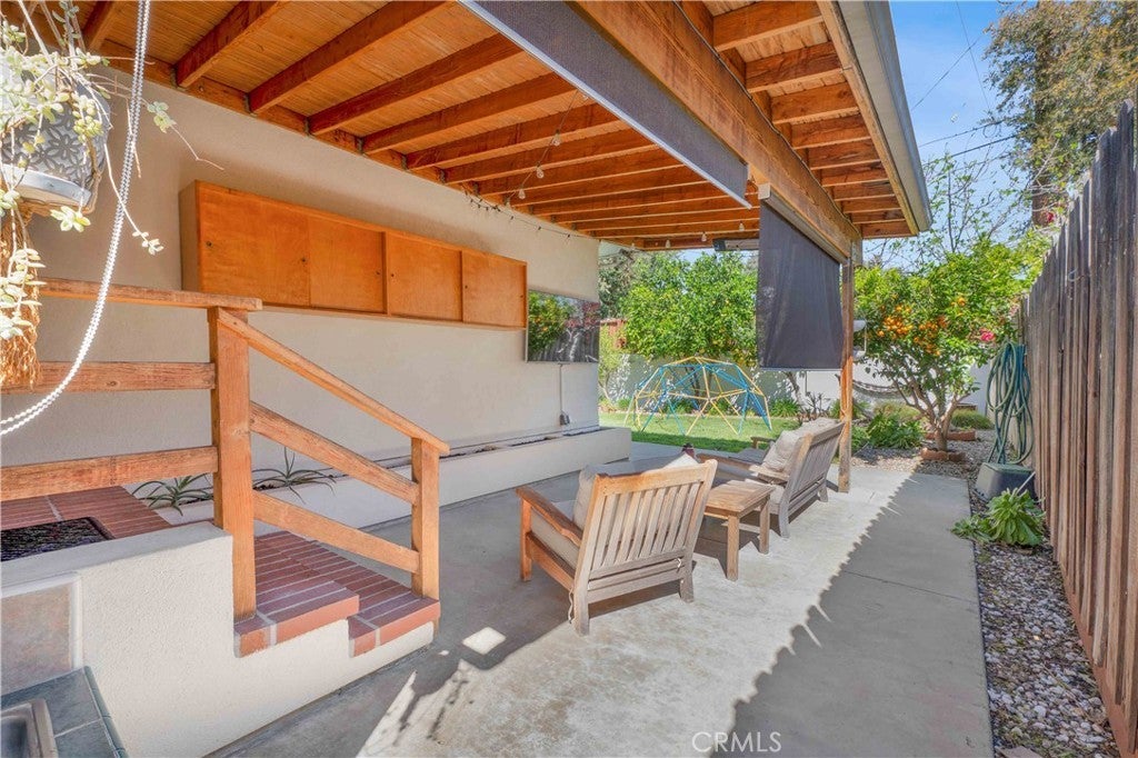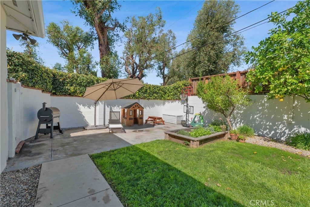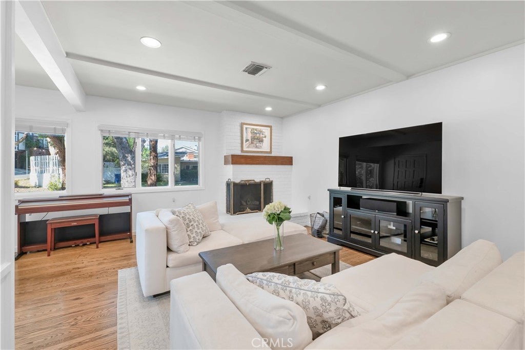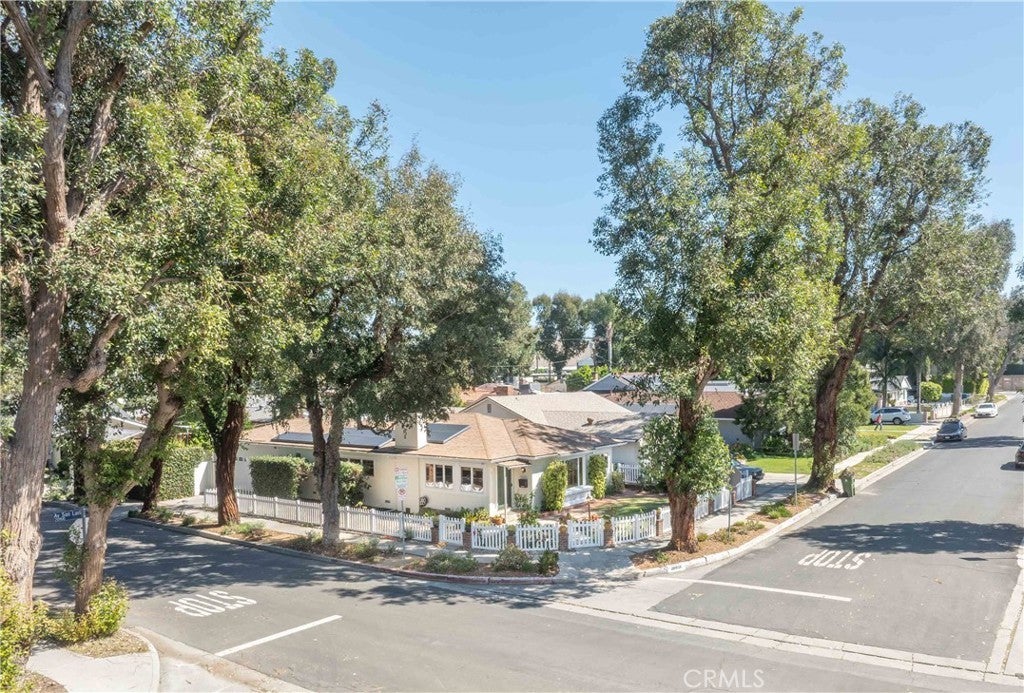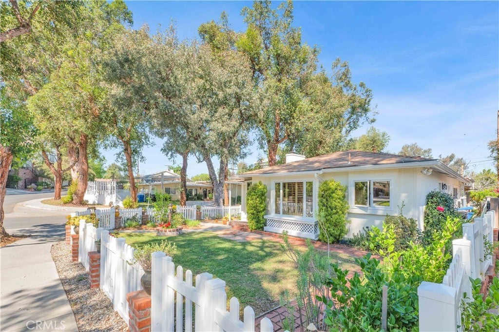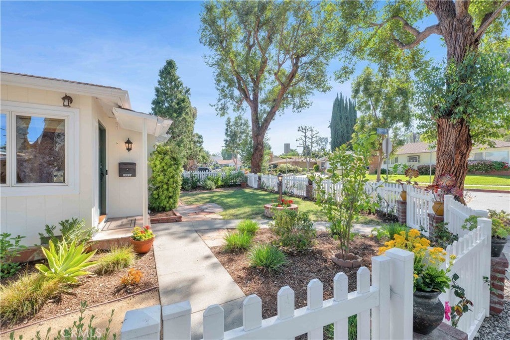 South of Ventura Boulevard on a desirable corner lot, this Woodland Hills home offers a rare combination of location, privacy, and a flexible floor plan. The southern-facing orientation fills the home with natural light that single-frontage properties rarely achieve, and a dedicated family room functions well as a home office, guest area, or creative space, adapting comfortably to your needs. Inside, oak hardwood floors run throughout the main living areas with an open floor plan that facilitates both cozy evenings and casual entertaining. The kitchen features granite countertops and ample cabinetry that make cooking and hosting effortless, conveniently flowing into a dedicated laundry space with built-in storage. The spacious primary suite is anchored by a beautifully preserved mid-century modern bath where original tile and porcelain have been maintained for tasteful vintage character. The second bathroom and a third powder room have been stylishly updated, and thoughtful storage runs throughout the home with cedar-lined closets featuring built-in organization, adding charm and comfort for family and guests. Step through striking French doors into a spacious covered patio that creates a natural extension of the living space. Private, shaded, and ready for entertaining, the high-fenced backyard features mature fruit trees, including lime, mandarin, pomelo, fig, and avocado, that make the backyard as productive as it is beautiful. The 360-square-foot concrete pad offers additional space for a storage shed, pergola, or other potential uses. A vast, open-ceiling 2-car garage completes this versatile home, currently used as a dedicated home gym. The home is equipped for modern living with an integrated solar panel system, Tesla Powerwall battery backup, and dedicated 240V fast EV charging, ensuring energy independence during grid blackouts. Additional highlights include a reverse osmosis water filtration system, dual water heaters, and drip irrigation and drought-tolerant landscaping throughout the property. All of this sits within walking distance of restaurants, grocery stores, and boutiques along Ventura Boulevard, with the calm of a quiet residential street waiting for you at home.