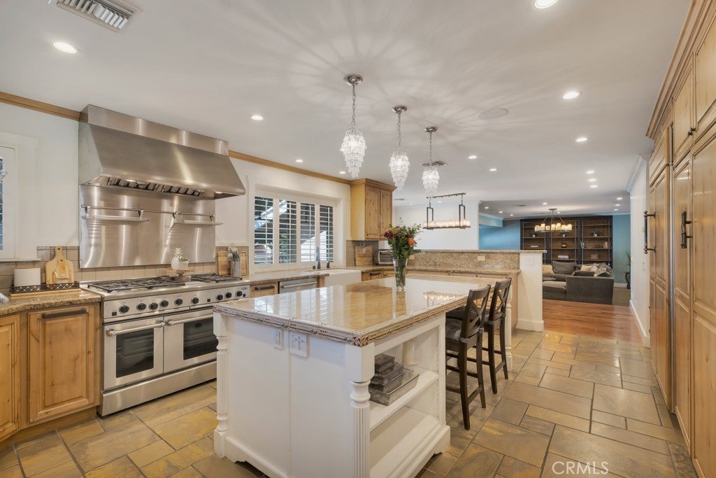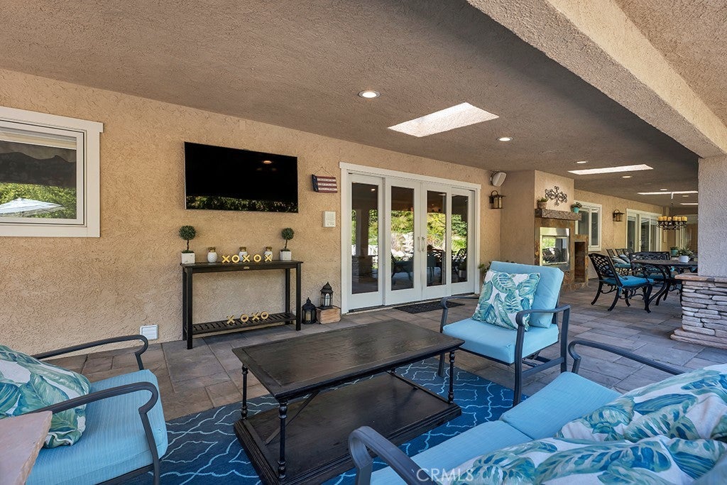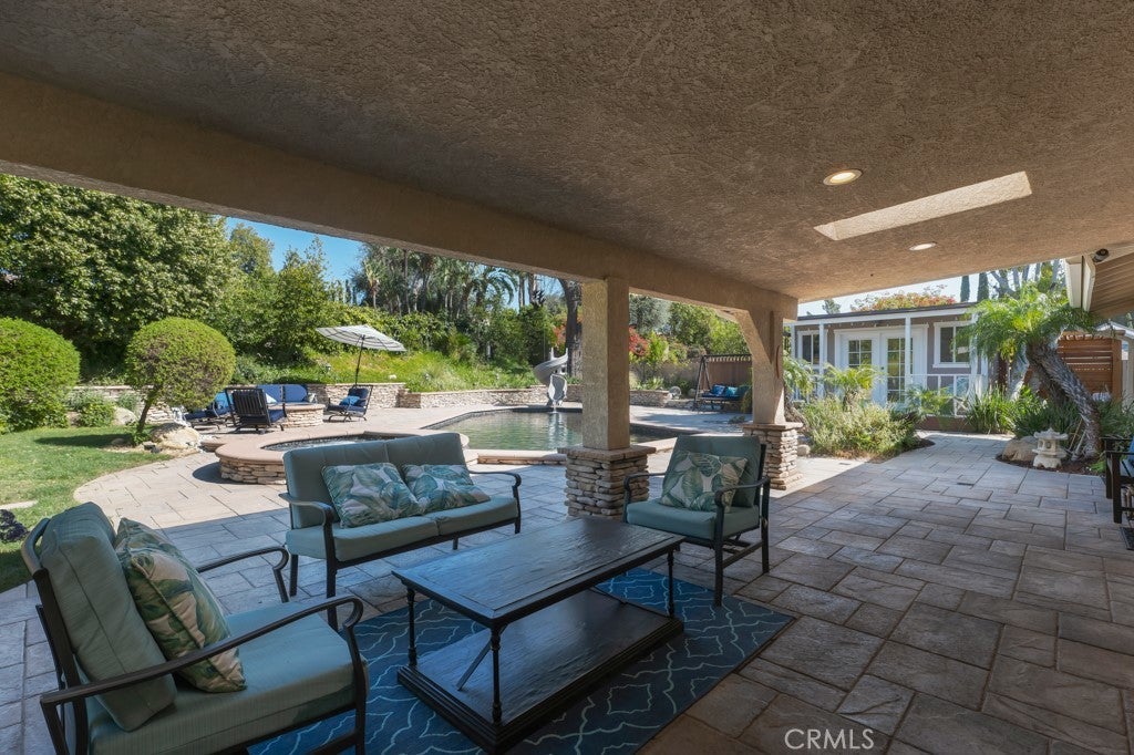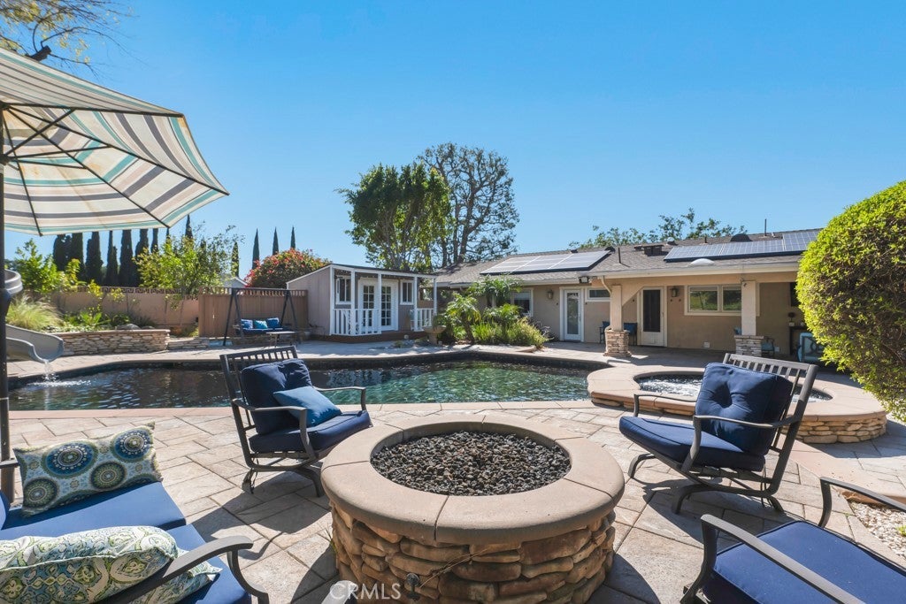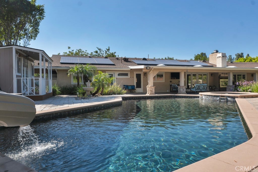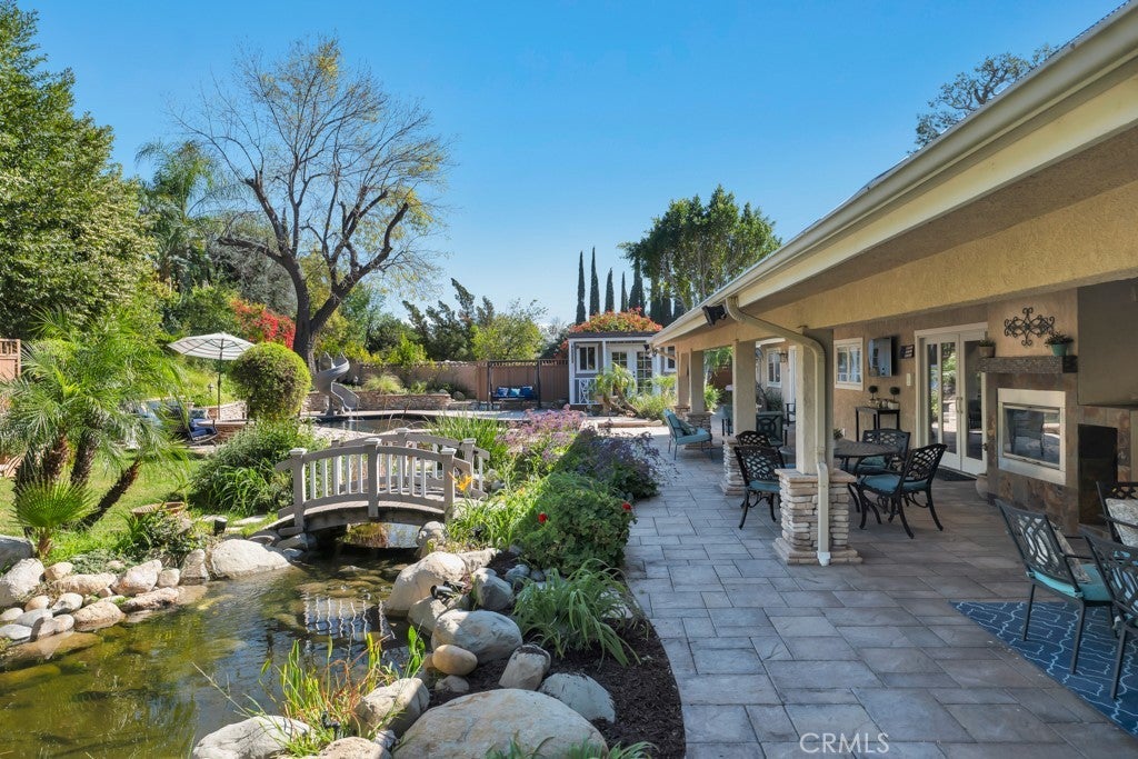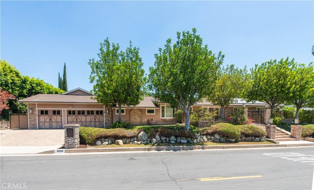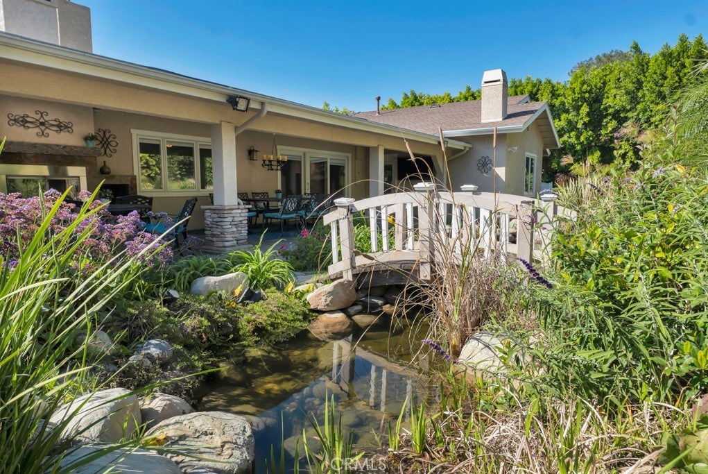 Welcome to one of the most spectacular single-story, ranch style custom estates in Knollwood! The moment you arrive, the striking curb appeal sets the tone—beautiful rock hardscaping leads to a private, gated courtyard with serene fountain and tranquil seating areas that greet you. Step through custom wood double doors w/beveled glass and discover nearly 4,300 sq. ft. of luxurious living space. Upon entry you immediately notice the views of the resort-like backyard through the oversized sliding glass doors of the spacious and bright living room that has custom built-ins and fireplace. At the heart of the home is a gourmet chef’s kitchen, designed to impress w/Argentinean marble floors, oversized center island, DCS 6-burner stove, double ovens, warming drawer, dual sinks, Sub-Zero refrigerator, wine fridge, fireplace & exceptional storage. The kitchen flows seamlessly into the dining room and onward to a step-down, expansive family room w/custom built-ins and cozy fireplace. Surrounding the family room is a bonus upper open area, ideal for bar or pool table- the perfect entertaining spot w/oversized glass sliders that frame serene views of the entertainer’s backyard—creating a seamless indoor-outdoor flow. Thoughtful floor plan features two private wings, creating an ideal layout for the five bedrooms and four baths. The primary retreat is a sanctuary of luxury, boasting a fireplace, custom up lighting, built-in wardrobes and fully finished walk-in closet. The spa-like primary bath features Carrera marble, heated floors, dual vanities, whirlpool soaking tub, oversized steam shower, and skylight that bathes the space in natural light. Two of the additional bedrooms are spacious en-suites, perfect for guests or family. A rare and impressive feature is the extra-large laundry room, designed to accommodate two washers and two dryers, with abundant cabinetry, a utility sink & direct access to yard. The resort-style backyard is an entertainer’s dream: an extended covered patio w/fireplace, Pebble Tec salt water pool w/slide, stylish spa-inspired outdoor shower, koi pond, putting green, low-maintenance turf, detached pool room & large gated/enclosed carport area. Additional highlights include mud room, finished three-car garage w/epoxy floors and built-in cabinets, solar, 3 A/C zones, CAT/cable wiring throughout. Homes like this are a rare find—offering custom design, privacy and luxury all in one. This extraordinary estate is truly one of a kind and won’t last!