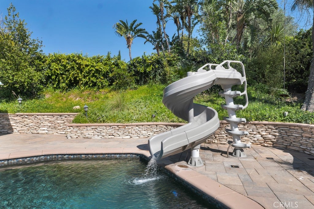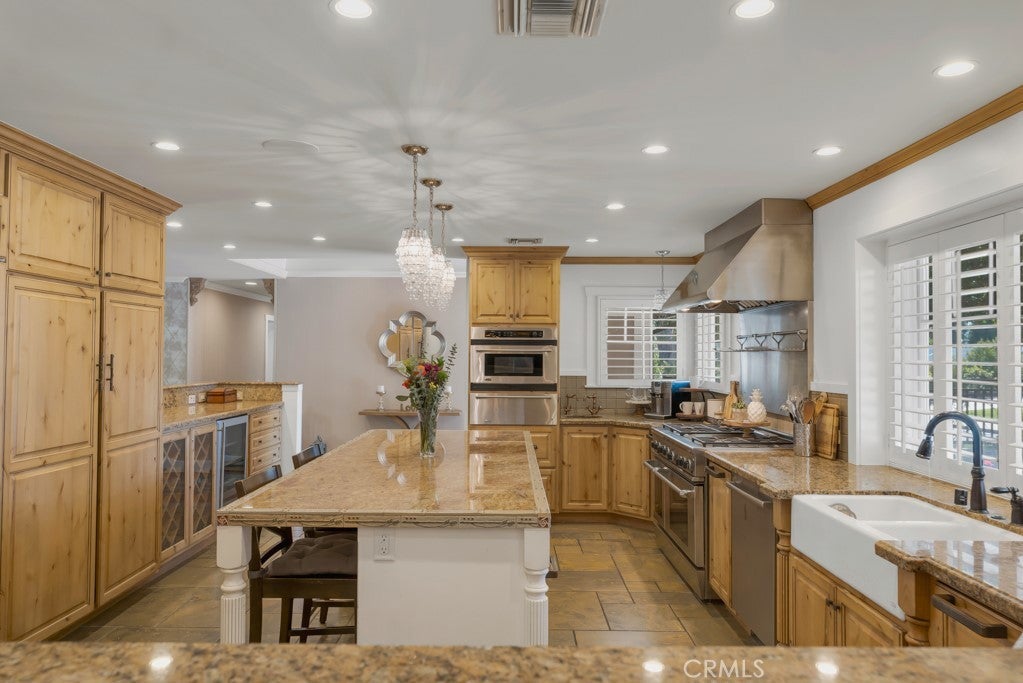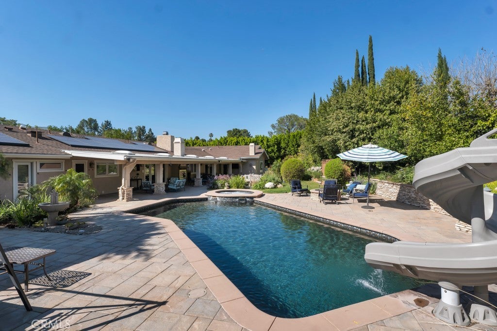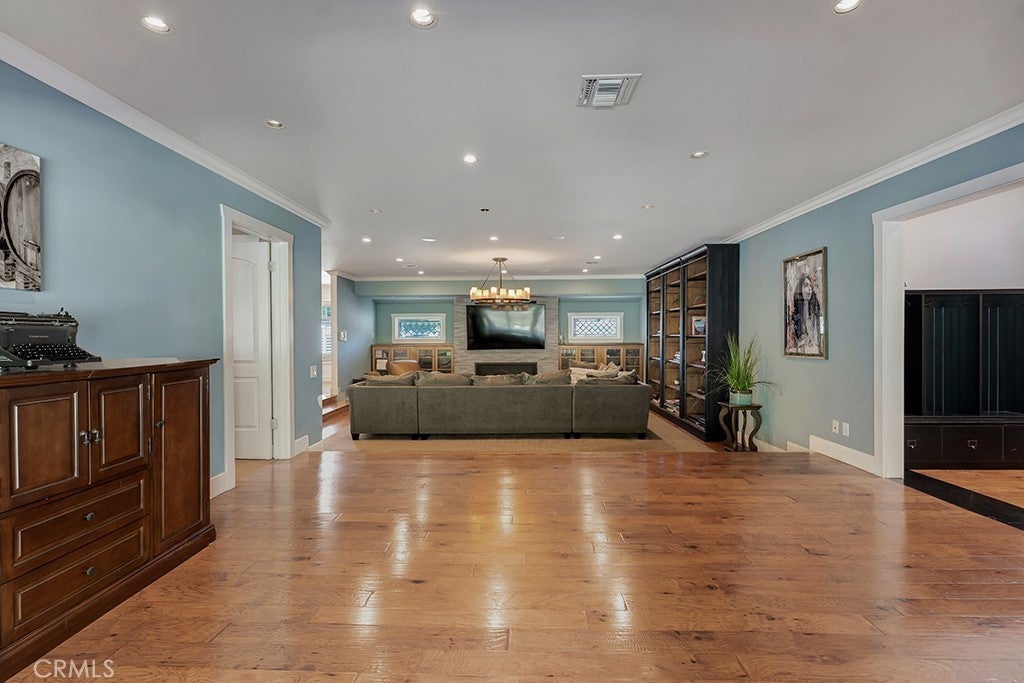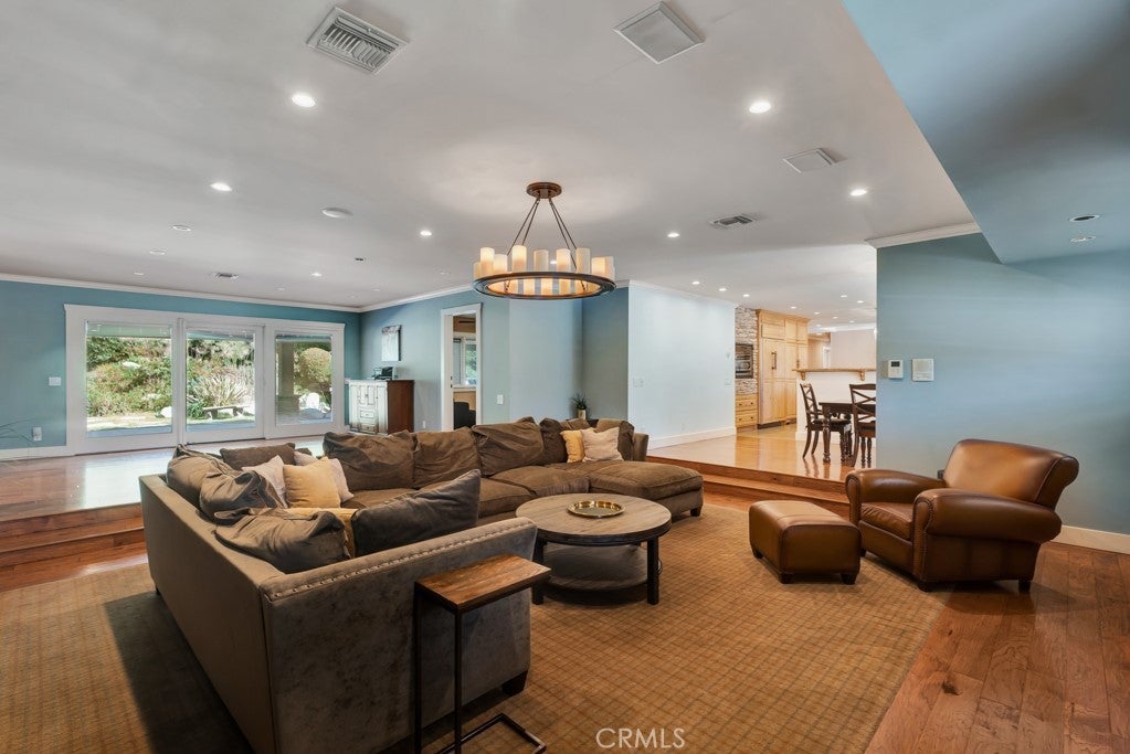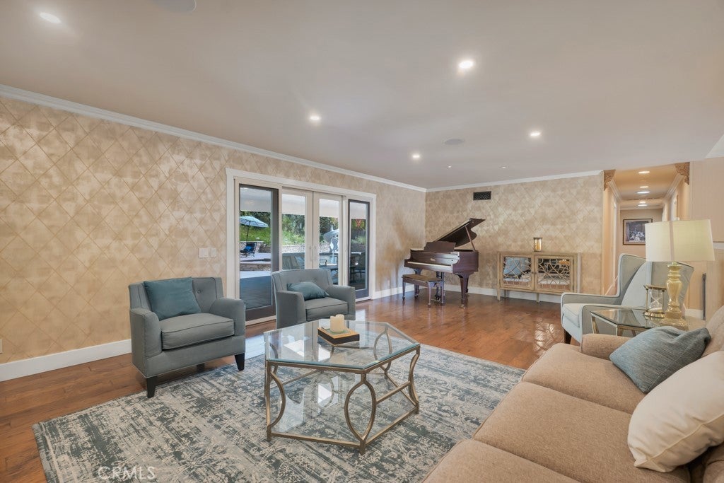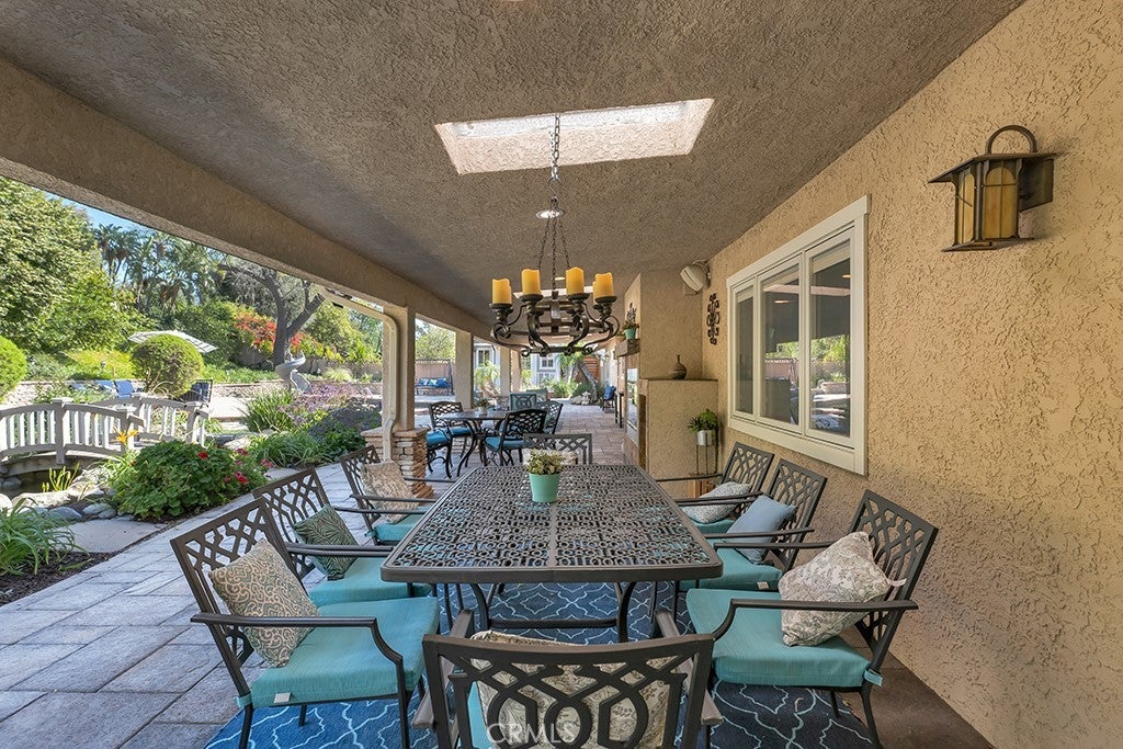 Welcome to one of the most spectacular single-story, ranch style custom estates in Knollwood! The moment you arrive, the striking curb appeal sets the tone—beautiful rock hardscaping leads to a private, gated courtyard with serene fountain and tranquil seating areas that greet you. Step through custom wood double doors w/beveled glass and discover nearly 4,300 sq. ft. of luxurious living space. Upon entry you immediately notice the views of the resort-like backyard through the oversized sliding glass doors of the spacious and bright living room that has custom built-ins and fireplace. At the heart of the home is a gourmet chef’s kitchen, designed to impress w/Argentinean marble floors, oversized center island, DCS 6-burner stove, double ovens, warming drawer, dual sinks, Sub-Zero refrigerator, wine fridge, fireplace & exceptional storage. The kitchen flows seamlessly into the dining room and onward to a step-down, expansive family room w/custom built-ins and cozy fireplace. Surrounding the family room is a bonus upper open area, ideal for bar or pool table- the perfect entertaining spot w/oversized glass sliders that frame serene views of the entertainer’s backyard—creating a seamless indoor-outdoor flow. Thoughtful floor plan features two private wings, creating an ideal layout for the five bedrooms and four baths. The primary retreat is a sanctuary of luxury, boasting a fireplace, custom up lighting, built-in wardrobes and fully finished walk-in closet. The spa-like primary bath features Carrera marble, heated floors, dual vanities, whirlpool soaking tub, oversized steam shower, and skylight that bathes the space in natural light. Two of the additional bedrooms are spacious en-suites, perfect for guests or family. A rare and impressive feature is the extra-large laundry room, designed to accommodate two washers and two dryers, with abundant cabinetry, a utility sink & direct access to yard. The resort-style backyard is an entertainer’s dream: an extended covered patio w/fireplace, Pebble Tec salt water pool w/slide, stylish spa-inspired outdoor shower, koi pond, putting green, low-maintenance turf, detached pool room & large gated/enclosed carport area. Additional highlights include mud room, finished three-car garage w/epoxy floors and built-in cabinets, solar, 3 A/C zones, CAT/cable wiring throughout. Homes like this are a rare find—offering custom design, privacy and luxury all in one. This extraordinary estate is truly one of a kind and won’t last!