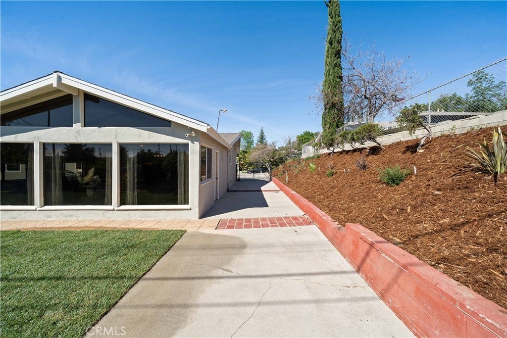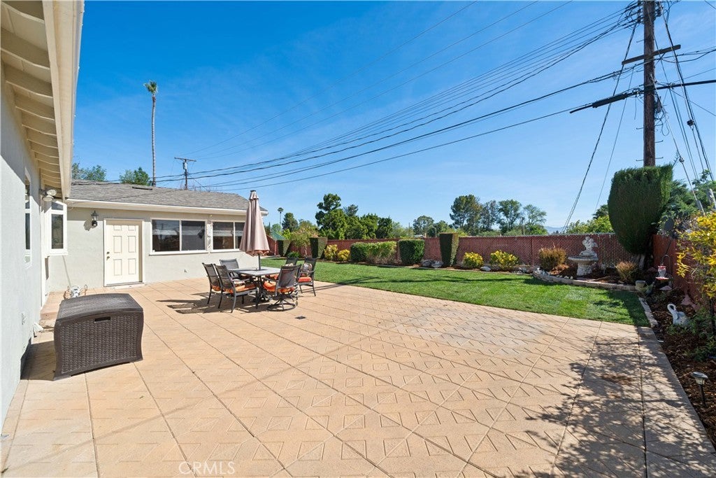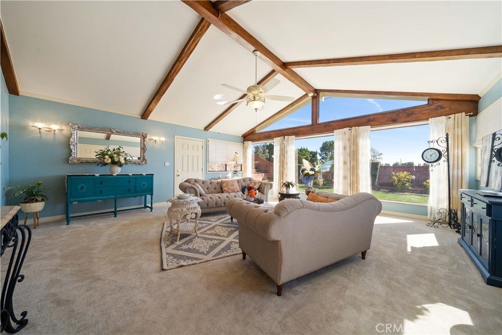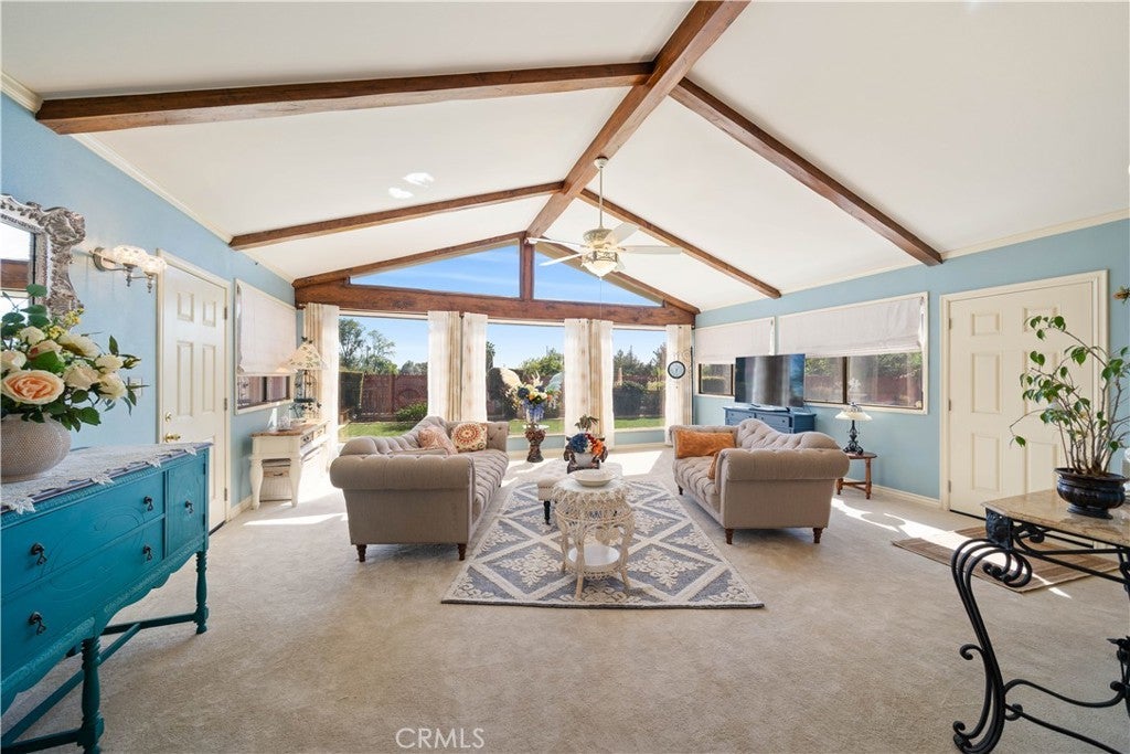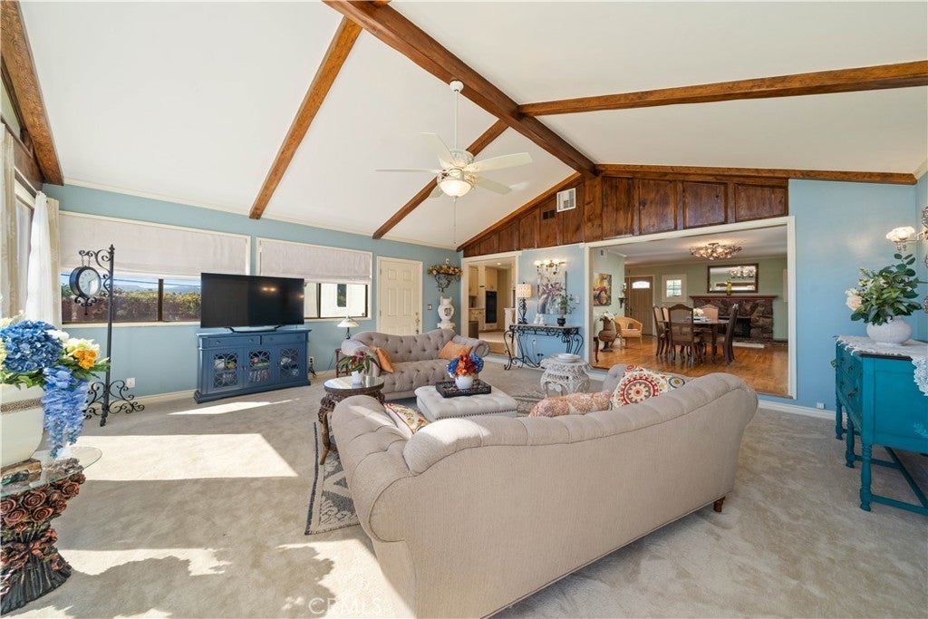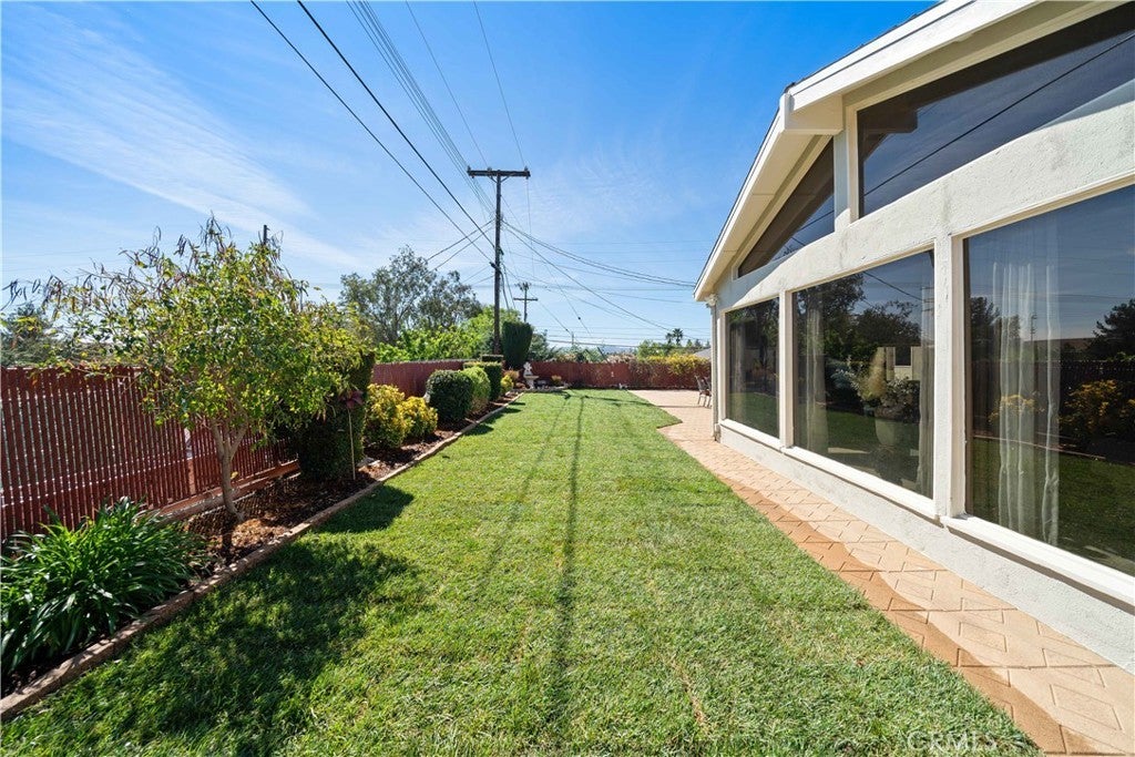 Refined urban living without the traffic, noise, and congestion and still have space for your RV. This beautifully maintained single-story 1960s Mid-Century home is nestled on a tree-lined street with mountain views and showcases numerous thoughtful upgrades completed over the years. A double-door entry with etched glass welcomes you into a formal foyer that opens to a spacious living room with gleaming hardwood floors. The living room features a stunning stone wood-burning fireplace with wood mantel, plantation shutters, crown and base moldings, and a formal dining area. The captivating family room is highlighted by dramatic beamed ceilings, expansive picture windows, and seamless indoor-outdoor flow. Fiberglass doors lead to a private backyard, perfect for entertaining, al fresco dining, or relaxing evenings with family and friends. The open kitchen offers a generous breakfast area, custom wainscoting, crown molding, and ceramic tile floors. Designed for the home chef, it includes a stainless gas cooktop with high-BTU burner, double oven, and GE Profile dishwasher. A charming garden window overlooks the backyard and mountain views. Seamless composite countertops, backsplash, and double sink provide durability and a clean, modern aesthetic. Adjacent to the kitchen is an oversized laundry room with abundant storage, pantry space, utility closet, and direct backyard access. Additional features include smooth ceilings, newer copper plumbing, RV access and parking, partial dual-pane windows, newer roof (2024), newer sewer line (house to street), updated AC, landscaping, automatic sprinklers, attic storage, upgraded insulation, and a gable cooling fan. Hardwood floors enhance most rooms, and bedrooms offer mirrored closet doors and ceiling fans. The remodeled hall bath features a stylish vanity, clawfoot tub with freestanding faucet, rain shower, sconce lighting, and ceramic tile floors. The primary suite includes a private bath with vintage-style corner vanity, updated shower enclosure, and newer flooring. Outside, enjoy a wide side yard with RV access ideal for cars, boats, or recreational vehicles plus a brick ribbon driveway, double iron gate, newer garage door, 50-gallon water heater, open tiled patio, and newly sodded lawn. Close to hiking and biking trails, Orcutt Ranch, highly regarded schools, shopping, and dining. Convenient access to the 101 and 118 freeways in a neighborhood known for long-term residents and a strong sense of community.