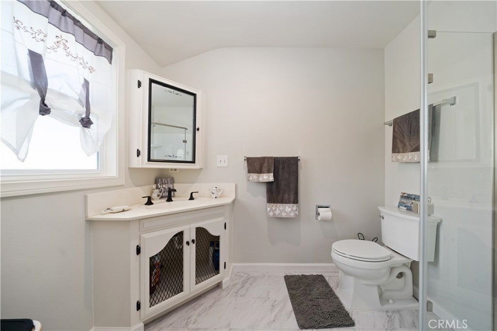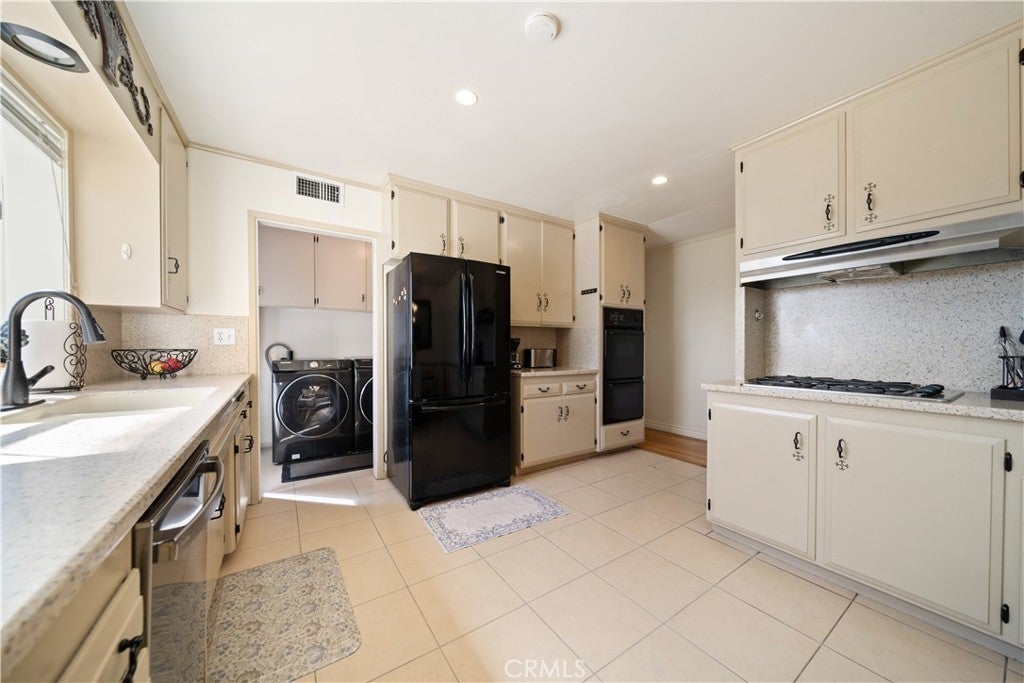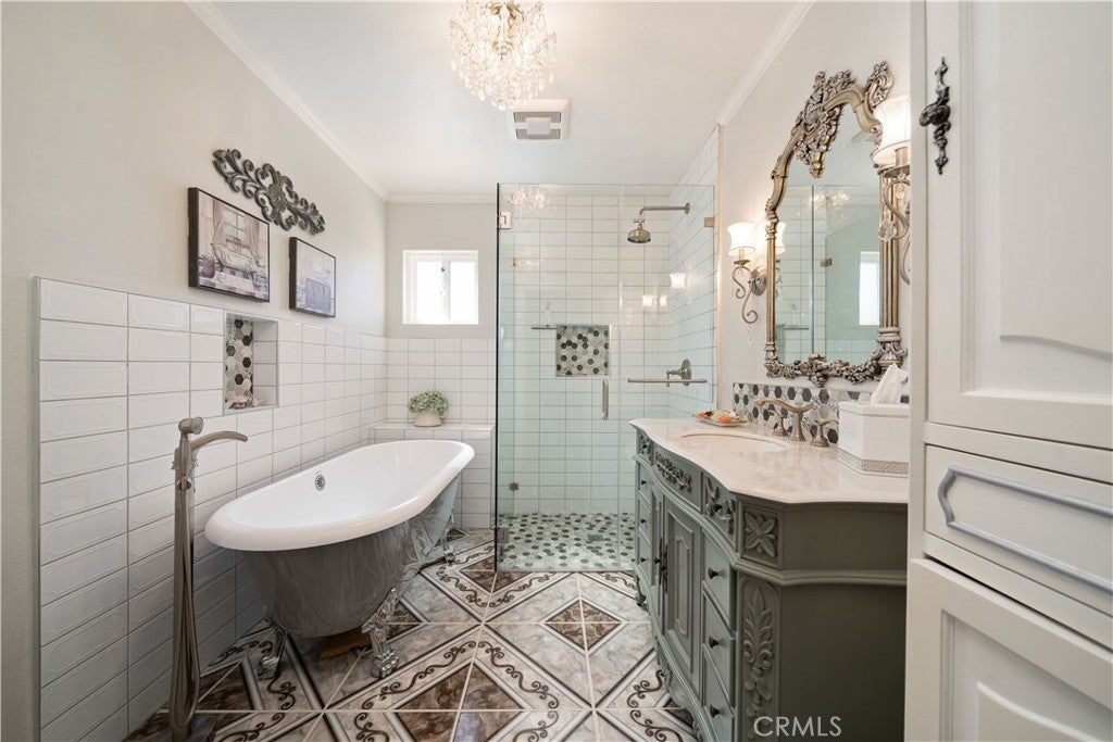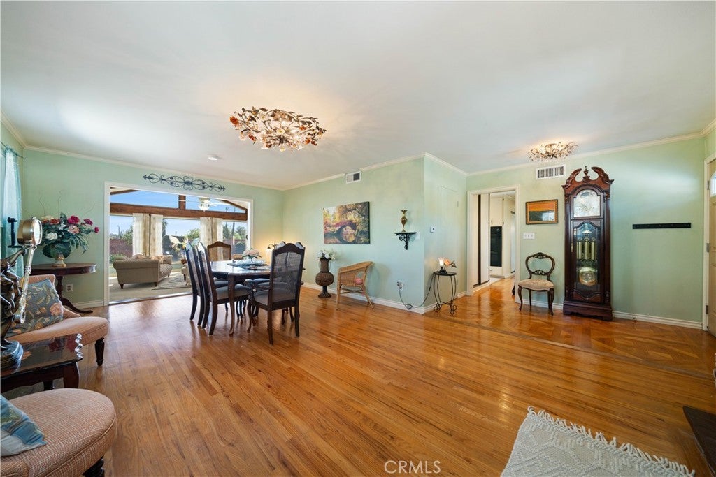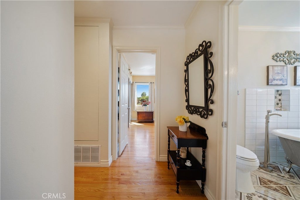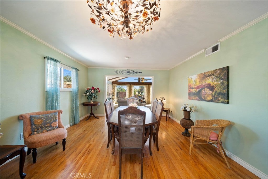 Refined urban living without the traffic, noise, and congestion and still have space for your RV. This beautifully maintained single-story 1960s Mid-Century home is nestled on a tree-lined street with mountain views and showcases numerous thoughtful upgrades completed over the years. A double-door entry with etched glass welcomes you into a formal foyer that opens to a spacious living room with gleaming hardwood floors. The living room features a stunning stone wood-burning fireplace with wood mantel, plantation shutters, crown and base moldings, and a formal dining area. The captivating family room is highlighted by dramatic beamed ceilings, expansive picture windows, and seamless indoor-outdoor flow. Fiberglass doors lead to a private backyard, perfect for entertaining, al fresco dining, or relaxing evenings with family and friends. The open kitchen offers a generous breakfast area, custom wainscoting, crown molding, and ceramic tile floors. Designed for the home chef, it includes a stainless gas cooktop with high-BTU burner, double oven, and GE Profile dishwasher. A charming garden window overlooks the backyard and mountain views. Seamless composite countertops, backsplash, and double sink provide durability and a clean, modern aesthetic. Adjacent to the kitchen is an oversized laundry room with abundant storage, pantry space, utility closet, and direct backyard access. Additional features include smooth ceilings, newer copper plumbing, RV access and parking, partial dual-pane windows, newer roof (2024), newer sewer line (house to street), updated AC, landscaping, automatic sprinklers, attic storage, upgraded insulation, and a gable cooling fan. Hardwood floors enhance most rooms, and bedrooms offer mirrored closet doors and ceiling fans. The remodeled hall bath features a stylish vanity, clawfoot tub with freestanding faucet, rain shower, sconce lighting, and ceramic tile floors. The primary suite includes a private bath with vintage-style corner vanity, updated shower enclosure, and newer flooring. Outside, enjoy a wide side yard with RV access ideal for cars, boats, or recreational vehicles plus a brick ribbon driveway, double iron gate, newer garage door, 50-gallon water heater, open tiled patio, and newly sodded lawn. Close to hiking and biking trails, Orcutt Ranch, highly regarded schools, shopping, and dining. Convenient access to the 101 and 118 freeways in a neighborhood known for long-term residents and a strong sense of community.