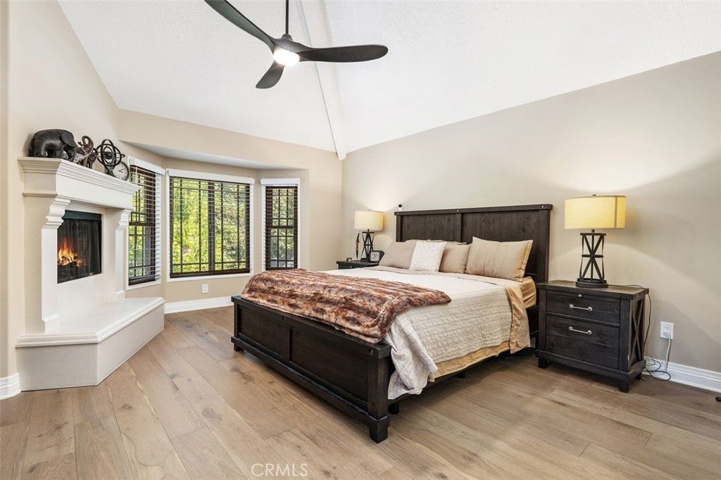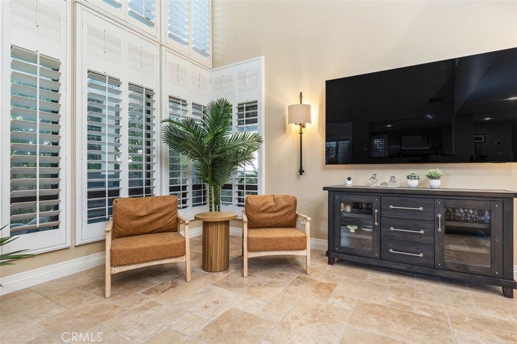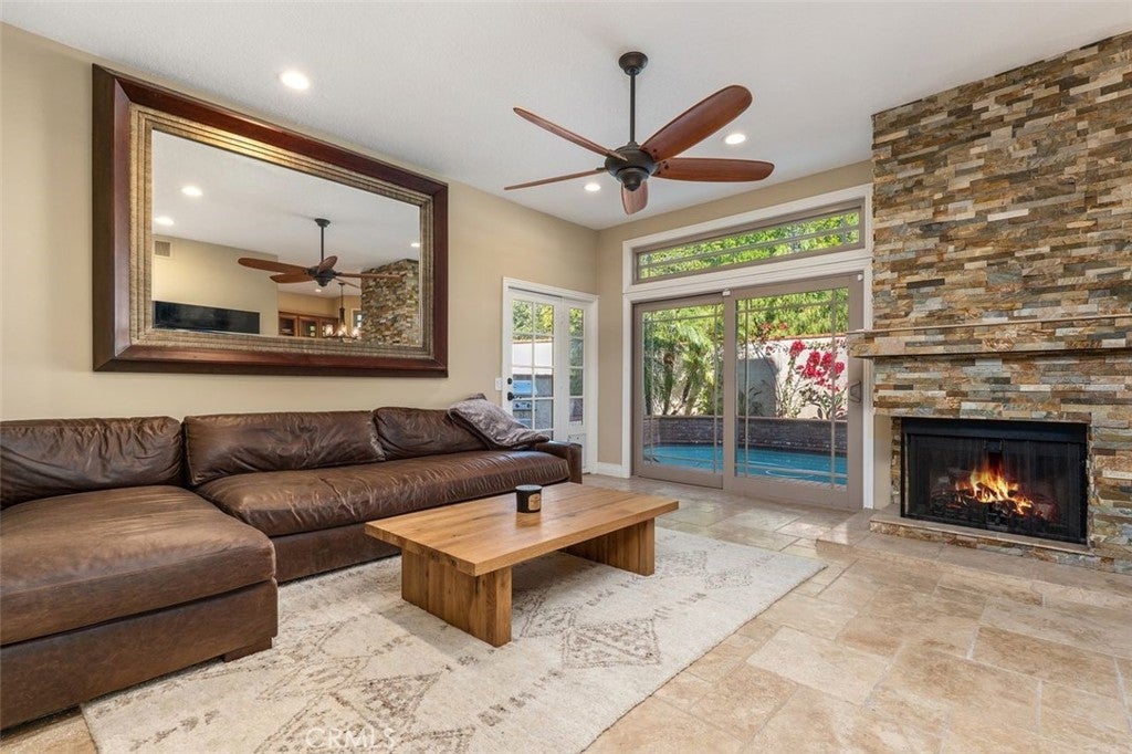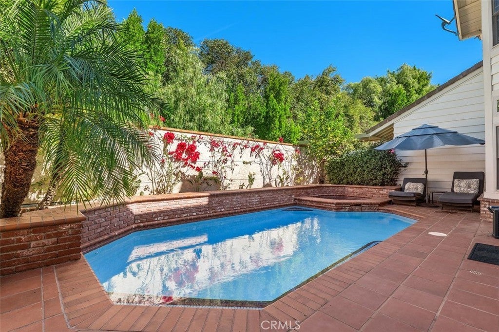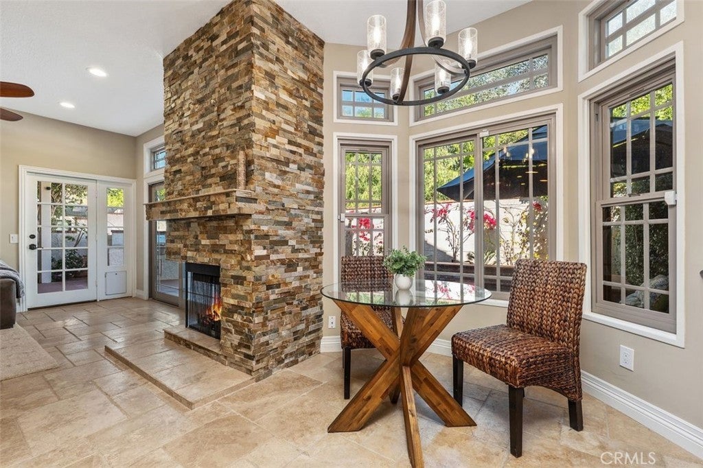 Beautifully upgraded North Ranch townhome that lives like a single-family home, featuring soaring ceilings and an open, spacious layout. The home offers a large living room, separate family room, and an eat-in kitchen with breakfast nook, creating a seamless flow ideal for both everyday living and entertaining. Both the living room and family room feature fireplaces, adding warmth and charm throughout. This 3-bedroom home includes a stunning primary suite with its own fireplace and a spa-like, upgraded bathroom. Recent improvements include fresh interior paint throughout (walls, trim, and stair railings), all new light fixtures, and brand new engineered white oak flooring upstairs. The home is thoughtfully enhanced with custom built-in closets, additional hallway cabinetry with stone countertops and two linen closets, and a custom wet bar with solid stone counters and limestone backsplash. The secondary bathroom has been updated with a new vanity, lighting, mirrors, and fixtures, and the powder room has been fully remodeled. Additional upgrades include improved laundry storage and new landscaping in much of the backyard. The private outdoor space is a true highlight, featuring a pool and dedicated BBQ area, perfect for relaxing or entertaining. Ideally located close to the community pool and clubhouse, this home is situated in the prestigious North Ranch neighborhood near the golf course. Offering exceptional privacy, the home shares only a minimal portion of one wall with a neighboring property. A rare opportunity to own a highly upgraded home with exceptional indoor-outdoor living.