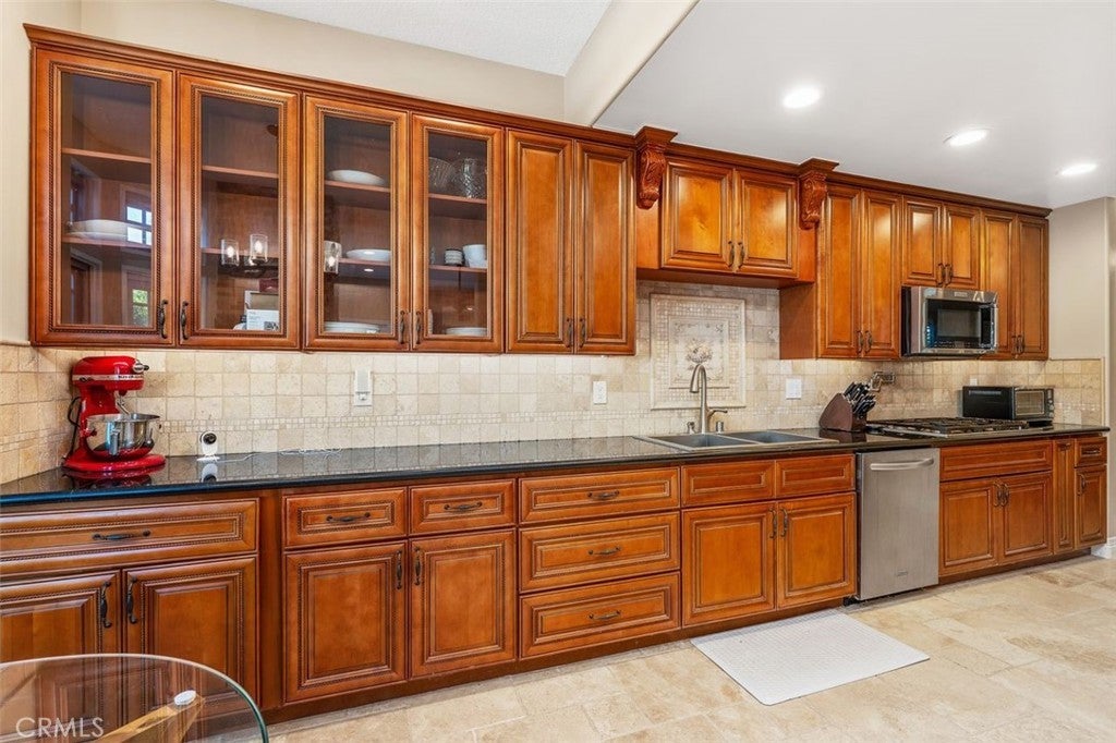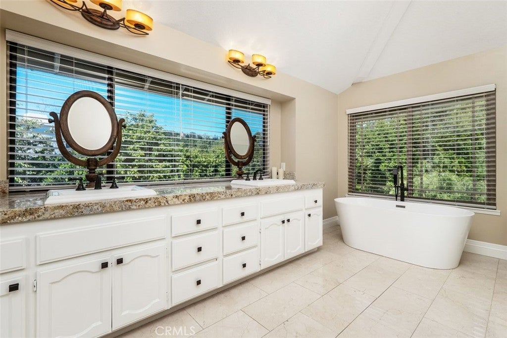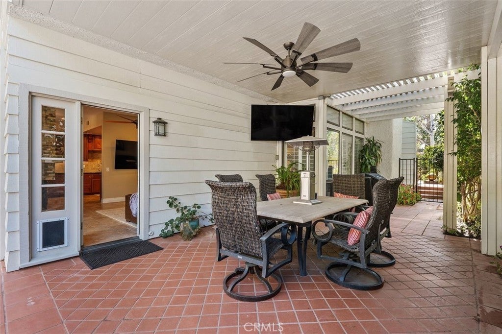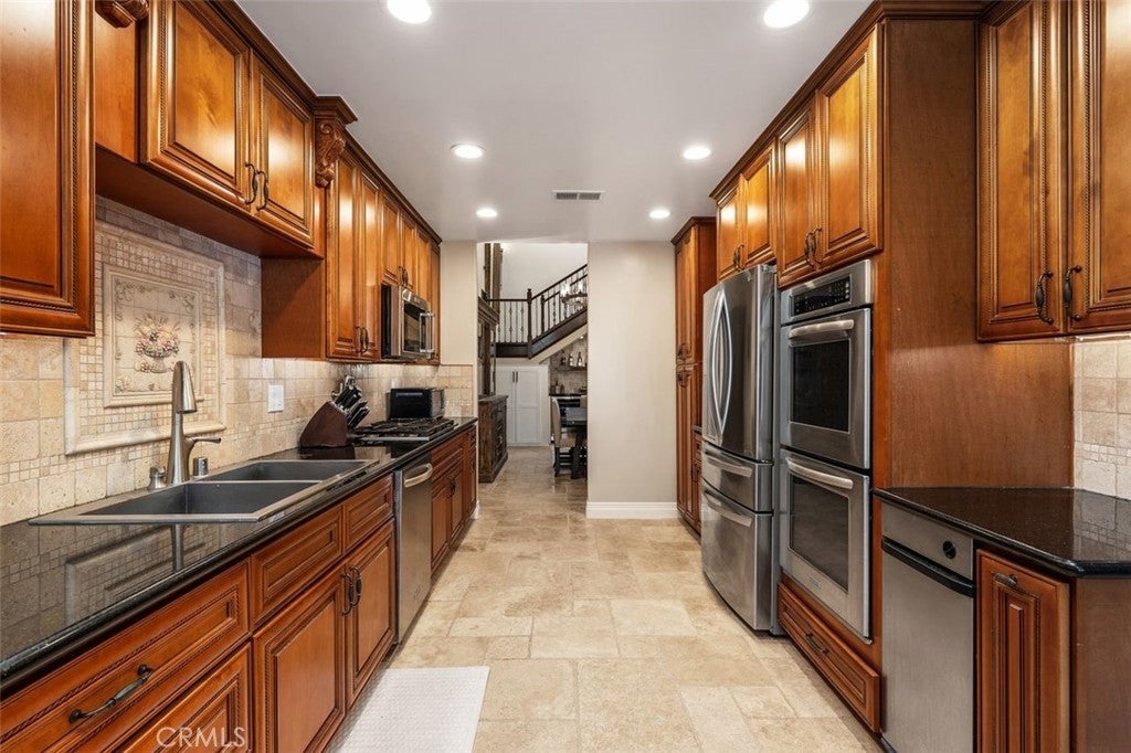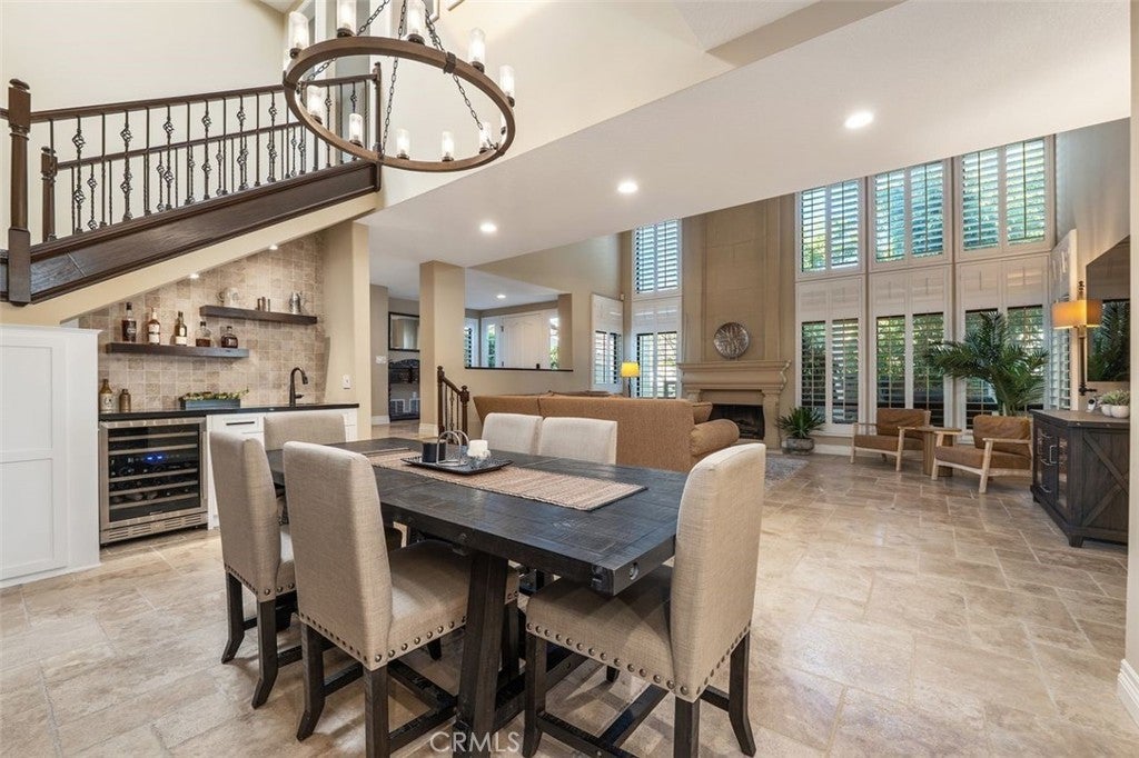 Beautifully upgraded North Ranch townhome that lives like a single-family home, featuring soaring ceilings and an open, spacious layout. The home offers a large living room, separate family room, and an eat-in kitchen with breakfast nook, creating a seamless flow ideal for both everyday living and entertaining. Both the living room and family room feature fireplaces, adding warmth and charm throughout. This 3-bedroom home includes a stunning primary suite with its own fireplace and a spa-like, upgraded bathroom. Recent improvements include fresh interior paint throughout (walls, trim, and stair railings), all new light fixtures, and brand new engineered white oak flooring upstairs. The home is thoughtfully enhanced with custom built-in closets, additional hallway cabinetry with stone countertops and two linen closets, and a custom wet bar with solid stone counters and limestone backsplash. The secondary bathroom has been updated with a new vanity, lighting, mirrors, and fixtures, and the powder room has been fully remodeled. Additional upgrades include improved laundry storage and new landscaping in much of the backyard. The private outdoor space is a true highlight, featuring a pool and dedicated BBQ area, perfect for relaxing or entertaining. Ideally located close to the community pool and clubhouse, this home is situated in the prestigious North Ranch neighborhood near the golf course. Offering exceptional privacy, the home shares only a minimal portion of one wall with a neighboring property. A rare opportunity to own a highly upgraded home with exceptional indoor-outdoor living.
