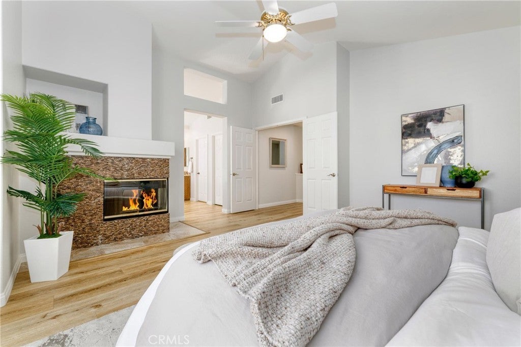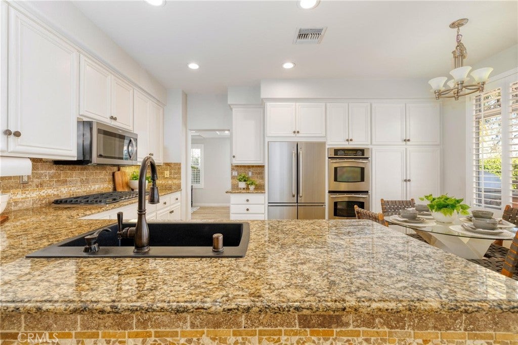 Welcome to this beautifully remodeled 4 bedroom, 3 bathroom home with a versatile bonus room off the primary suite, perfect for a nursery, home office, or private retreat. This stunning Warmington Plan I is ideally situated in the highly sought after Northbridge community of Valencia, tucked away on a quiet cul-de-sac with convenient access to scenic paseos, community pools, tennis courts, Helmer’s Park, and award-winning Charles Helmers Elementary School. Thoughtfully updated, this move-in-ready home features modern finishes throughout, including new flooring, refreshed bathrooms, fresh interior and exterior paint, and a new stovetop and microwave. The inviting layout blends comfort and style, making it perfect for both everyday living and entertaining. Step outside to a low-maintenance backyard designed for gatherings, complete with a built-in bar, BBQ, refrigerator, fire pit, and ambient lighting. Enjoy the added charm of mature palm trees along with apricot and apple trees, offering fresh fruit right from your own yard. The spacious three car garage provides exceptional storage with custom cabinetry, built-in shelving, and an overhead loft for larger items. Additional upgrades include a newer roof, garage door opener, hot water heater, updated interior lighting, and pre-wiring for a hot tub in the backyard. This exceptional home combines modern upgrades, thoughtful features, and a prime location ready for you to move in and enjoy. Welcome home to 23609 Wilmington Court!