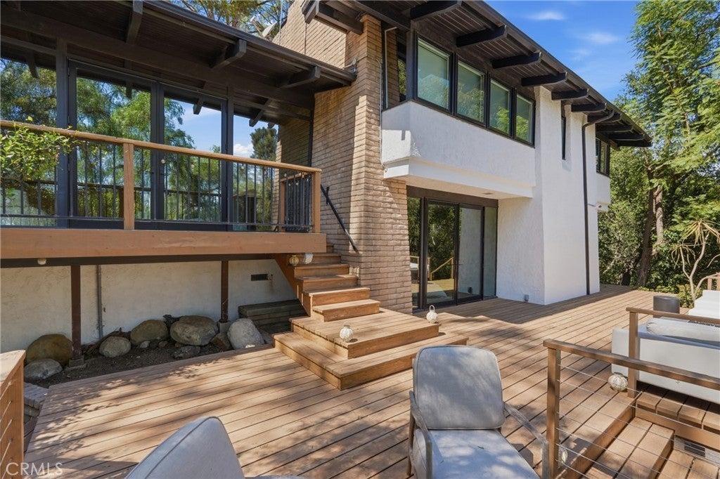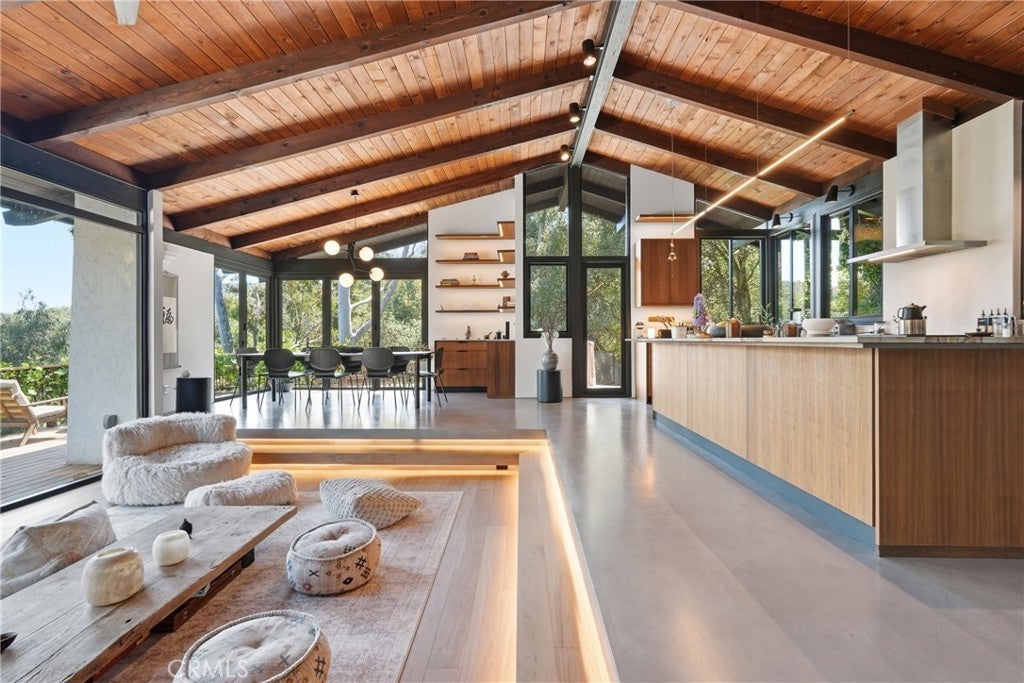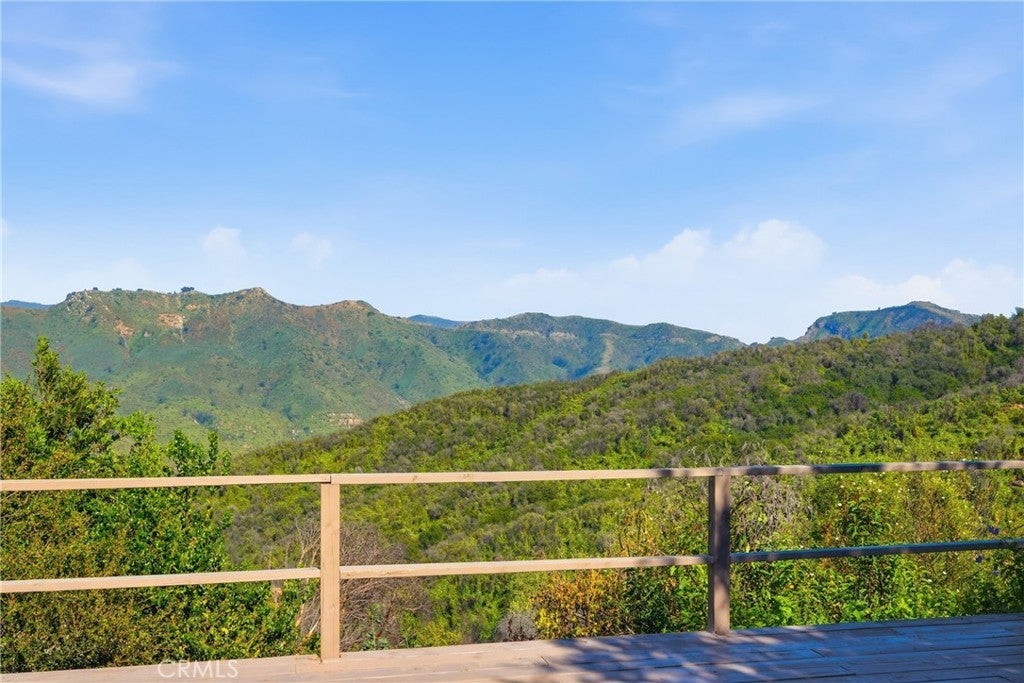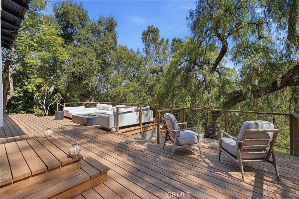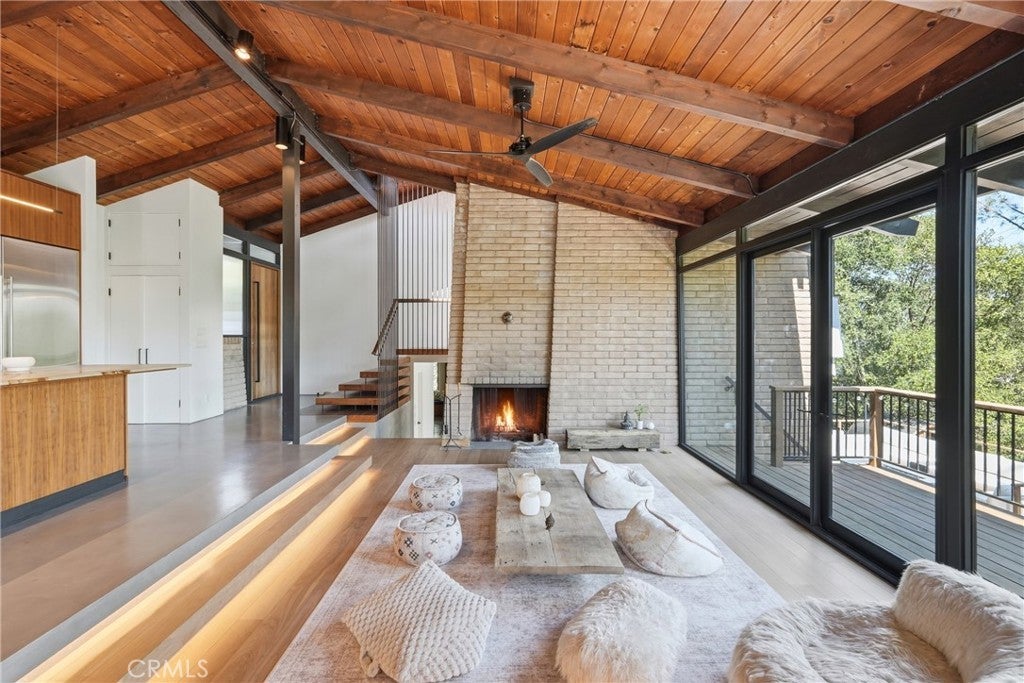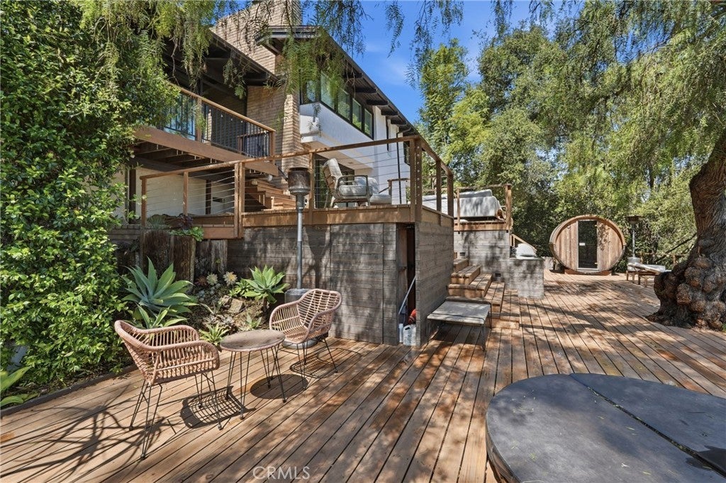 Private 3-acre Topanga retreat with panoramic canyon and mountain views, resort-style amenities, and seamless indoor-outdoor living. Tucked away in the highly sought-after Upper Fernwood neighborhood of Topanga, this mid-century residence offers a rare blend of privacy, architecture, and lifestyle. Set on nearly 3 acres and surrounded by lush natural landscape, the home showcases expansive walls of glass that frame breathtaking canyon and mountain views while filling the interiors with natural light. The home features an open-concept living and entertaining space with clean modern lines, warm wood finishes, and a relaxed yet elevated design. A stunning great room with vaulted wood-beamed ceilings and a statement fireplace serves as the heart of the home, while a dedicated dining area captures serene views through floor-to-ceiling glass doors that open to the surrounding decks. The chef’s kitchen is equipped with Wolf and Sub-Zero appliances, custom cabinetry, and stone countertops, seamlessly connecting to the main living areas. The primary suite offers a tranquil retreat with a fireplace and abundant natural light, complemented by a spa-inspired bathroom featuring a freestanding soaking tub, walk-in shower, and peaceful nature views. Additional bathrooms feature modern finishes, including a sleek secondary bath with stone surfaces and custom fixtures, along with a designer powder room. Additional bedrooms are bright and inviting, many with direct outdoor access, while a separate office provides an ideal work-from-home setting. Designed for a true wellness lifestyle, the outdoor spaces are exceptional. Expansive wood decks offer multiple seating and dining areas with sweeping views, a built-in outdoor kitchen with BBQ, lounge areas with fire feature, hot tub, cold plunge, and a private barrel sauna. A private trail and bridge lead to a yoga and viewing deck overlooking the surrounding mountains. The grounds feature mature landscaping including fruit trees, enhancing the natural and private setting. Additional features include radiant heated floors throughout, a Tesla EV charger, a spacious driveway, covered parking, and a private turf courtyard. Set in a peaceful, nature-rich setting near Topanga’s most desirable hiking trails, the property offers privacy while still being within convenient reach of Los Angeles. The property is presented as a fully furnished residence, with the option for unfurnished occupancy.