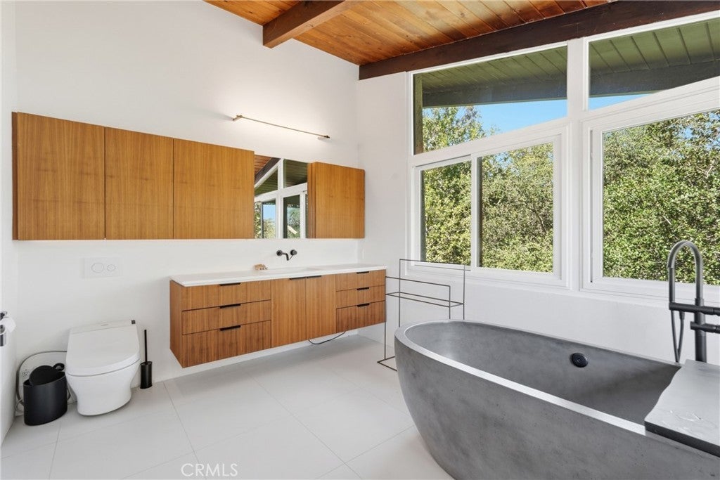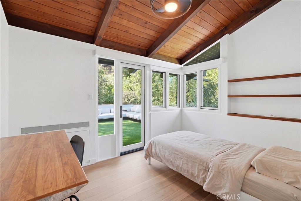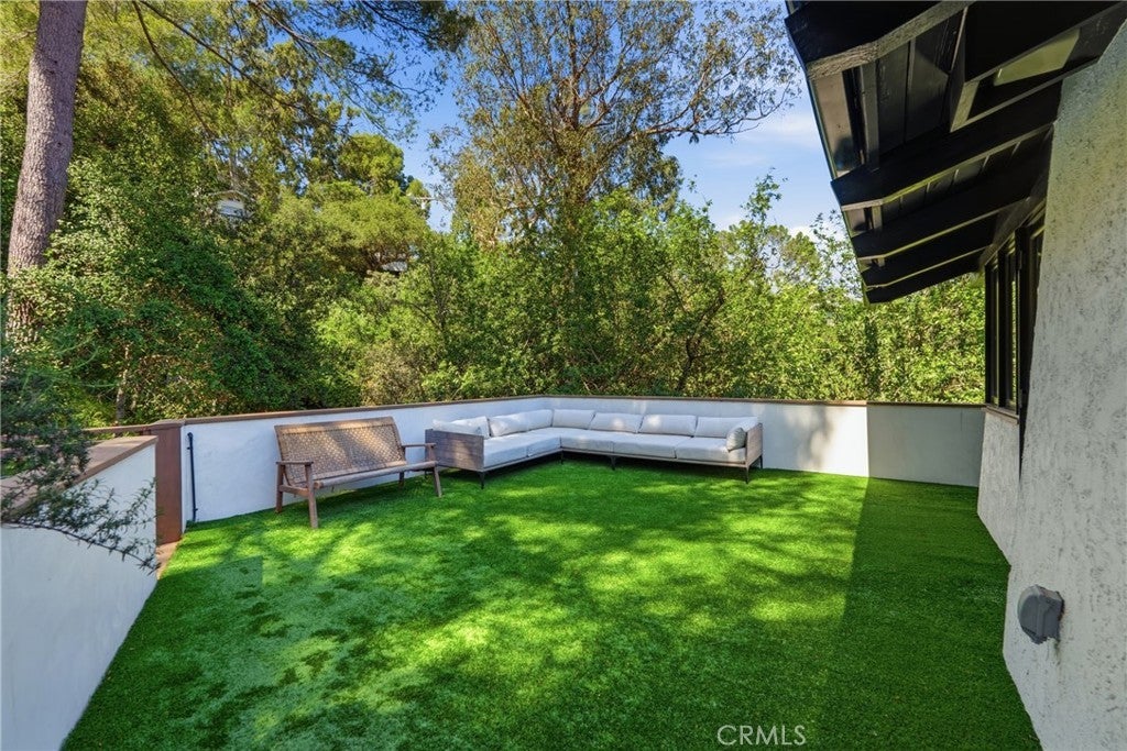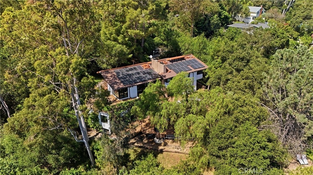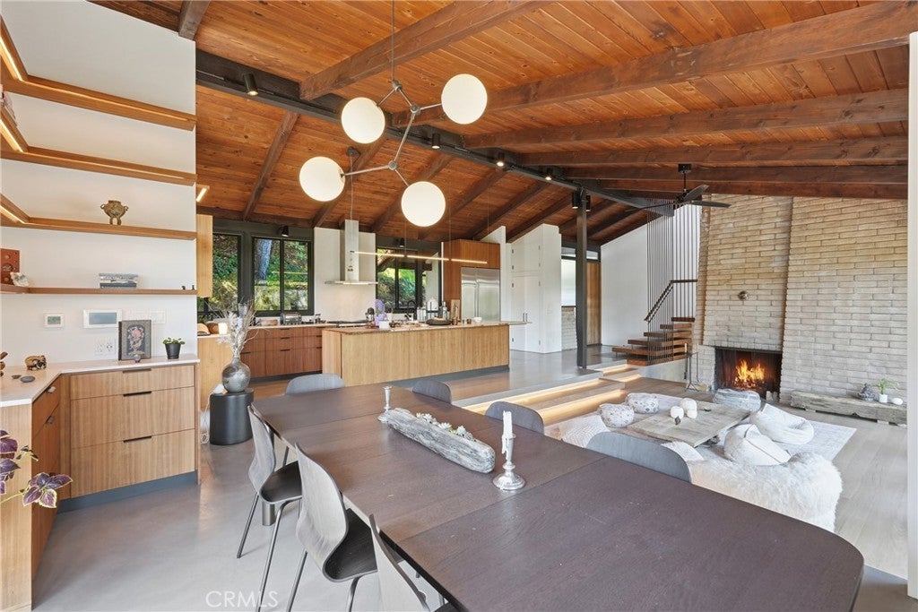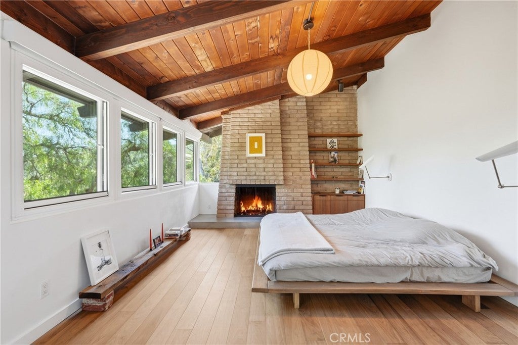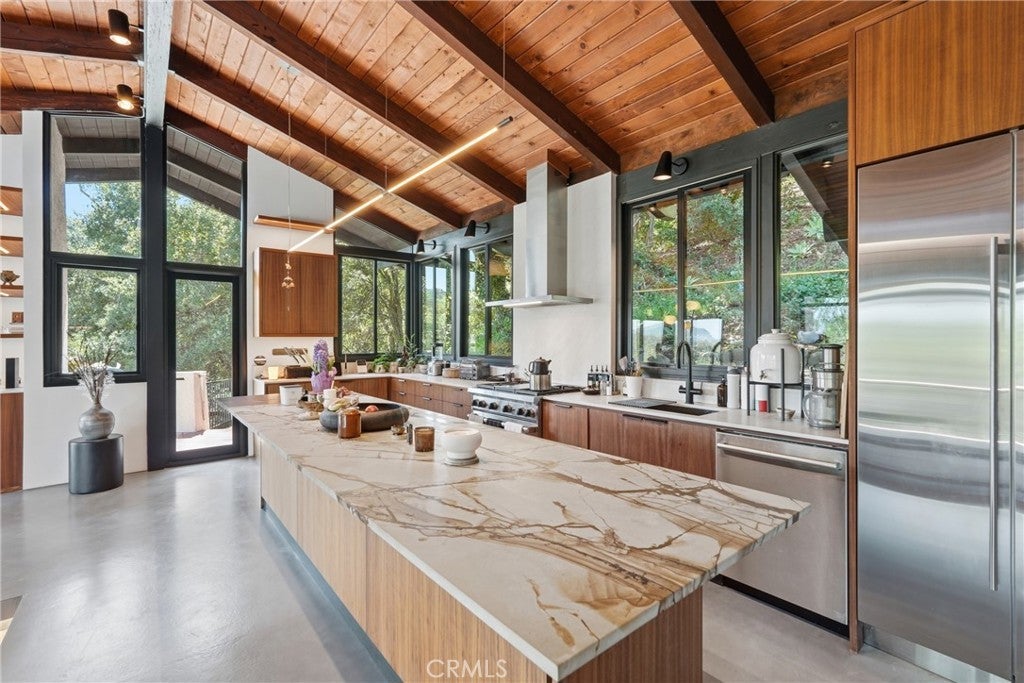 Private 3-acre Topanga retreat with panoramic canyon and mountain views, resort-style amenities, and seamless indoor-outdoor living. Tucked away in the highly sought-after Upper Fernwood neighborhood of Topanga, this mid-century residence offers a rare blend of privacy, architecture, and lifestyle. Set on nearly 3 acres and surrounded by lush natural landscape, the home showcases expansive walls of glass that frame breathtaking canyon and mountain views while filling the interiors with natural light. The home features an open-concept living and entertaining space with clean modern lines, warm wood finishes, and a relaxed yet elevated design. A stunning great room with vaulted wood-beamed ceilings and a statement fireplace serves as the heart of the home, while a dedicated dining area captures serene views through floor-to-ceiling glass doors that open to the surrounding decks. The chef’s kitchen is equipped with Wolf and Sub-Zero appliances, custom cabinetry, and stone countertops, seamlessly connecting to the main living areas. The primary suite offers a tranquil retreat with a fireplace and abundant natural light, complemented by a spa-inspired bathroom featuring a freestanding soaking tub, walk-in shower, and peaceful nature views. Additional bathrooms feature modern finishes, including a sleek secondary bath with stone surfaces and custom fixtures, along with a designer powder room. Additional bedrooms are bright and inviting, many with direct outdoor access, while a separate office provides an ideal work-from-home setting. Designed for a true wellness lifestyle, the outdoor spaces are exceptional. Expansive wood decks offer multiple seating and dining areas with sweeping views, a built-in outdoor kitchen with BBQ, lounge areas with fire feature, hot tub, cold plunge, and a private barrel sauna. A private trail and bridge lead to a yoga and viewing deck overlooking the surrounding mountains. The grounds feature mature landscaping including fruit trees, enhancing the natural and private setting. Additional features include radiant heated floors throughout, a Tesla EV charger, a spacious driveway, covered parking, and a private turf courtyard. Set in a peaceful, nature-rich setting near Topanga’s most desirable hiking trails, the property offers privacy while still being within convenient reach of Los Angeles. The property is presented as a fully furnished residence, with the option for unfurnished occupancy.
