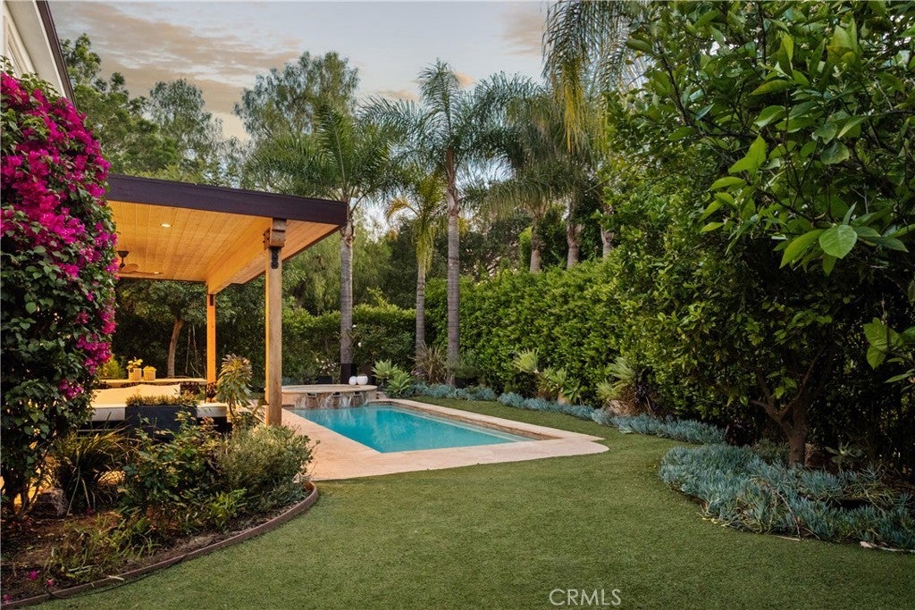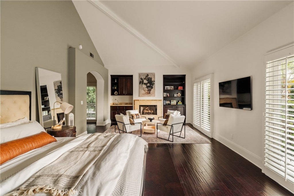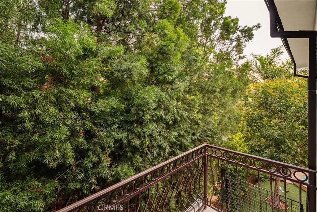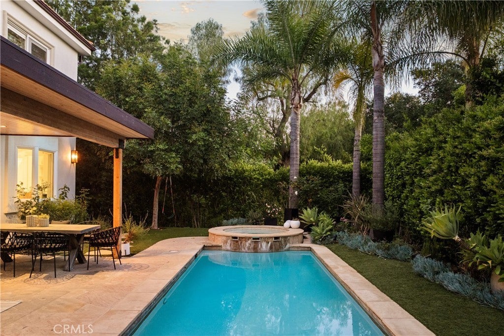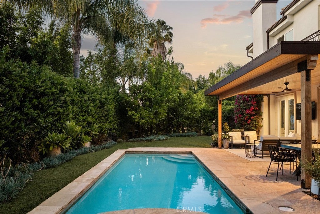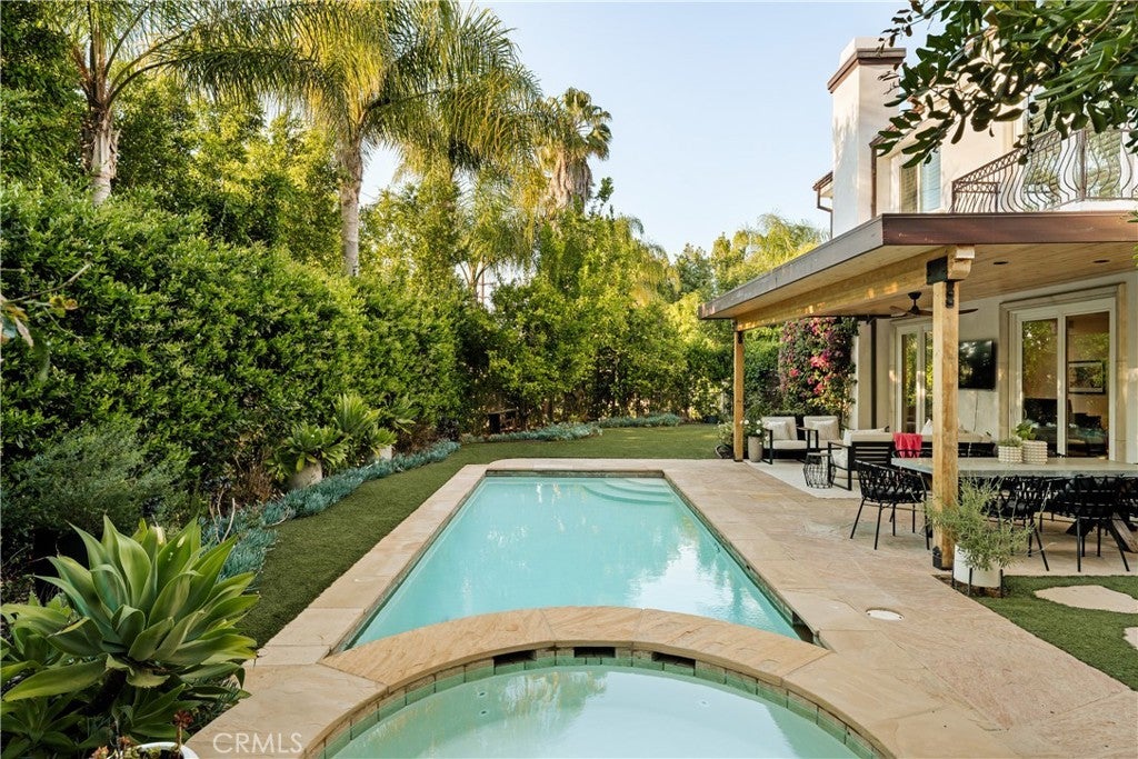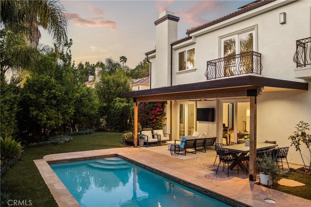 Situated within an exclusive gated enclave of just four homes with no HOA in Calabasas, this 5-bedroom, 4.5-bathroom residence offers approximately 4,365 square feet of light-filled living on an 8,654 square foot lot. A warm, inviting entry leads into interiors defined by soaring ceilings, arched architectural details, and expansive windows that fill the home with natural light. The layout is both functional and refined, with formal living and dining spaces complemented by an open-concept family room featuring custom built-ins and a fireplace. The updated kitchen is designed for everyday living and entertaining alike, with white cabinetry, generous counter space, a central island that opens seamlessly to the main living areas, and the added benefit of solar panels for enhanced energy efficiency. The main level includes a guest suite, laundry room, and a converted bonus room offering flexible use as an office, gym, media room, or playroom, along with direct access to the attached two-car garage equipped with a Tesla EV charging plug. Upstairs, the primary suite offers a true retreat, featuring vaulted ceilings, a fireplace sitting area, and private balcony access. The spa-inspired bathroom is complete with dual vanities, a soaking tub, and a glass-enclosed shower, creating a calm, resort-like feel. Additional bedrooms are spacious and well-appointed. The backyard is designed for effortless indoor-outdoor living, featuring a covered patio with wood-paneled ceiling, a pool and elevated spa, multiple lounging and dining areas, and lush, mature landscaping that provides both privacy and a serene setting. Ideally located just minutes from The Commons at Calabasas, offering premier shopping, dining, and entertainment, as well as scenic hiking and outdoor recreation in Malibu Creek State Park. With convenient access to Malibu beaches and nearby freeways, the home provides both everyday convenience and a true Southern California lifestyle. Located within the highly regarded Las Virgenes Unified School District, this home offers a rare combination of space, comfort, and prime Calabasas living.