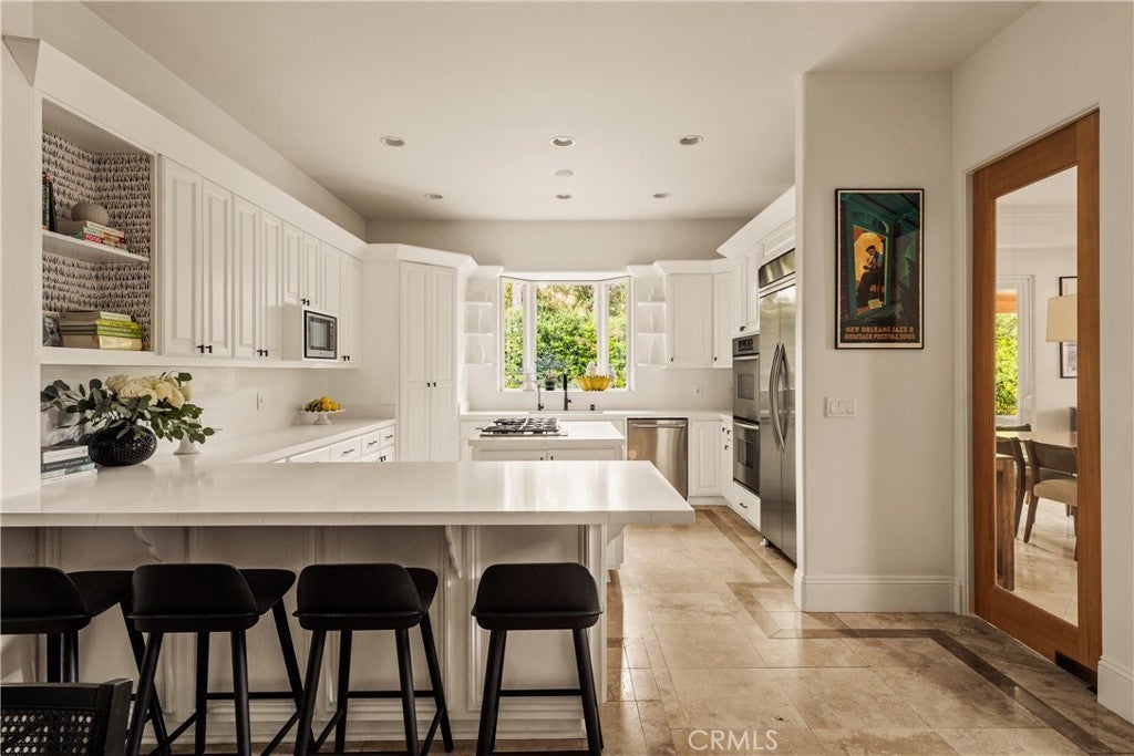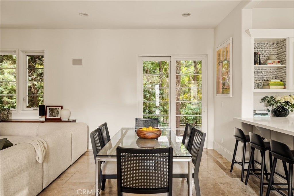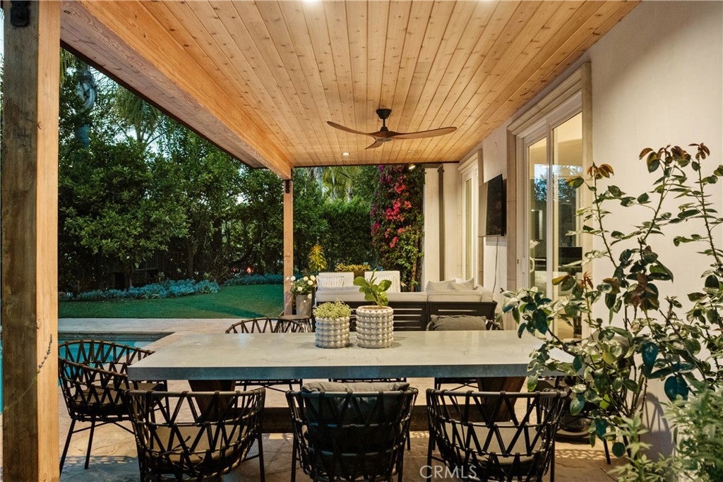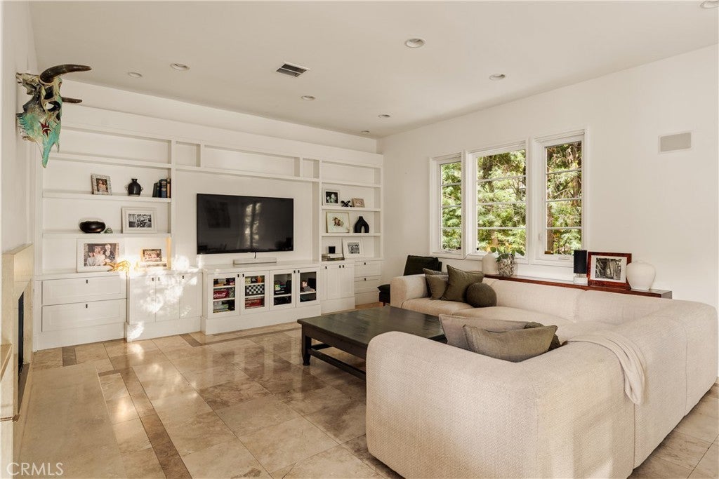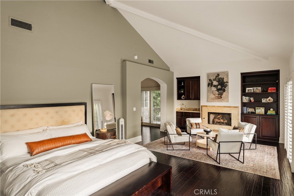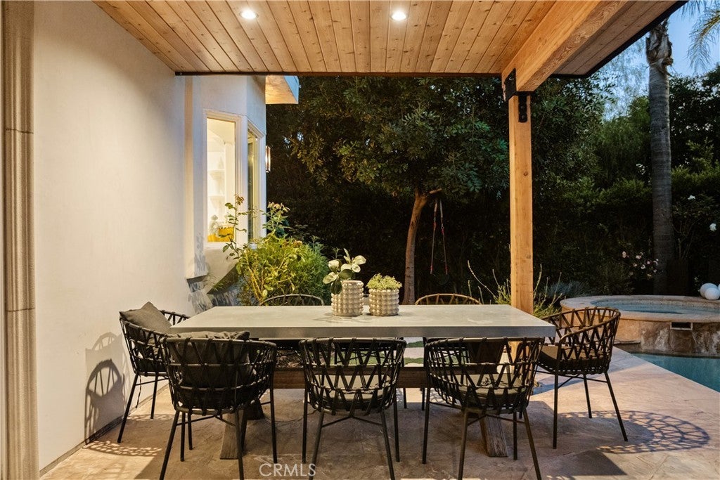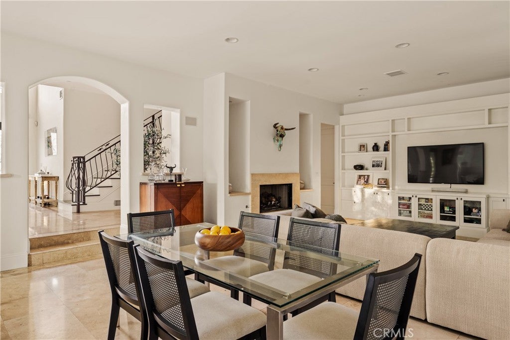 Situated within an exclusive gated enclave of just four homes with no HOA in Calabasas, this 5-bedroom, 4.5-bathroom residence offers approximately 4,365 square feet of light-filled living on an 8,654 square foot lot. A warm, inviting entry leads into interiors defined by soaring ceilings, arched architectural details, and expansive windows that fill the home with natural light. The layout is both functional and refined, with formal living and dining spaces complemented by an open-concept family room featuring custom built-ins and a fireplace. The updated kitchen is designed for everyday living and entertaining alike, with white cabinetry, generous counter space, a central island that opens seamlessly to the main living areas, and the added benefit of solar panels for enhanced energy efficiency. The main level includes a guest suite, laundry room, and a converted bonus room offering flexible use as an office, gym, media room, or playroom, along with direct access to the attached two-car garage equipped with a Tesla EV charging plug. Upstairs, the primary suite offers a true retreat, featuring vaulted ceilings, a fireplace sitting area, and private balcony access. The spa-inspired bathroom is complete with dual vanities, a soaking tub, and a glass-enclosed shower, creating a calm, resort-like feel. Additional bedrooms are spacious and well-appointed. The backyard is designed for effortless indoor-outdoor living, featuring a covered patio with wood-paneled ceiling, a pool and elevated spa, multiple lounging and dining areas, and lush, mature landscaping that provides both privacy and a serene setting. Ideally located just minutes from The Commons at Calabasas, offering premier shopping, dining, and entertainment, as well as scenic hiking and outdoor recreation in Malibu Creek State Park. With convenient access to Malibu beaches and nearby freeways, the home provides both everyday convenience and a true Southern California lifestyle. Located within the highly regarded Las Virgenes Unified School District, this home offers a rare combination of space, comfort, and prime Calabasas living.
