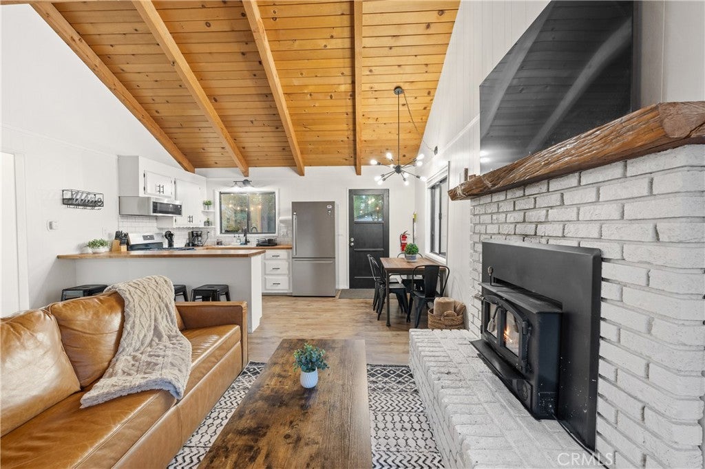 Cozy Mountain Cabin: Your Turnkey Retreat Awaits! Escape to your perfect mountain getaway in this charming, recently remodeled cabin, ideally situated less than a mile from Snow Summit! Every detail has been meticulously updated, offering a truly turnkey experience for relaxation and adventure. Step inside and be greeted by vaulted ceilings that enhance the spacious feel of this 660 sq ft gem. The all-new flooring creates a seamless flow throughout the inviting living space. The brand-new kitchen is a delight, boasting new appliances that are ready for your culinary creations. This cozy cabin features two comfortable bedrooms and a pristine, updated bathroom. Enjoy peace of mind with a newer heater and water heater, ensuring comfort in all seasons. The exterior is just as impressive as the interior, with fresh paint that enhances its curb appeal. An outdoor deck provides the perfect spot for morning coffee or evening stargazing, surrounded by the tranquility of nature. The convenience of a newly paved driveway and walkway adds to the ease of mountain living. Nestled on a double-sized 5,000 sq ft lot, you'll have ample space for outdoor enjoyment. With its prime location and extensive upgrades, this cabin is an exceptional opportunity to own your slice of mountain paradise. Don't miss out!