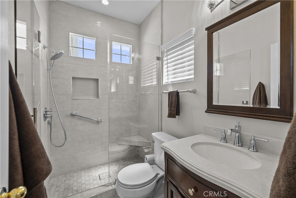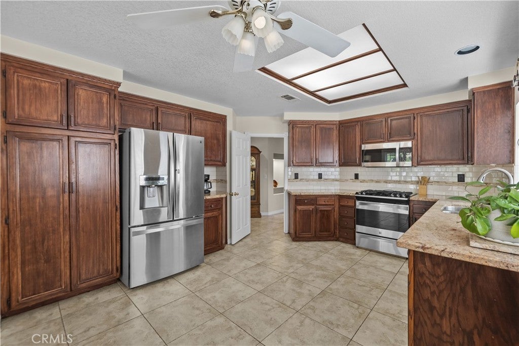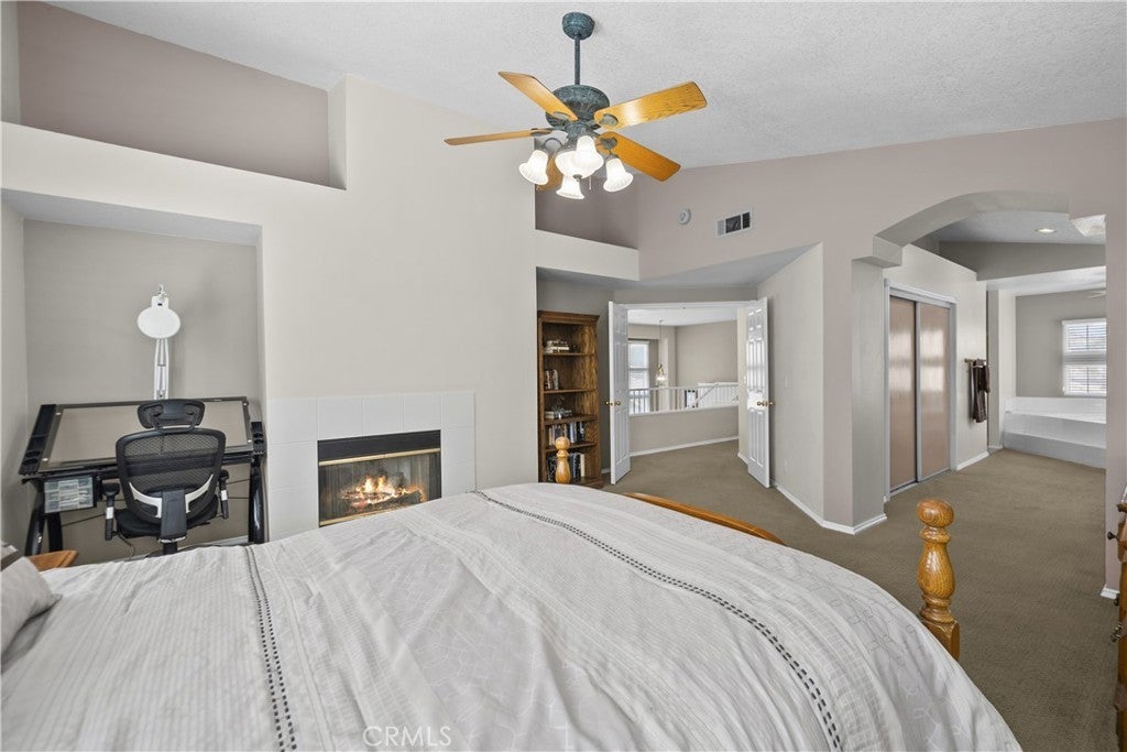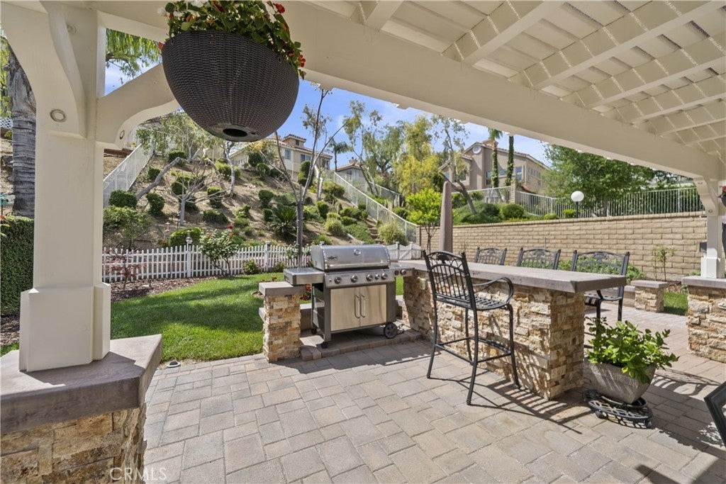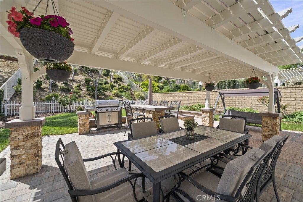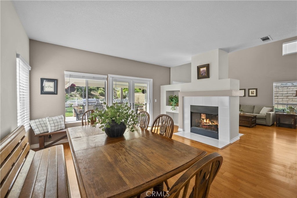 Welcome to this beautifully upgraded 4-bedroom, 3-bathroom home in the desirable Montecito community of Santa Clarita, ideally located just off the 14 Freeway and near Golden Valley shopping, dining, and everyday conveniences. Offering approximately 2,291 sq ft on an 8,121 sq ft lot, this home features a full bedroom and bathroom downstairs, soaring ceilings, abundant natural light, and a functional, inviting layout. The living and dining areas feature a dual-sided fireplace, creating a warm and connected space for entertaining. The updated kitchen showcases granite countertops, stainless steel appliances, ample cabinetry, and flows seamlessly into the main living areas. Upstairs, the spacious primary suite features double door entry, its own fireplace, and a large ensuite bathroom with dual sinks, a soaking tub, separate walk-in shower, private water closet, and walk-in closet. Two additional bedrooms share a Jack and Jill bathroom. The backyard is a private retreat with lush landscaping, a detached pergola, built-in barbecue, and fire pit, ideal for outdoor living and entertaining. Additional highlights include wood-like flooring, neutral decor, upgraded windows and sliders, a new HVAC, owned solar, a two-car garage, and close proximity to the community pool, making this home a perfect blend of comfort, style, and convenience.