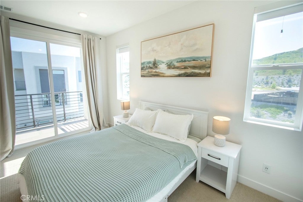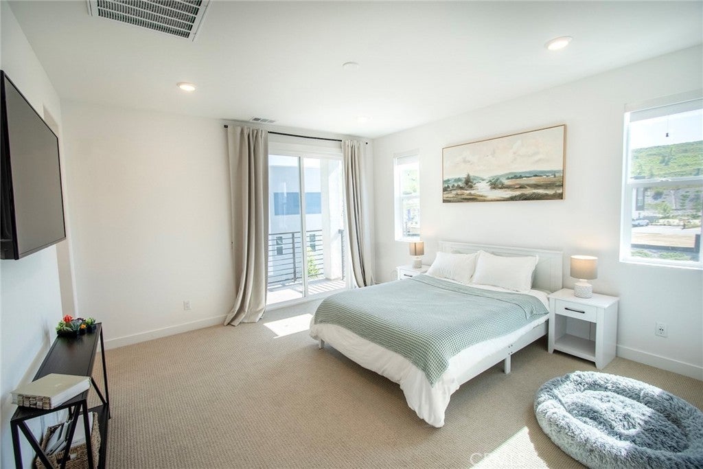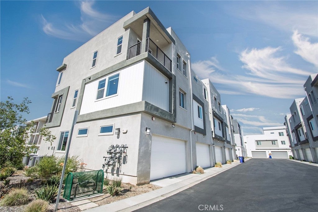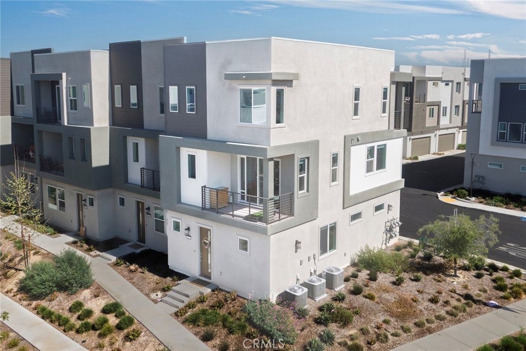 Beautiful end-unit, 3-story condo offering modern design, abundant natural light, and mountain views. The entry level features a private bedroom and full bathroom — ideal for guests, a home office, or multi-generational living — along with direct access to the attached garage. The main living level showcases a spacious open-concept great room with a large balcony overlooking the mountains, perfect for relaxing or entertaining. A generous family room and dining area flow seamlessly into the upgraded kitchen, complete with a large eat-at island, quartz countertops, soft-close cabinetry, and stainless steel appliances. A light-filled powder room is thoughtfully positioned on this level for added convenience. The third floor offers three additional well-sized bedrooms, including a spacious primary suite with an en-suite bathroom. Luxury vinyl flooring runs throughout the main living areas, adding both style and durability. Built just two years ago, this home feels fresh, clean, and move-in ready. Located in a beautifully maintained community featuring a large clubhouse, two pools, and a play area — offering both comfort and lifestyle. Solar is leased and saves your SCE bill.
