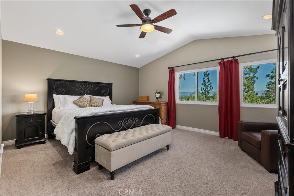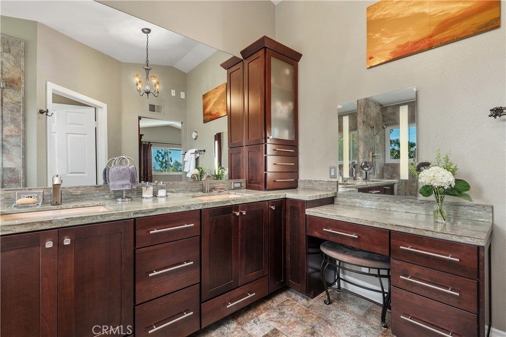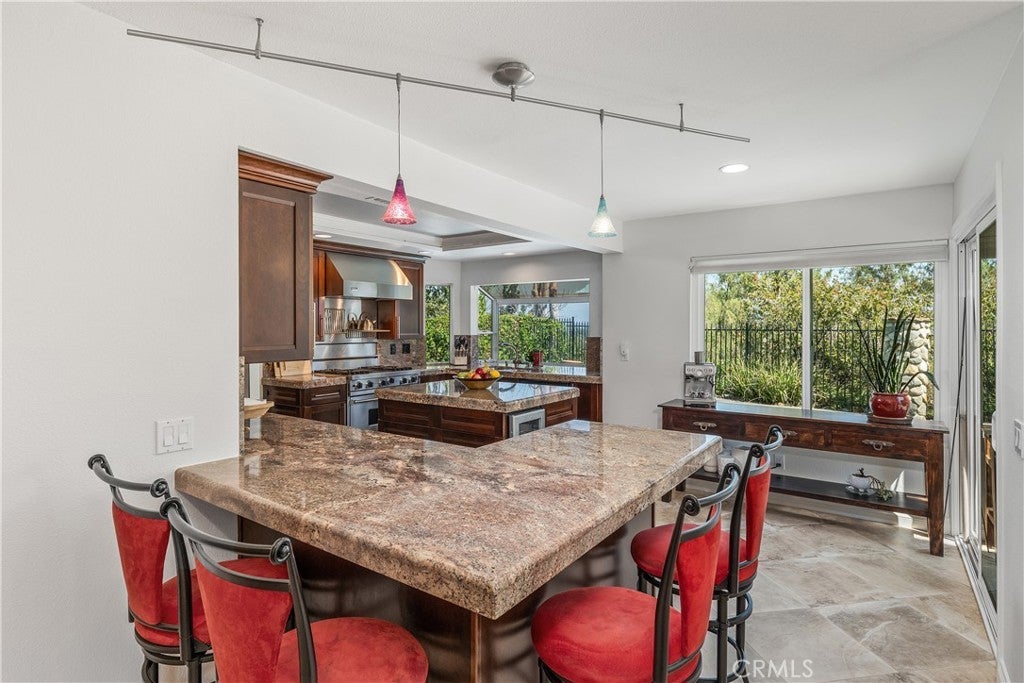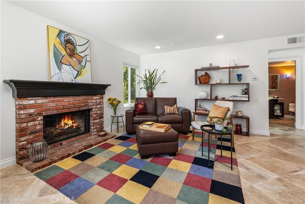 Seeking privacy, resort-style living, and breathtaking sunrise views? Welcome home! A charming covered stone porch invites you into this immaculate, freshly painted four-bedroom, three-bath residence designed for both comfort and entertaining. The living room and formal dining area showcase soaring cathedral ceilings and are complemented by a granite-topped wet bar that also serves the adjacent family room. The gourmet kitchen is a chef’s dream, featuring a Viking oven with grill and gas cooktop, microwave, beverage refrigerator, granite countertops, and a breakfast bar. The kitchen opens seamlessly to the warm and inviting family room, highlighted by a classic brick fireplace. The primary suite is a true retreat with cathedral ceilings, an expansive closet with built-ins, and a luxurious bathroom featuring marble countertops, dual sinks, and a dedicated vanity area. Upstairs, two additional bedrooms offer ceiling fans and mirrored wardrobe closets. The fourth bedroom (currently being used as an office) is conveniently located downstairs with direct access to a beautifully remodeled three-quarter bathroom—perfect for guests or multigenerational living. Throughout the home, abundant dual-pane windows flood the interiors with natural light and capture stunning views of the sunrise, mature trees, and mountains beyond. Walls of glass open to an entertainer’s backyard complete with a spacious patio, sparkling pool, and relaxing spa—ideal for indoor-outdoor living. Additional highlights include a three-car garage, an extra-large driveway with ample parking, and a prime location in a desirable West Hills neighborhood. Enjoy access to some of the finest schools in the West Valley, including El Camino Real Charter High School, Hale Charter Middle School, and Pomelo Community Charter Elementary.