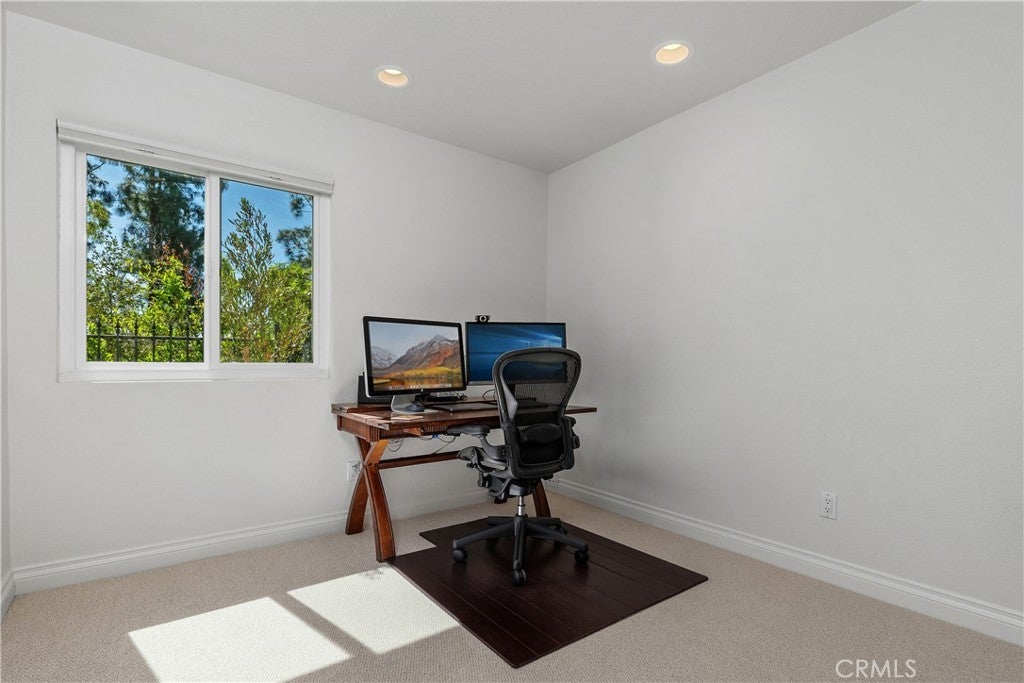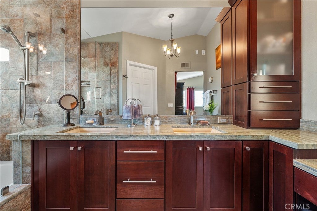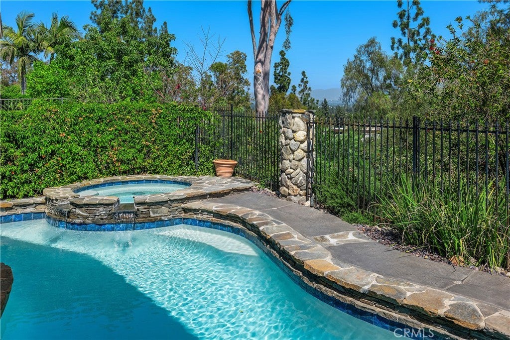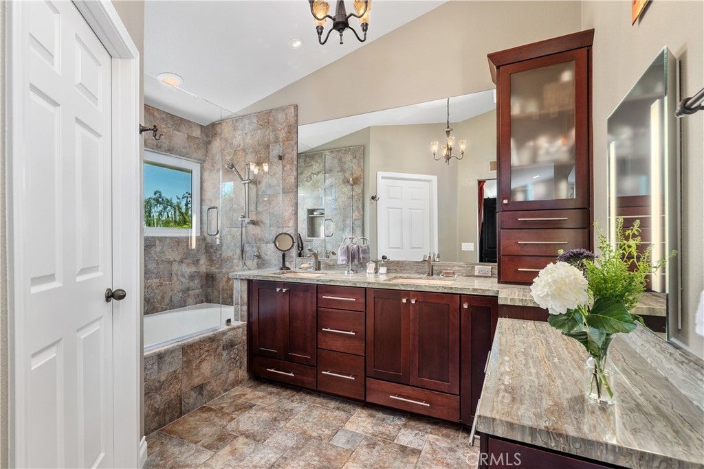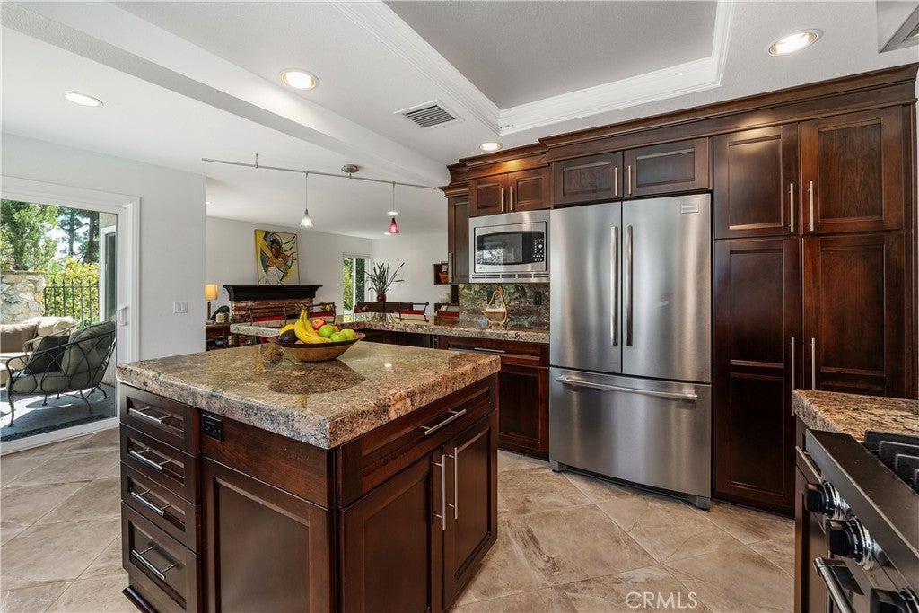 Seeking privacy, resort-style living, and breathtaking sunrise views? Welcome home! A charming covered stone porch invites you into this immaculate, freshly painted four-bedroom, three-bath residence designed for both comfort and entertaining. The living room and formal dining area showcase soaring cathedral ceilings and are complemented by a granite-topped wet bar that also serves the adjacent family room. The gourmet kitchen is a chef’s dream, featuring a Viking oven with grill and gas cooktop, microwave, beverage refrigerator, granite countertops, and a breakfast bar. The kitchen opens seamlessly to the warm and inviting family room, highlighted by a classic brick fireplace. The primary suite is a true retreat with cathedral ceilings, an expansive closet with built-ins, and a luxurious bathroom featuring marble countertops, dual sinks, and a dedicated vanity area. Upstairs, two additional bedrooms offer ceiling fans and mirrored wardrobe closets. The fourth bedroom (currently being used as an office) is conveniently located downstairs with direct access to a beautifully remodeled three-quarter bathroom—perfect for guests or multigenerational living. Throughout the home, abundant dual-pane windows flood the interiors with natural light and capture stunning views of the sunrise, mature trees, and mountains beyond. Walls of glass open to an entertainer’s backyard complete with a spacious patio, sparkling pool, and relaxing spa—ideal for indoor-outdoor living. Additional highlights include a three-car garage, an extra-large driveway with ample parking, and a prime location in a desirable West Hills neighborhood. Enjoy access to some of the finest schools in the West Valley, including El Camino Real Charter High School, Hale Charter Middle School, and Pomelo Community Charter Elementary.