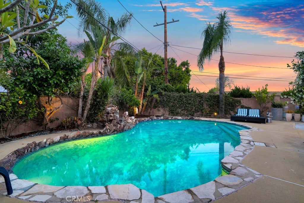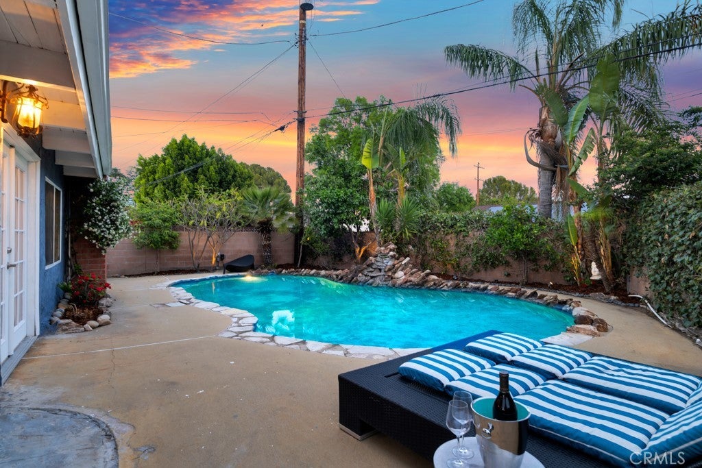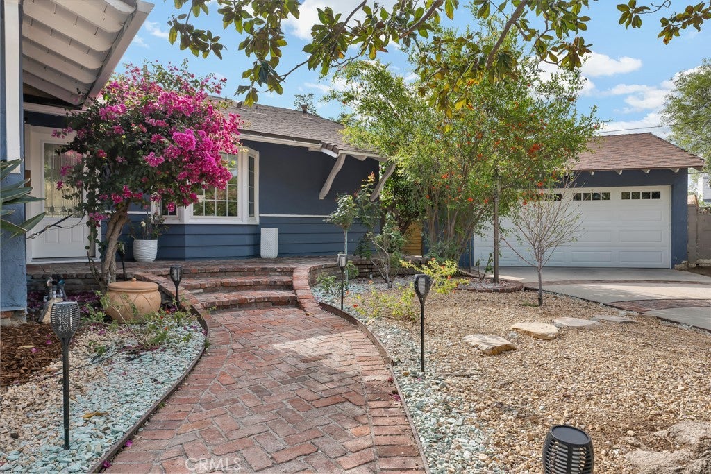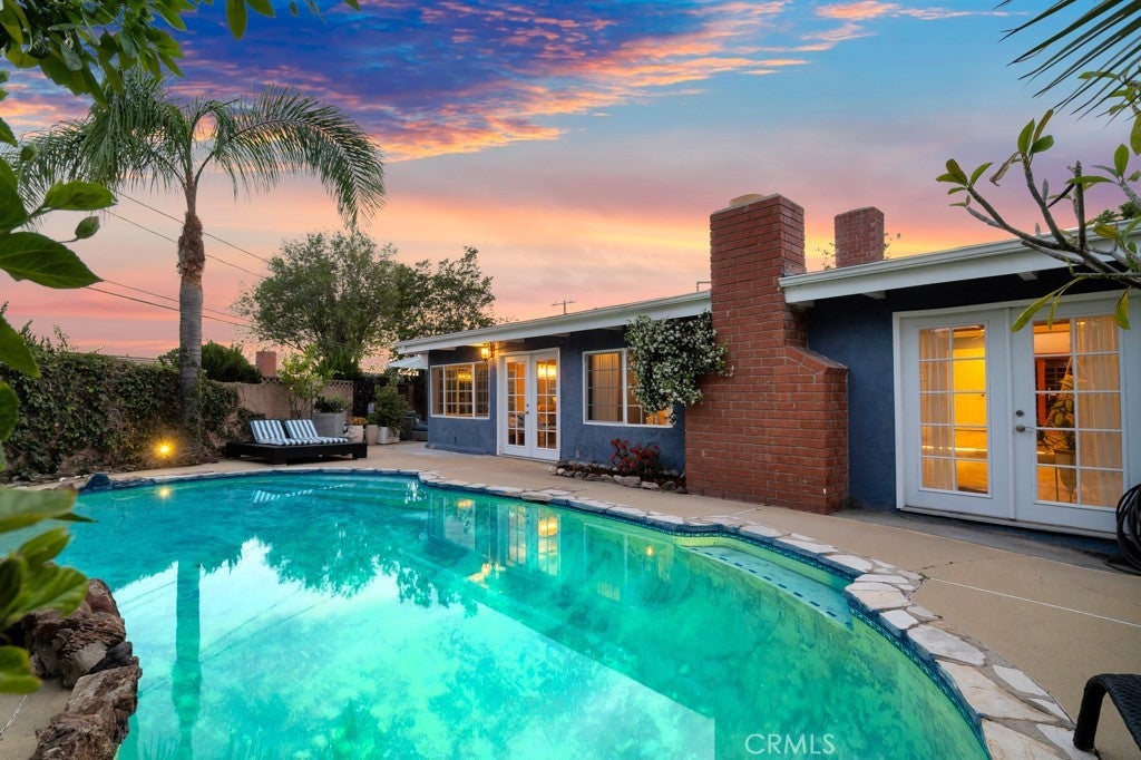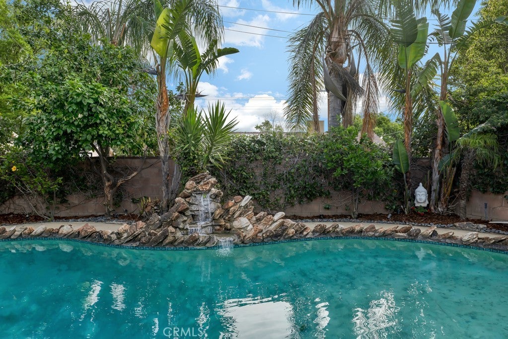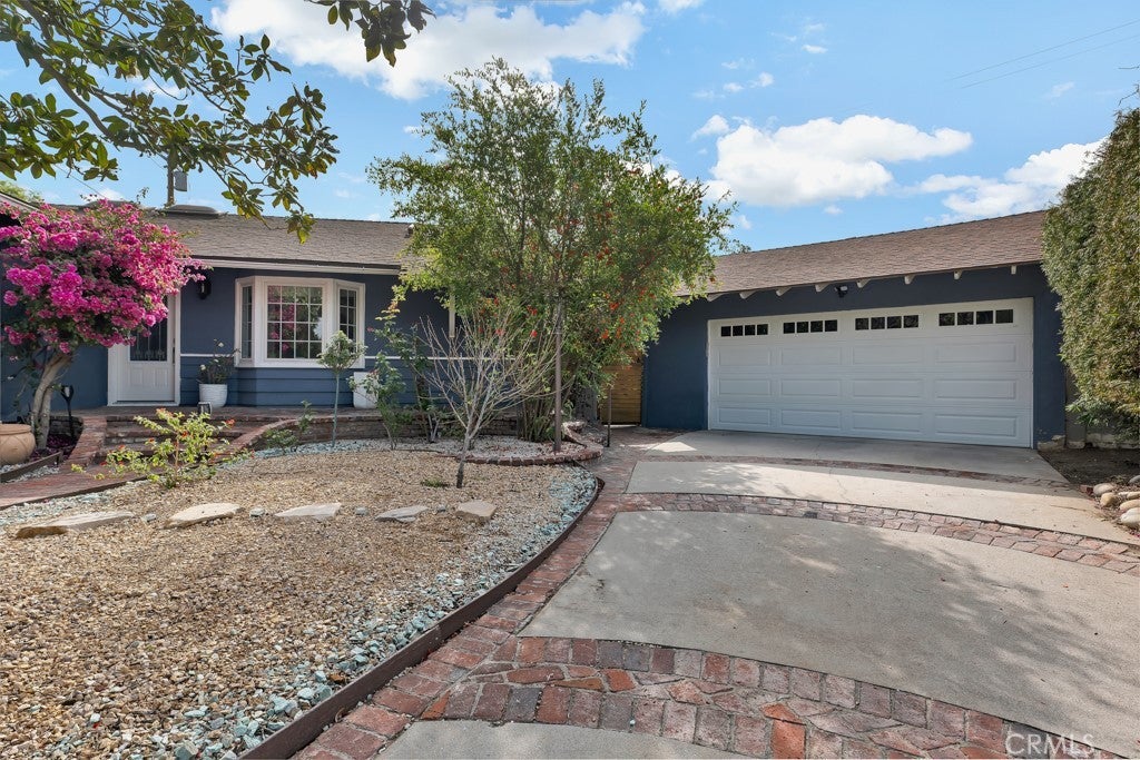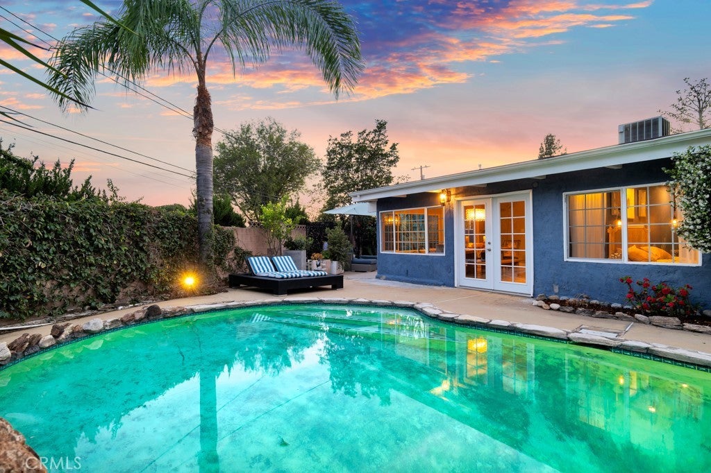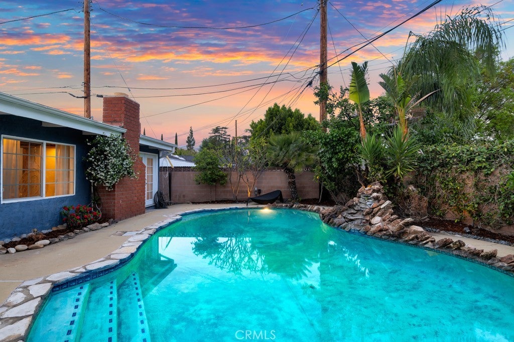 Tucked away on a quiet, tree-lined cul-de-sac in one of Granada Hills’ most desirable neighborhoods, this beautifully maintained 4-bedroom, 2-bath home offers a rare blend of privacy, charm, and resort-style living with effortless indoor-outdoor flow. Just moments from Granada Hills Charter High School, shopping, and dining, the home welcomes you with a charming entry path and expansive brick front porch shaded by a mature magnolia tree, setting the tone for the warmth and character found throughout. Light-filled interiors feature large windows and French doors, fresh updates, tasteful finishes, central HVAC, and a separate laundry room with washer and dryer included. The open-concept living and dining areas offer a fireplace, skylight, architectural details, and seamless access to the backyard, ideal for both everyday living and entertaining. The spacious kitchen is designed for function and style with vaulted ceilings, skylight, center island with seating, granite countertops, stainless steel appliances including refrigerator, dishwasher, and convection oven, and an oversized farmhouse sink overlooking the garden. The expansive primary suite provides a private retreat with a versatile bonus space perfect for a home office or wellness area, complemented by exposed wood beam ceilings, a fireplace, ambient lighting, and views of the pool and lush grounds. Step outside to a truly special setting featuring a freeform pool with waterfall, multiple seating areas, firepit, and beautifully landscaped grounds with mature greenery and a variety of fruit trees including citrus, avocado, fig, and more, creating a serene and inviting atmosphere. Additional highlights include two spa-inspired bathrooms, one with a rain shower and one with a soaking tub, a flexible bedroom currently used as a custom wardrobe space, a fourth bedroom with bay window and en-suite bath, a 2-car garage, and driveway parking. Partial furnishings may be available. This is a rare opportunity to live in a home that offers character, privacy, and a true sense of retreat—an inviting space designed for comfort, connection, and everyday enjoyment.