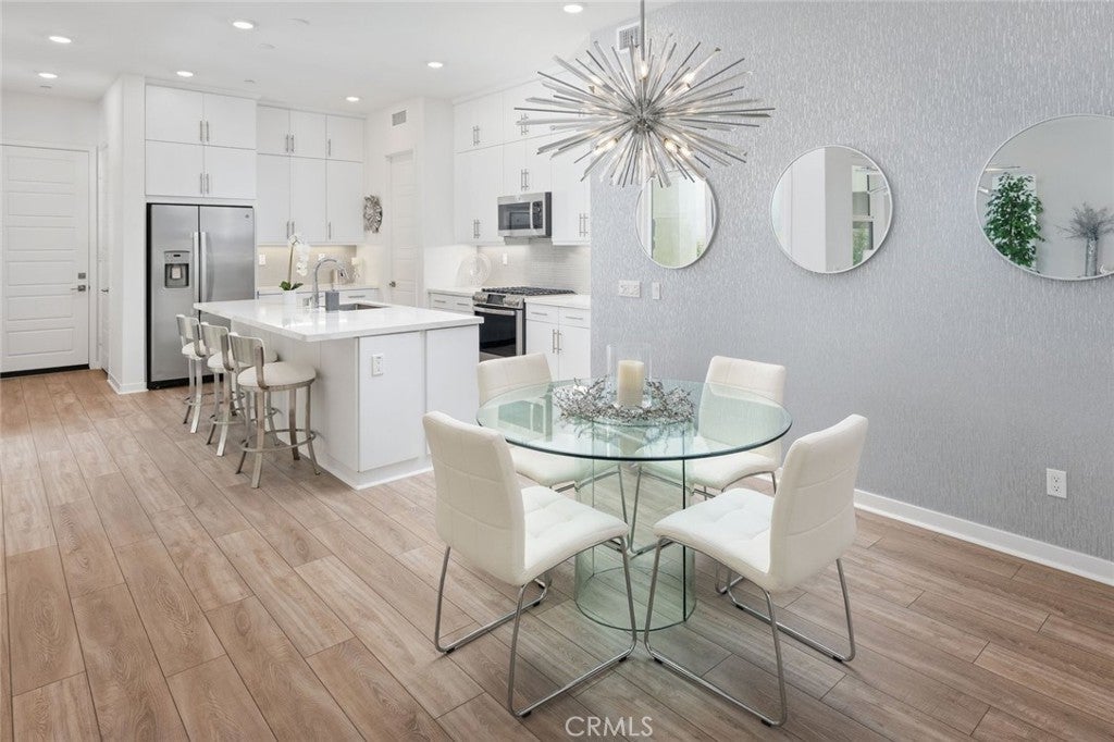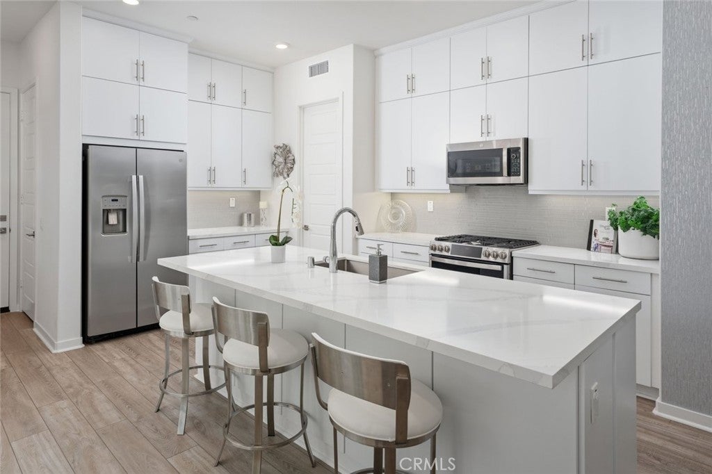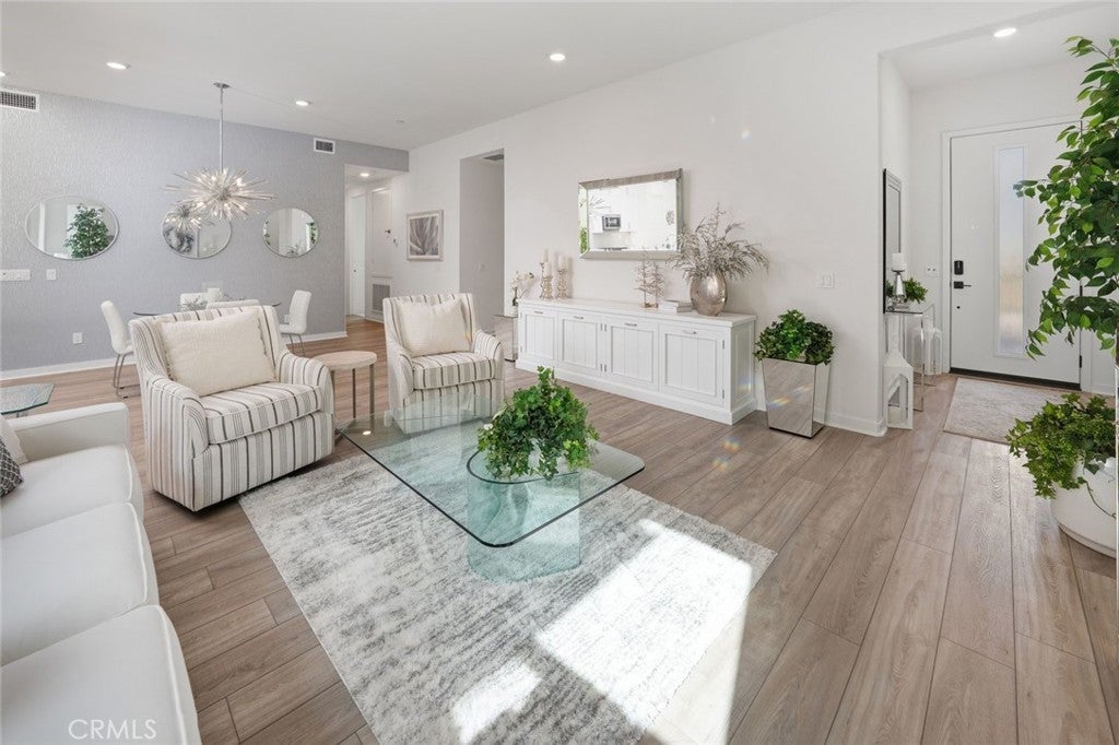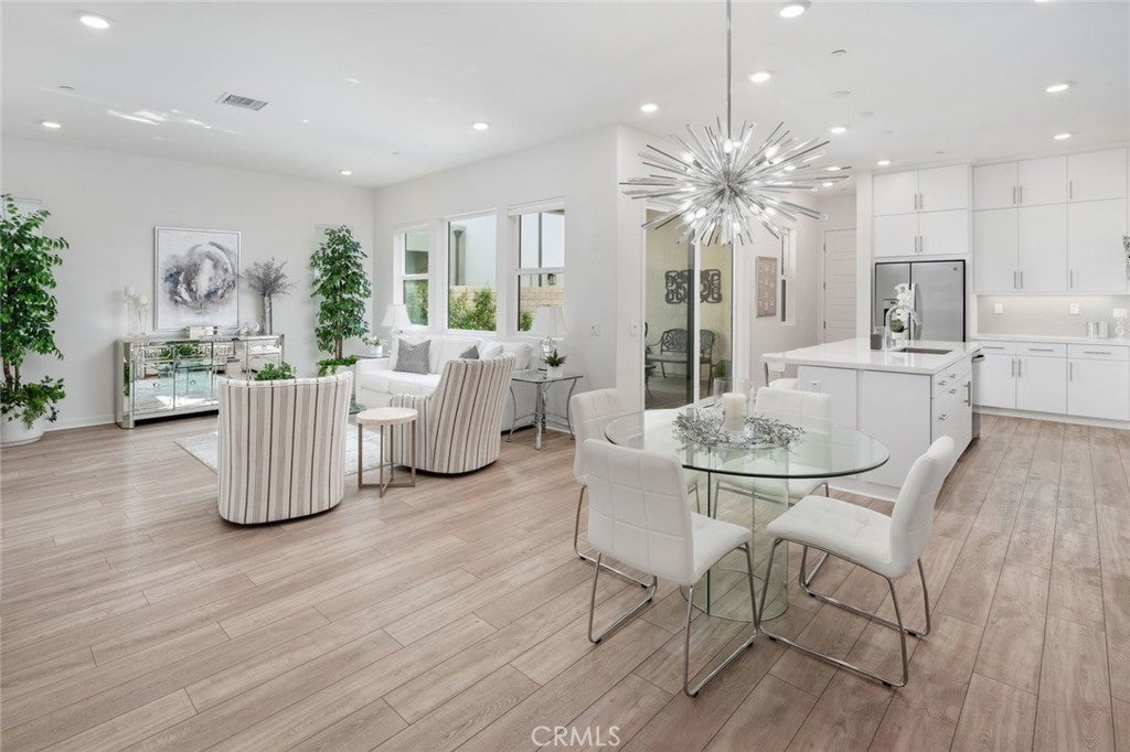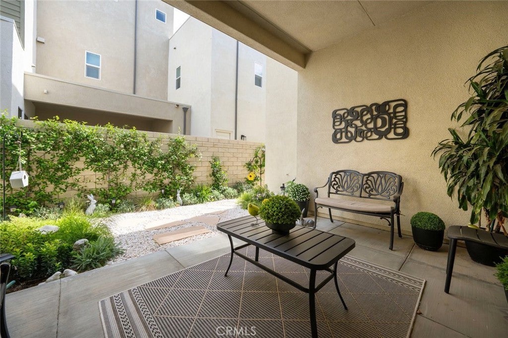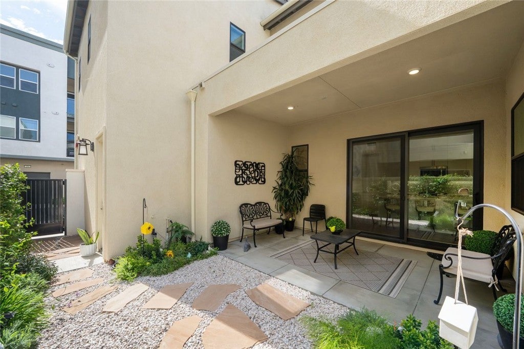 Absolutely stunning and rare 3 bed, 2 bath ground floor SINGLE STORY home in the highly sought after Rowan collection in Valencia's coveted FivePoint community. Beautifully appointed modern home featuring an open-concept floor plan with high ceilings, large picture windows, luxury vinyl plank flooring, and tons of designer upgrades. Can be purchased fully furnished! Step inside to the large living room bathed in natural light with views of the lovely courtyard through the oversized picture windows. The bright and airy living area flows seamlessly into the dining space featuring a beautiful feature wall and eye-catching chandelier. The gourmet kitchen is an entertainer's dream, showcasing quartz countertops, a huge island, designer backsplash, beautiful white cabinetry with brushed nickel hardware, a walk-in pantry, and high end stainless-steel appliances. From the kitchen, step through sliding glass doors to the charming and spacious covered courtyard - perfect for relaxing or outdoor get togethers. The primary suite offers plush carpeting, recessed lighting, custom window coverings, a generous walk-in closet, and a luxurious en-suite bathroom with dual quartz vanities and a walk-in shower. Two additional bedrooms include large closets, custom window coverings and abundant natural light. The full guest bath also features dual vanities, quartz counters, and a tub/shower combination. Additional highlights include a dedicated laundry room, attached two-car garage, and owned solar panels for enhanced energy efficiency. Residents of the FivePoint community enjoy resort-style amenities such as multiple pools, spas, cabanas, parks, walking trails, a recreation center, dog park, community garden, and a popular Sunday Farmer’s Market. Conveniently located near shopping, dining, and the 5 Freeway yet tucked away in a quiet community, this exceptional residence offers the perfect blend of elegance, comfort and convenience.