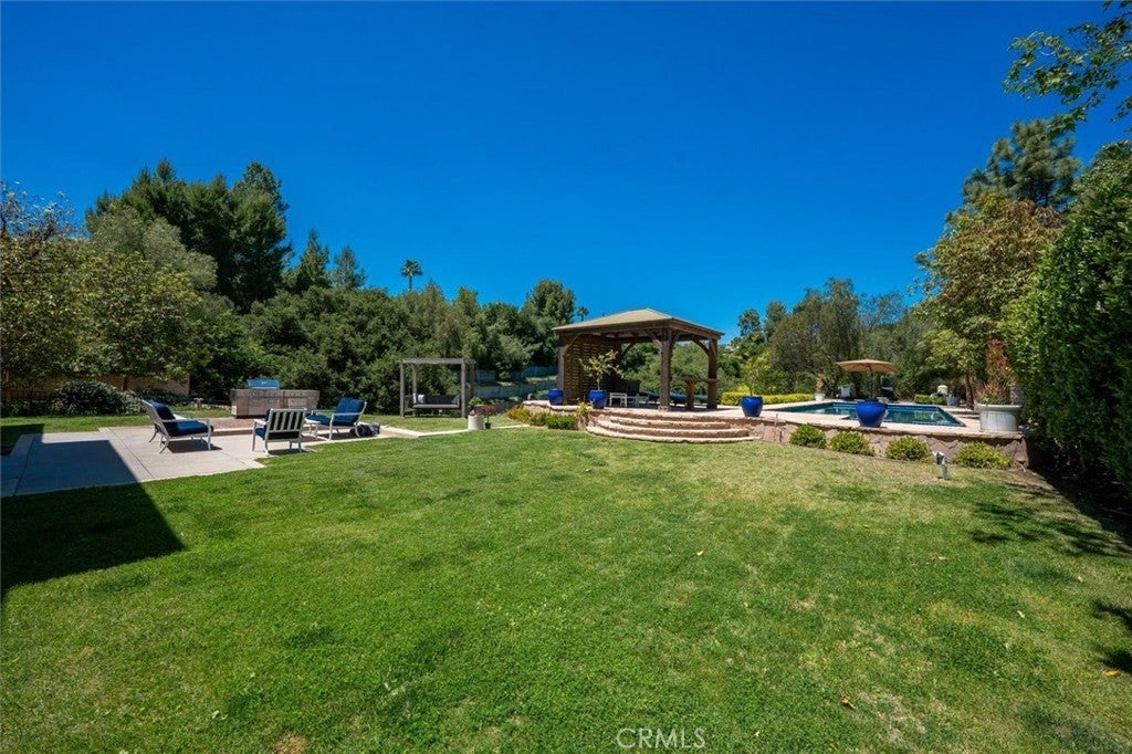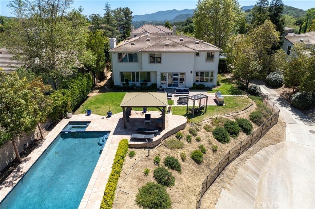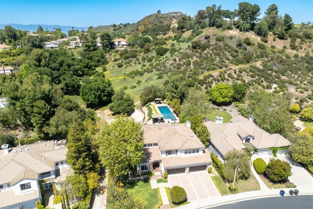 INCREDIBLE VALUE! Tucked away within the prestigious guard-gated enclave of Summit Point Estates, this exquisite five-bedroom, four-and-a-half-bath residence offers the perfect blend of timeless elegance and modern luxury. Situated at the end of a peaceful cul-de-sac, the home welcomes you with a stately double-door entrance that opens to soaring 30-foot ceilings and a bright, thoughtfully designed floor plan ideal for both refined entertaining and everyday living. The grand formal living and dining rooms exude sophistication, seamlessly flowing into a chef's dream kitchen—beautifully appointed with dual center islands, top-of-the-line Thermador appliances, and an abundance of custom French country cabinetry. The adjacent family room, anchored by a cozy gas fireplace, offers a warm and inviting ambiance, while the charming breakfast island provides the perfect spot for casual dining. A well-appointed guest suite with a private bath completes the main level, ideal for visiting family or friends. Upstairs, the expansive primary retreat features a serene sitting area, dual walk-in closets, and a luxurious en-suite bath with double vanities, soaking tub, and separate shower. Three additional bedrooms—two sharing a Jack-and-Jill bath and one with a private en-suite—provide ample space for family or guests. Walls of glass open to the resort-inspired backyard, where lush landscaping surrounds a sparkling pool and spa, expansive lawn, and covered patio—offering an idyllic setting for entertaining or tranquil relaxation. A finished four-car garage, complete with a 220-volt EV charger, adds to the home's exceptional amenities. Located in the scenic Santa Monica Mountains, just minutes from hiking trails, premier shopping and dining at The Village, and the iconic beaches of Malibu—this is California living at its finest.