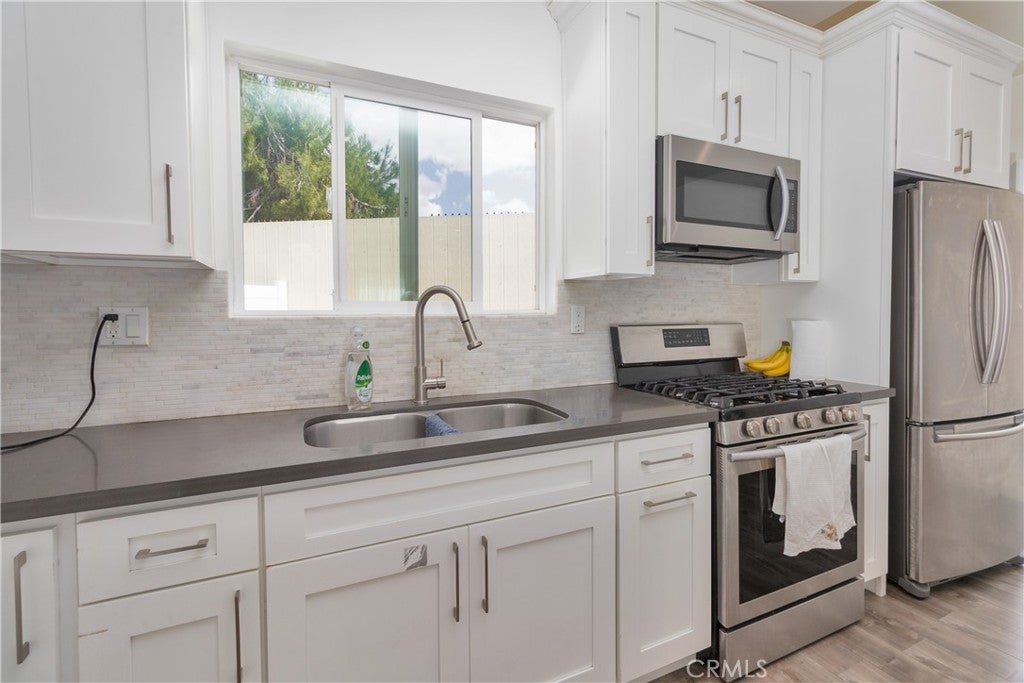 Nestled on a deep, gated lot in the heart of Van Nuys, 14648 Covello St is a warm, move in ready retreat with a versatile ADU and inviting outdoor spaces perfect for entertaining. A charming front yard shaded by mature trees and lush landscaping leads to the single story main residence, offering 3 comfortable bedrooms and 2 thoughtfully updated baths. Inside, you’ll find an open concept living and dining area with recessed lighting and wood style floors that flow into a modern chef’s kitchen featuring crisp white cabinetry, stone countertops, and stainless-steel appliances. The spacious primary suite enjoys generous closet space and an updated en suite bath, while the secondary bedrooms are ideal for family, guests, or a home office. French doors open to an expansive covered patio that functions as an outdoor living and dining room, overlooking an impressive backyard with fruit trees, garden areas, and plenty of room for play or entertaining. The detached ADU offers additional living space with its own entrance, kitchen, bath, and parking area, perfect for multigenerational living or continued rental income. Located in central Van Nuys, this property provides quick access to the 405 and 101 freeways, the Metro G Line, and a growing array of neighborhood shops and eateries, delivering excellent value for its size and flexibility. Whether you’re seeking a private compound, an income opportunity, or room to grow, this inviting property is a rare find in the San Fernando Valley.