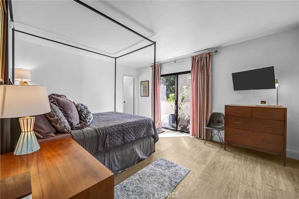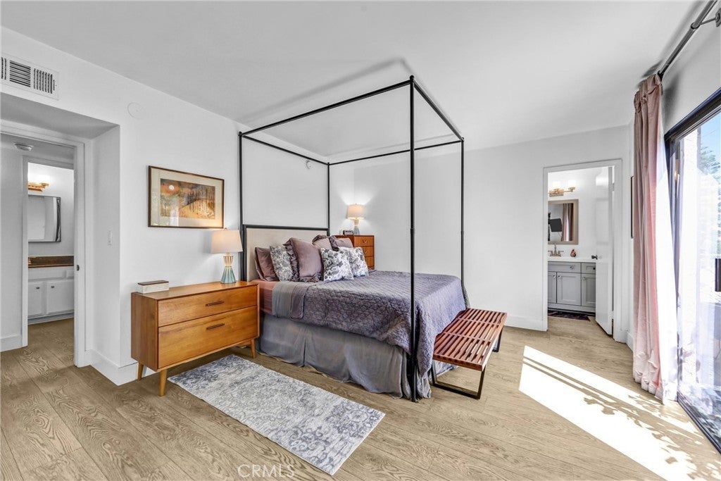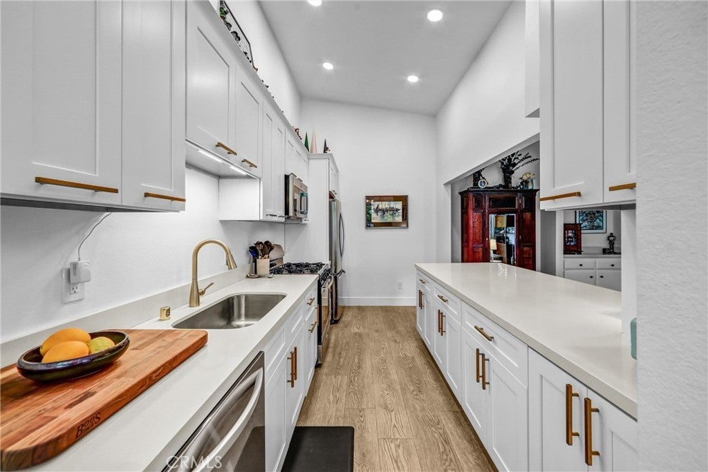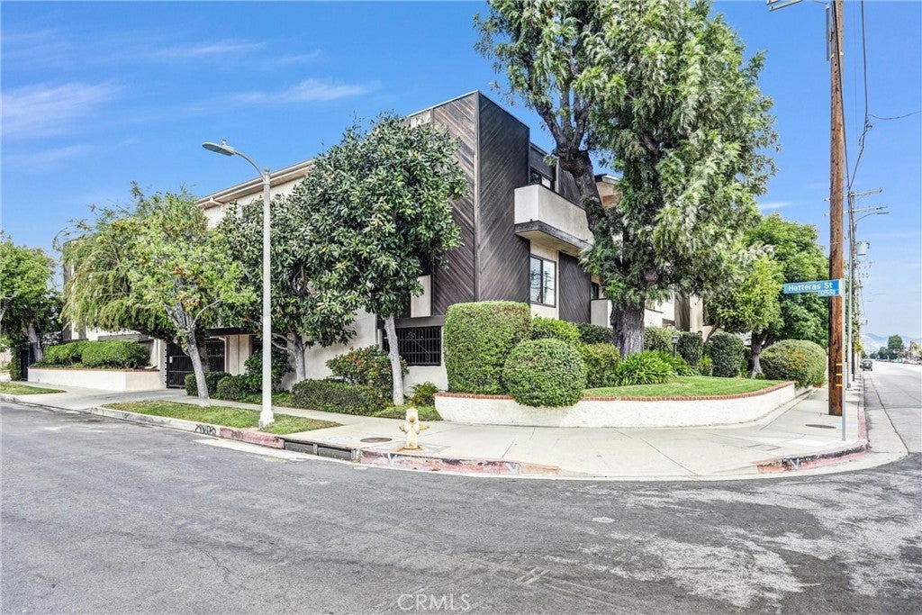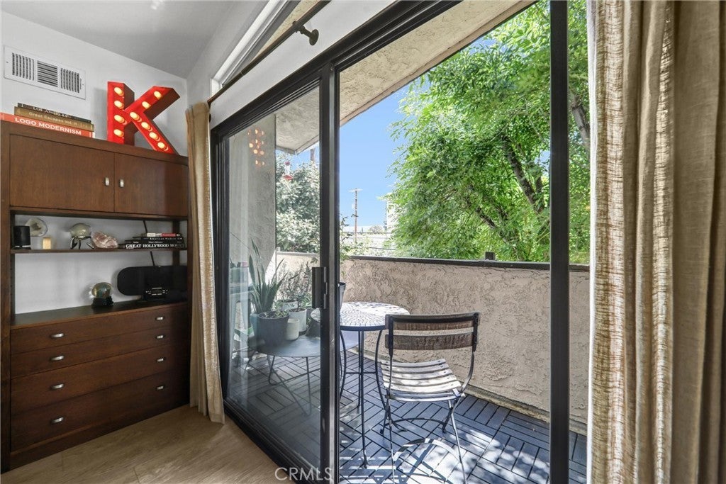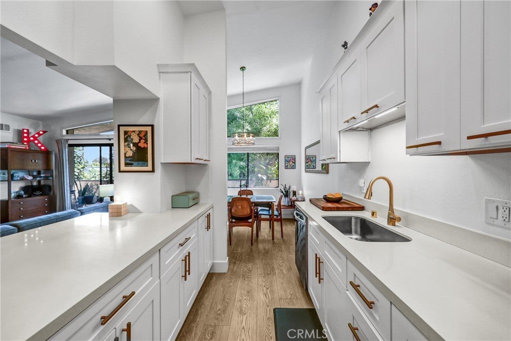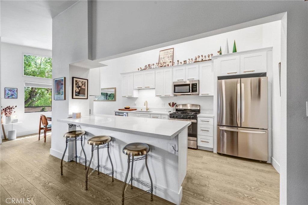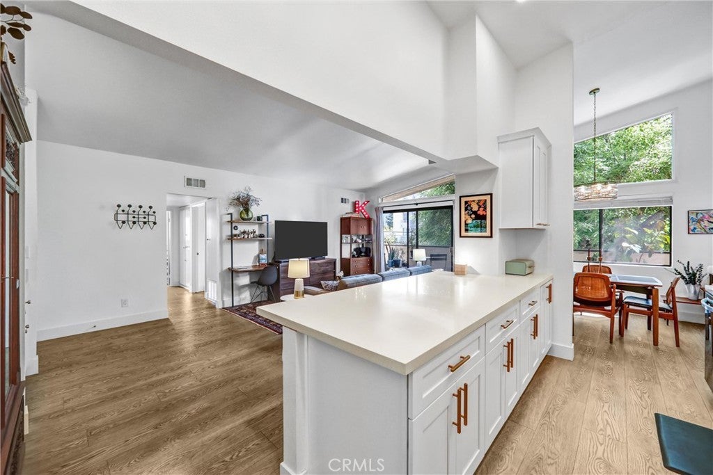 Beautifully Renovated Top Floor Condo with Soaring Ceilings & Lush Tree-Top Views. Welcome to this stunning 2 bedrooms, 2 bathrooms unit that perfectly blends modern design with warm, eclectic character. Dramatic vaulted ceilings and an open-concept floor plan create an airy, light-filled living space that immediately impresses. The kitchen is a showstopper, featuring crisp white shaker cabinetry with gold hardware, quartz countertops, stainless steel appliances including a gas range, and a generous breakfast bar peninsula — ideal for entertaining. galley-style prep kitchen offers exceptional additional counter and storage space rarely found in condo living. The spacious living area flows seamlessly to a private balcony enveloped by mature trees, offering a serene, garden-like retreat perfect for morning coffee or evening relaxation. The primary suite is a true sanctuary, boasting an en-suite bathroom, access to a private balcony, and beautiful wide-plank hardwood flooring that runs throughout the entire home. Additional highlights include tandem 2-car covered parking in a secured garage plus a private storage closet — a rare and coveted find. Whitsett Court is located close to the Noho Arts District, a variety of restaurants, shops, Temples, and Churches, LA Valley College, Tujunga greenbelt, and the metro station.