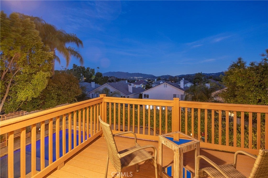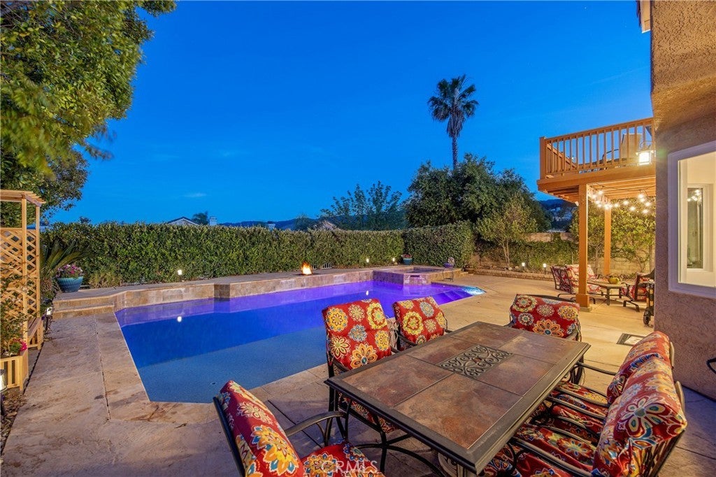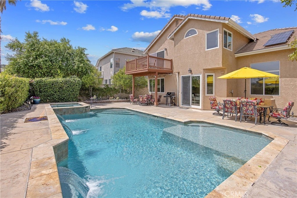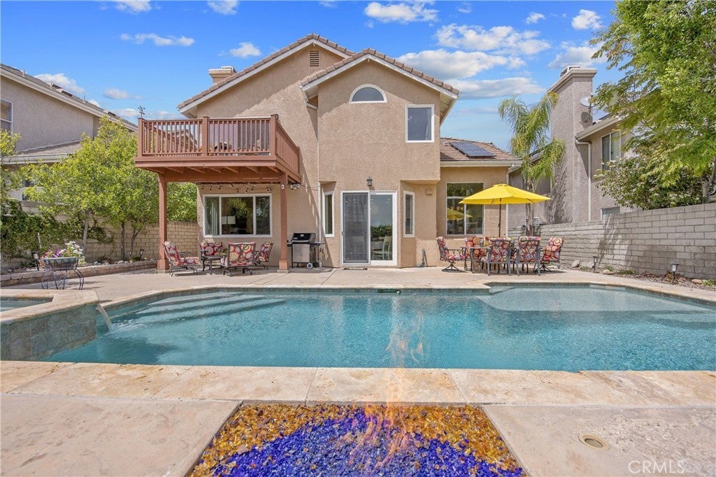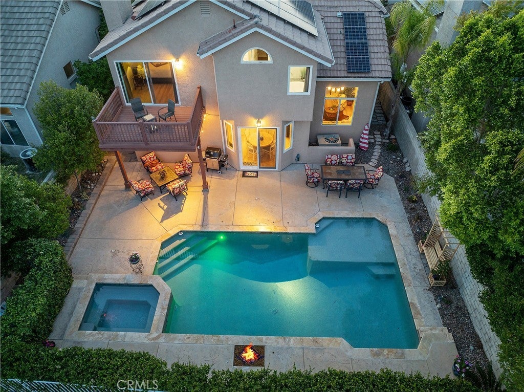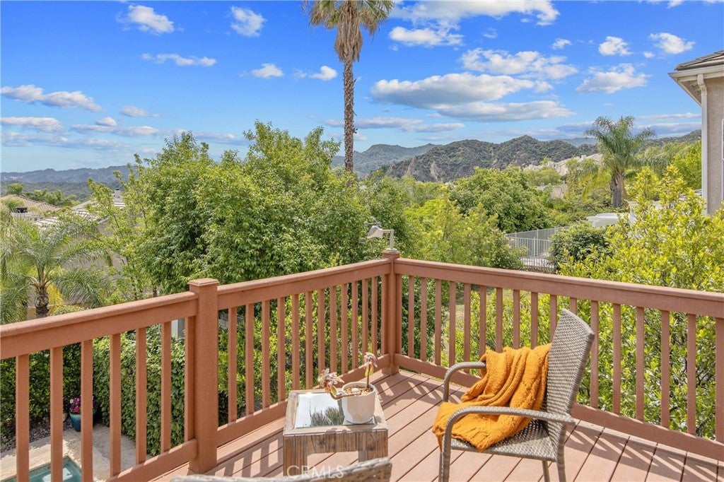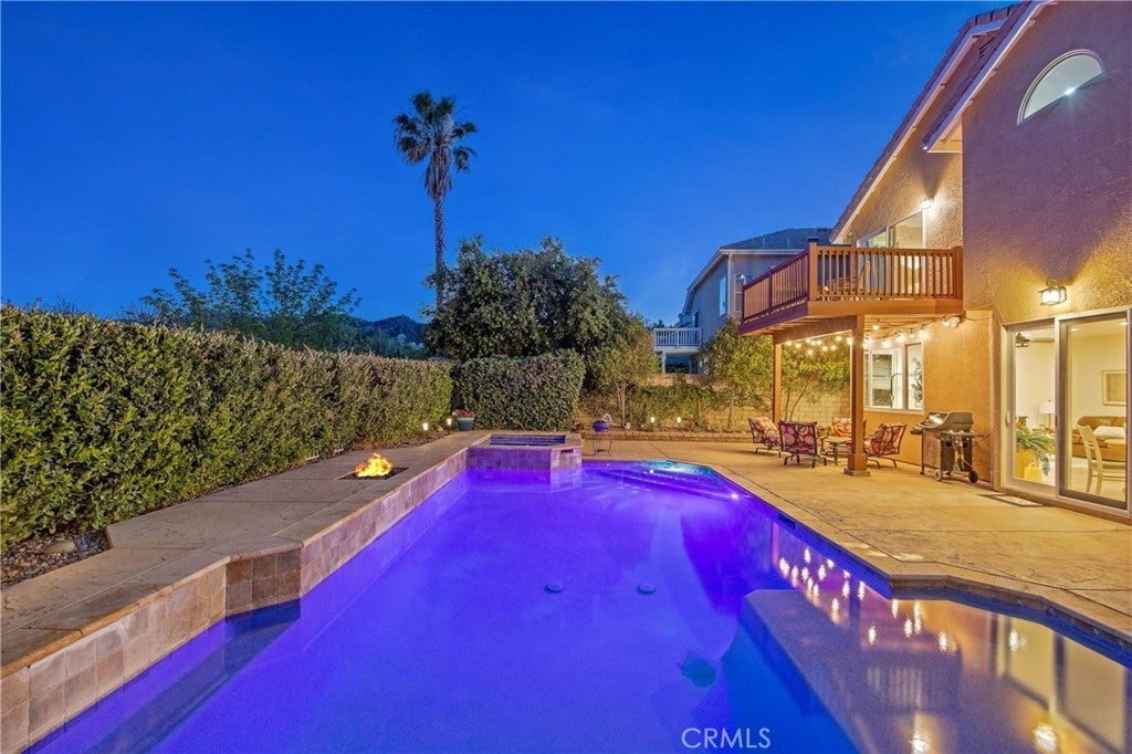 Welcome to this beautifully renovated, turnkey home nestled in the heart of Stevenson Ranch on a quiet cul-de-sac, offering privacy, stunning views, and a truly tranquil setting. This bright and airy residence features soaring vaulted ceilings and abundant natural light, creating an open and inviting atmosphere throughout. Thoughtfully updated, the home showcases new luxury vinyl plank flooring, fresh interior paint, updated baseboards, and stylish new light fixtures that bring a modern, cohesive feel. The kitchen features updated Caesarstone countertops, while all three full bathrooms have been tastefully remodeled to reflect both comfort and contemporary design. New windows throughout—including a new sliding door in the primary bedroom—enhance both natural light and energy efficiency. The flexible floor plan offers four spacious bedrooms upstairs plus an additional bedroom downstairs which is currently used as an office. Or use it as a bonus room or workout room. Downstairs also has a full bath perfect for guests or inlaws. The primary suite includes a walk-in closet and a private Trex deck—perfect for enjoying a cup of coffee on peaceful mornings and taking in the views. Step outside to your private entertainer’s backyard, complete with a custom Pebble Tec saltwater pool and spa, an in-ground fire pit, and mature landscaping that provides beauty and seclusion. Enjoy sun-filled mornings and shaded afternoons in this tranquil outdoor setting—ideal for both relaxing and hosting. Additional highlights include 32 fully paid-for solar panels, a new water heater, and a three-car garage with enclosed overhead storage. This home seamlessly blends modern upgrades, comfort, and exceptional indoor-outdoor living—ready for you to move in and enjoy.