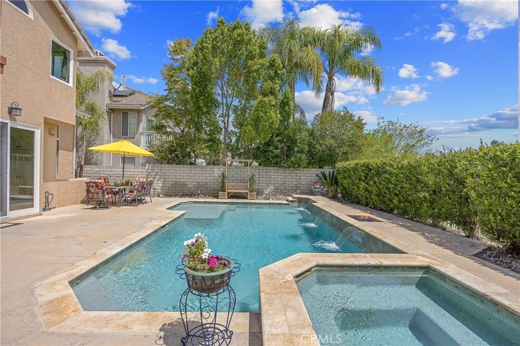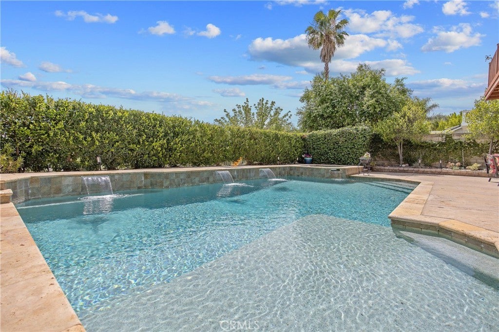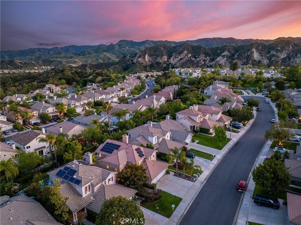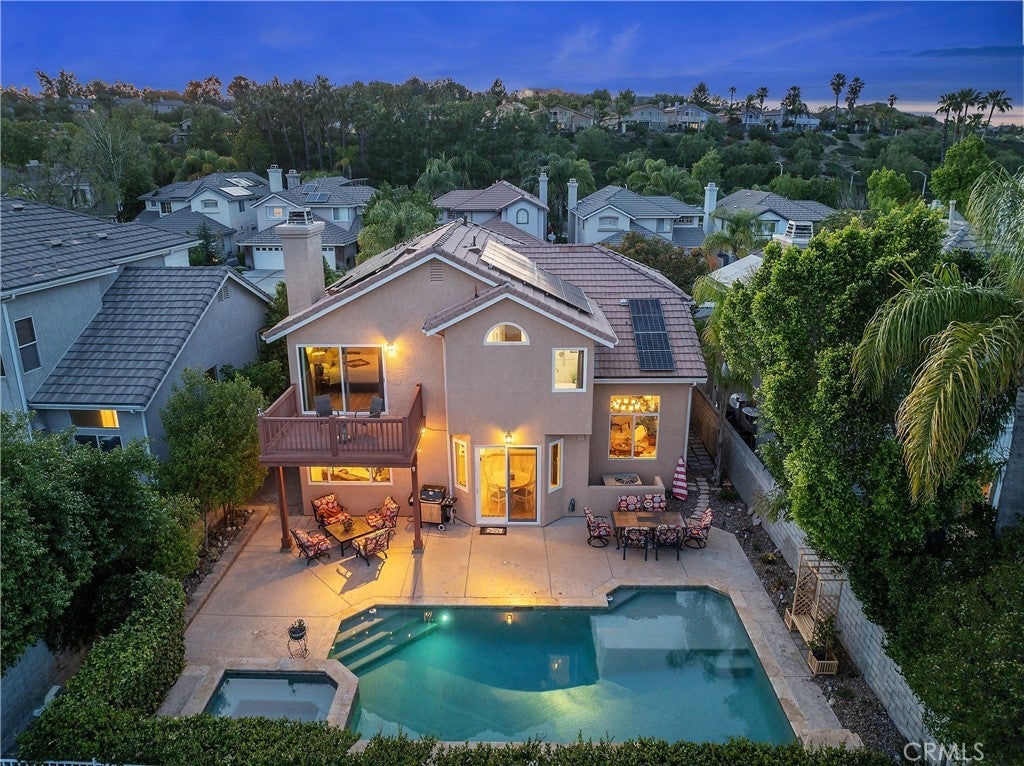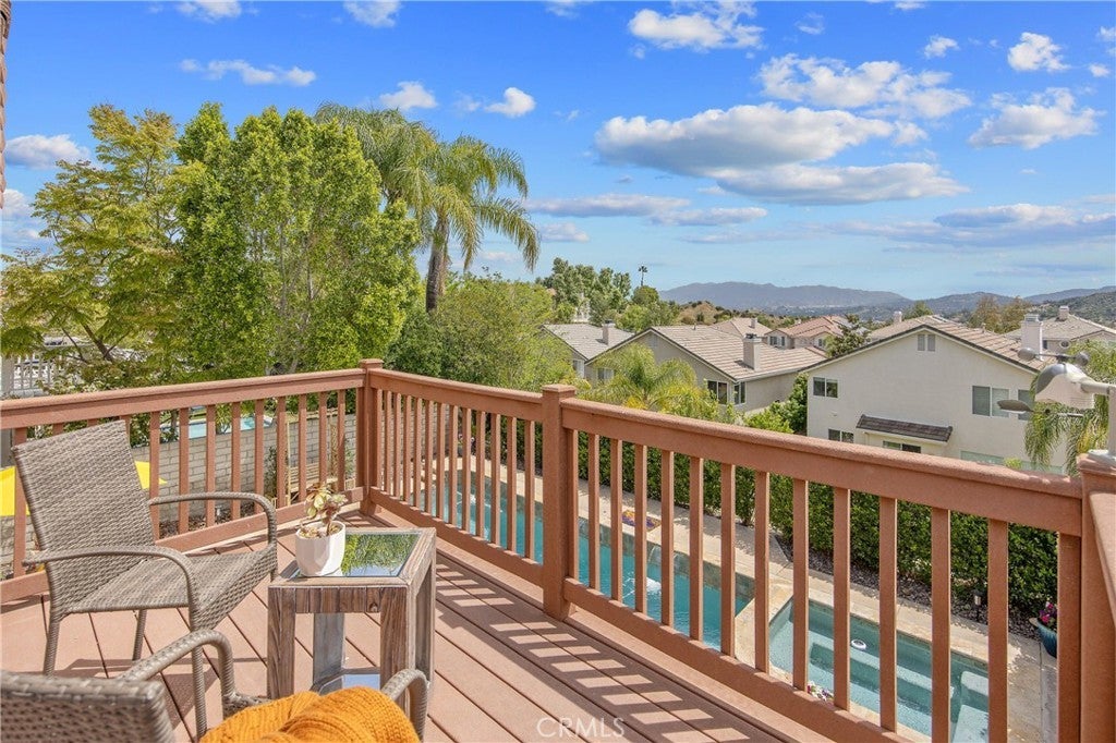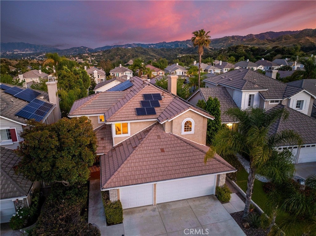 Welcome to this beautifully renovated, turnkey home nestled in the heart of Stevenson Ranch on a quiet cul-de-sac, offering privacy, stunning views, and a truly tranquil setting. This bright and airy residence features soaring vaulted ceilings and abundant natural light, creating an open and inviting atmosphere throughout. Thoughtfully updated, the home showcases new luxury vinyl plank flooring, fresh interior paint, updated baseboards, and stylish new light fixtures that bring a modern, cohesive feel. The kitchen features updated Caesarstone countertops, while all three full bathrooms have been tastefully remodeled to reflect both comfort and contemporary design. New windows throughout—including a new sliding door in the primary bedroom—enhance both natural light and energy efficiency. The flexible floor plan offers four spacious bedrooms upstairs plus an additional bedroom downstairs which is currently used as an office. Or use it as a bonus room or workout room. Downstairs also has a full bath perfect for guests or inlaws. The primary suite includes a walk-in closet and a private Trex deck—perfect for enjoying a cup of coffee on peaceful mornings and taking in the views. Step outside to your private entertainer’s backyard, complete with a custom Pebble Tec saltwater pool and spa, an in-ground fire pit, and mature landscaping that provides beauty and seclusion. Enjoy sun-filled mornings and shaded afternoons in this tranquil outdoor setting—ideal for both relaxing and hosting. Additional highlights include 32 fully paid-for solar panels, a new water heater, and a three-car garage with enclosed overhead storage. This home seamlessly blends modern upgrades, comfort, and exceptional indoor-outdoor living—ready for you to move in and enjoy.