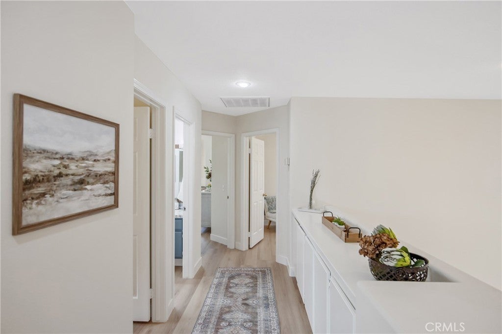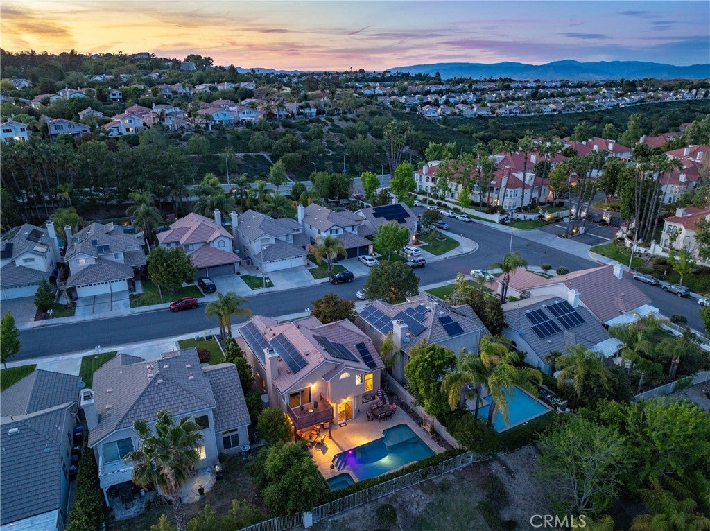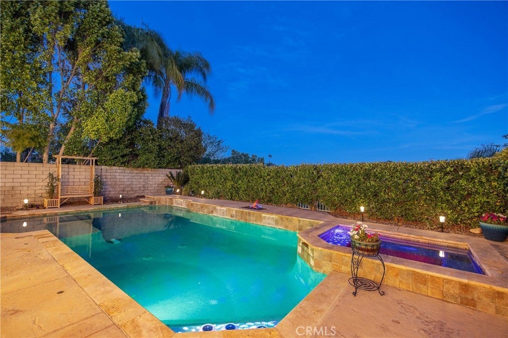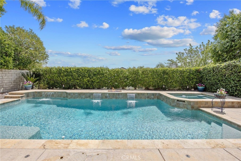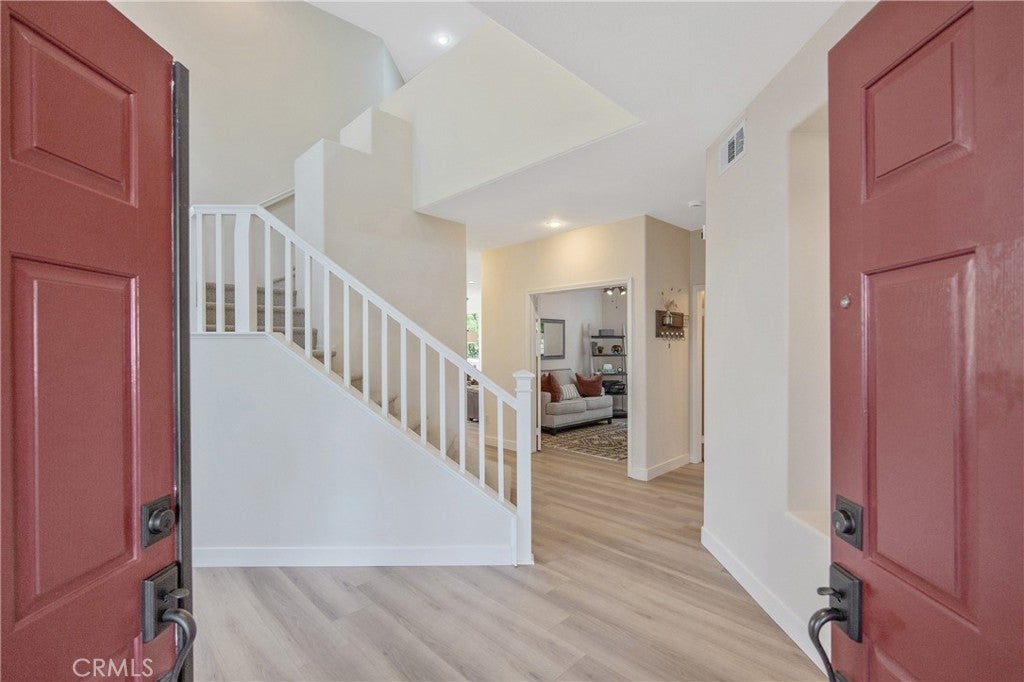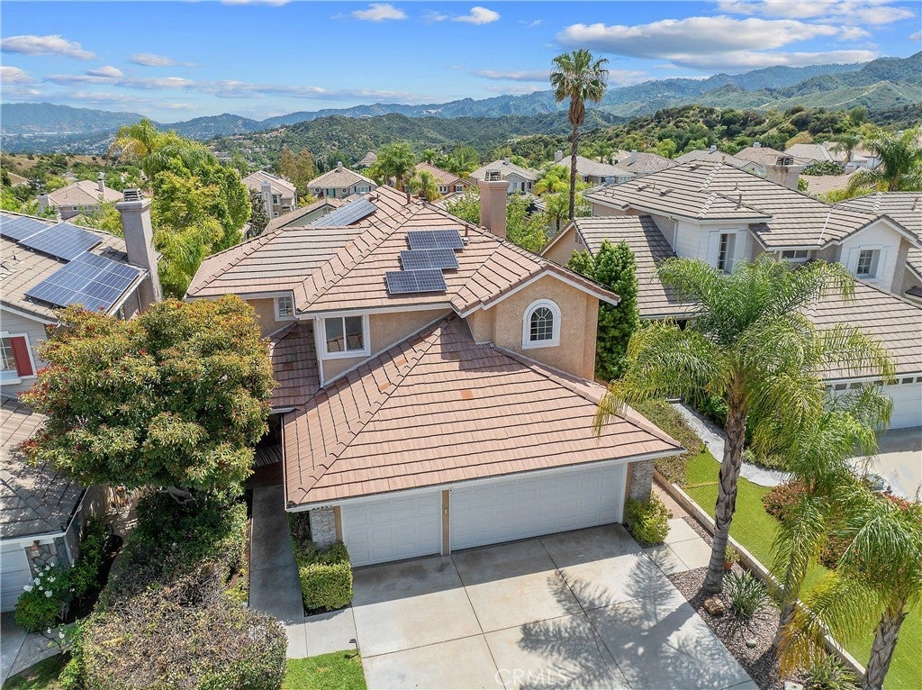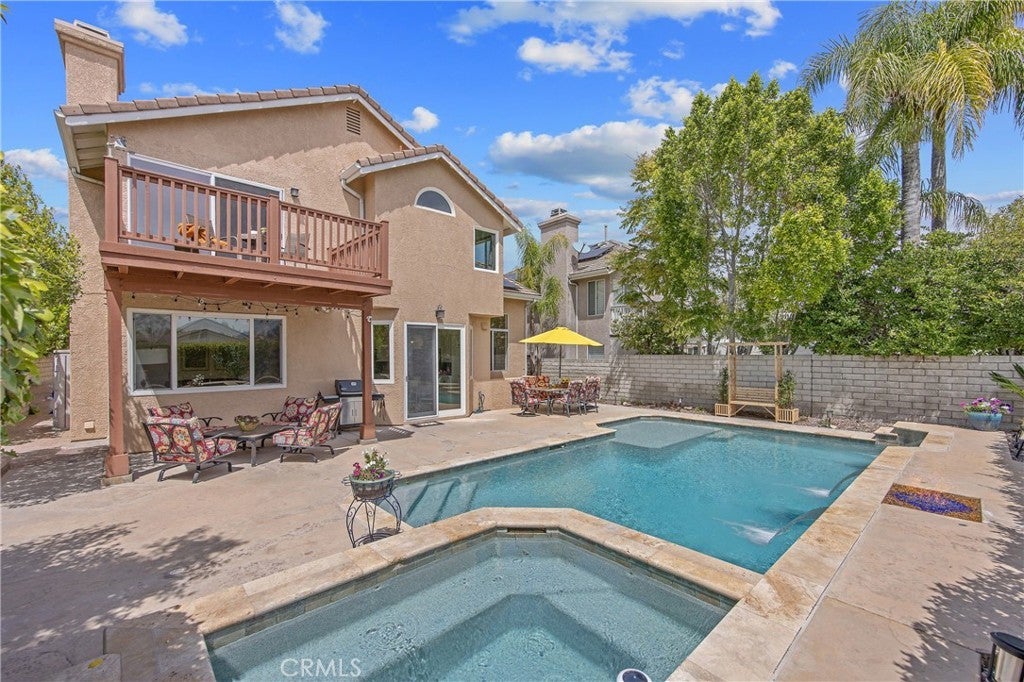 Welcome to this beautifully renovated, turnkey home nestled in the heart of Stevenson Ranch on a quiet cul-de-sac, offering privacy, stunning views, and a truly tranquil setting. This bright and airy residence features soaring vaulted ceilings and abundant natural light, creating an open and inviting atmosphere throughout. Thoughtfully updated, the home showcases new luxury vinyl plank flooring, fresh interior paint, updated baseboards, and stylish new light fixtures that bring a modern, cohesive feel. The kitchen features updated Caesarstone countertops, while all three full bathrooms have been tastefully remodeled to reflect both comfort and contemporary design. New windows throughout—including a new sliding door in the primary bedroom—enhance both natural light and energy efficiency. The flexible floor plan offers four spacious bedrooms upstairs plus an additional bedroom downstairs which is currently used as an office. Or use it as a bonus room or workout room. Downstairs also has a full bath perfect for guests or inlaws. The primary suite includes a walk-in closet and a private Trex deck—perfect for enjoying a cup of coffee on peaceful mornings and taking in the views. Step outside to your private entertainer’s backyard, complete with a custom Pebble Tec saltwater pool and spa, an in-ground fire pit, and mature landscaping that provides beauty and seclusion. Enjoy sun-filled mornings and shaded afternoons in this tranquil outdoor setting—ideal for both relaxing and hosting. Additional highlights include 32 fully paid-for solar panels, a new water heater, and a three-car garage with enclosed overhead storage. This home seamlessly blends modern upgrades, comfort, and exceptional indoor-outdoor living—ready for you to move in and enjoy.