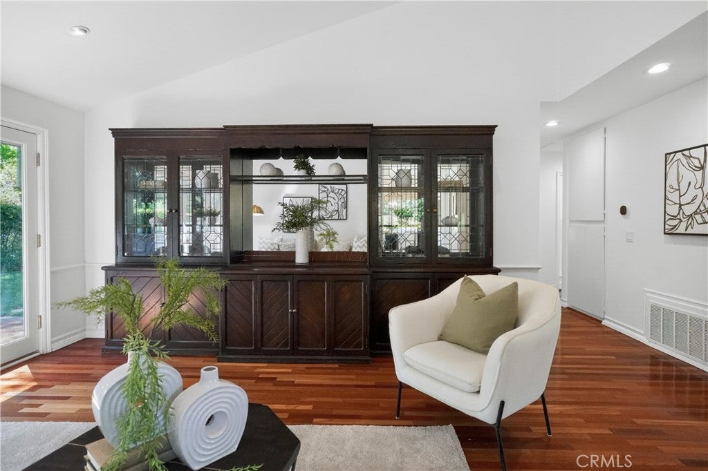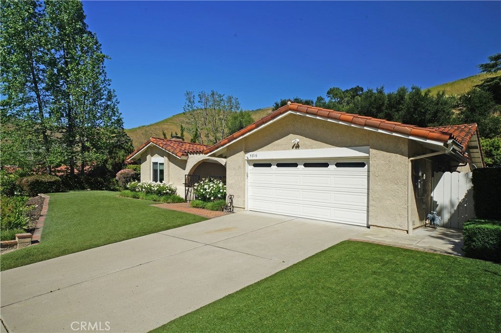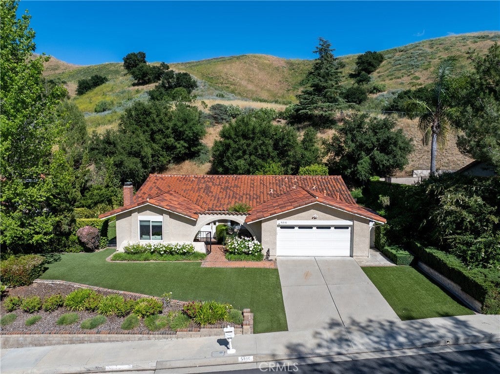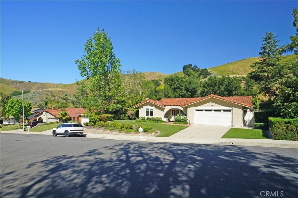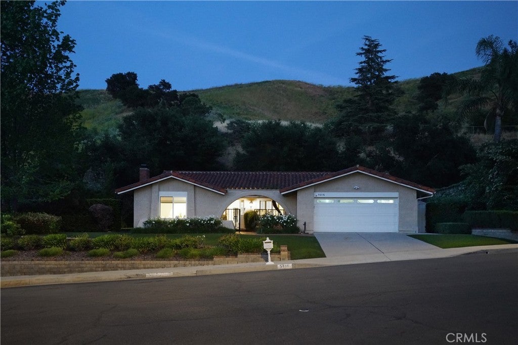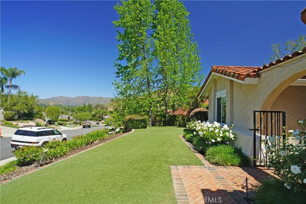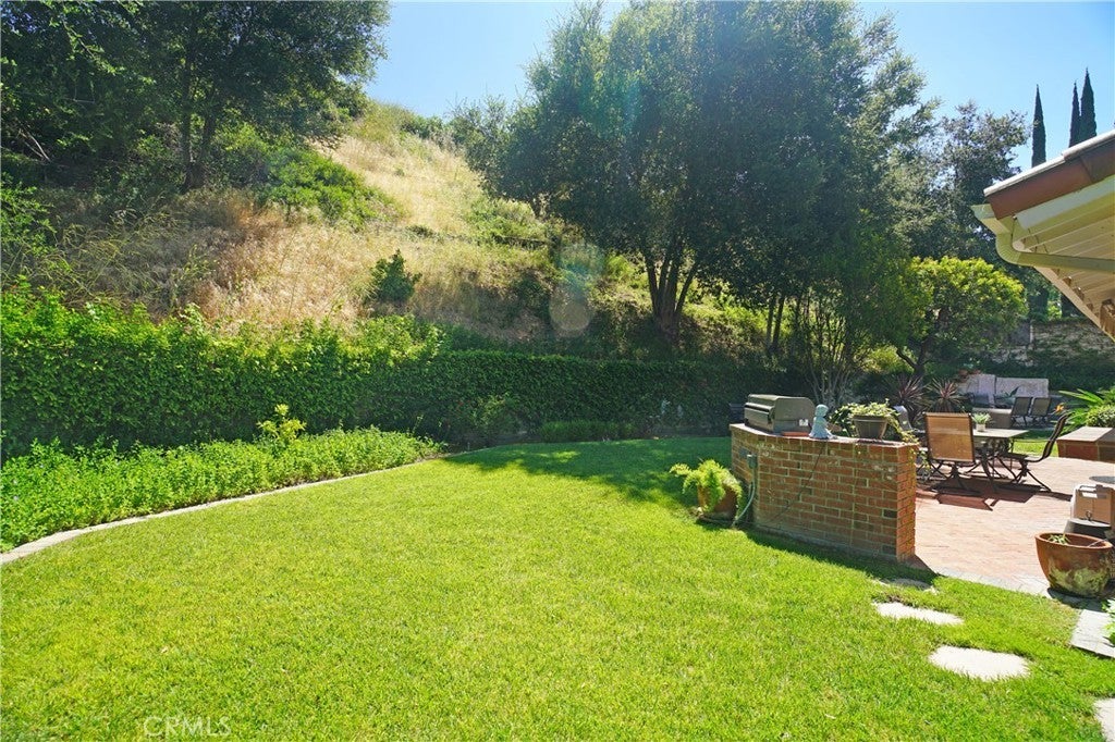 Welcome to this unique opportunity in the highly sought-after Fountainwood community of Agoura Hills. This exceptional single-story home offers over 2,100 square feet on an expanded lot exceeding 40,000 square feet—a combination of size, privacy, and potential that is seldom available. Ideally located on Carell Avenue, one of Fountainwood’s most desirable streets, the property enjoys wider spacing and no backyard neighbors, creating a level of privacy that is increasingly hard to find. From the moment you arrive, the home’s gorgeous curb appeal immediately stands out. Enter through an inviting atrium into a bright, flowing floor plan. Rich cherry wood flooring, custom moldings, baseboards, paneling, and wainscoting—crafted by a local artisan—add warmth and character throughout. The step-down living room is anchored by a striking limestone decorative fireplace, creating a sophisticated yet comfortable focal point. The kitchen features travertine floors, granite countertops, oak cabinetry, stainless steel appliances, and just outside the kitchen, a walk-in bar with counter seating—ideal for everyday living and entertaining. The spacious primary suite includes dual closets, including a walk-in, and a marble bath. Secondary bedrooms are well-proportioned, with a hall bath offering a relaxing spa tub. The backyard is where this home truly separates itself. Backing to open space, it offers exceptional privacy and tranquility. The oversized lot provides a rare opportunity to build a view deck on the hillside—unlocking what could become one of the most compelling view properties in Agoura Hills. The brick patio with awning is a perfect outdoor sanctuary, and is a blank canvas for a future pool or custom outdoor retreat. Additional features include owned solar panels (offsetting electric costs), smooth ceilings, recessed lighting, built-in garage storage, fresh paint, a tile roof, and a concrete driveway designed for long-term, low-maintenance living. Fountainwood is known for its peaceful setting, strong sense of community, and access to award-winning schools within the Las Virgenes Unified School District. Surrounded by scenic mountains, hiking and biking trails, and parks, yet just minutes to shopping, dining, the freeway, and the beach — this location offers the best of both convenience and lifestyle. The fire in the decorative fireplace was added virtually.