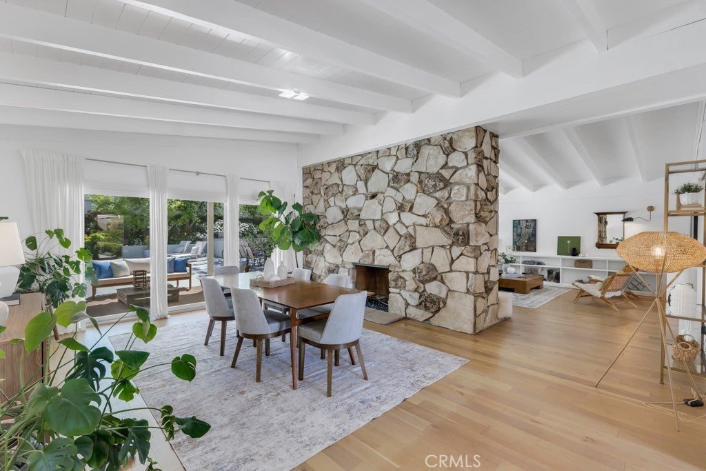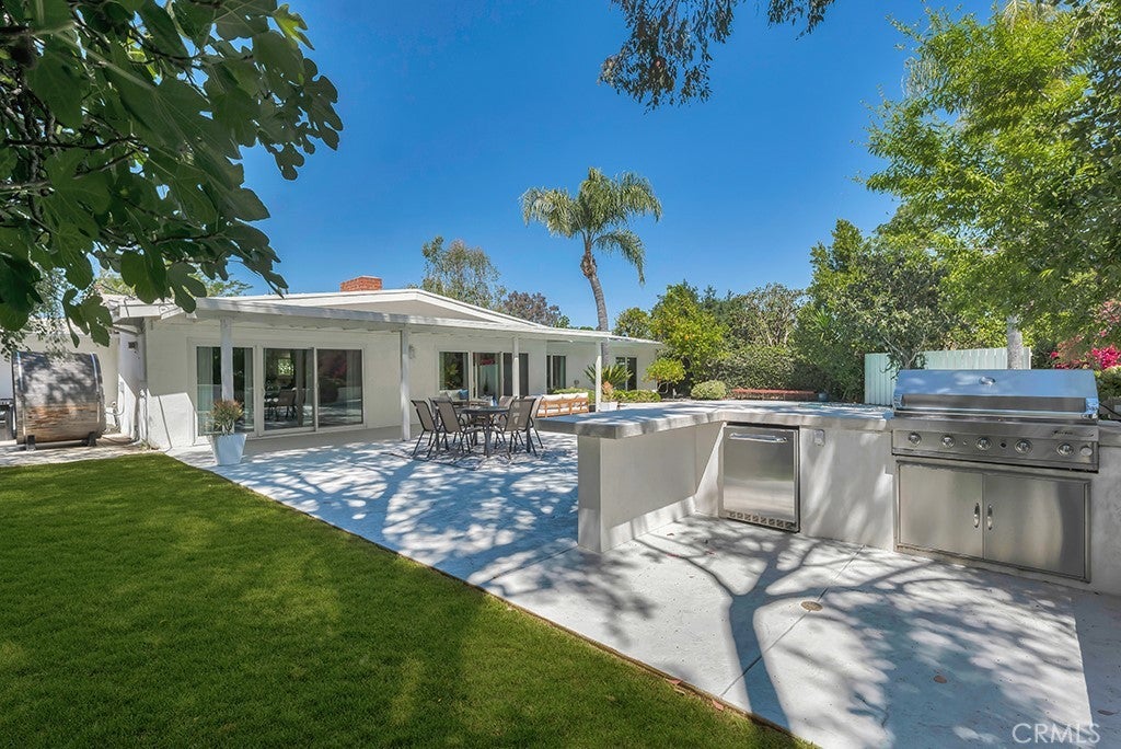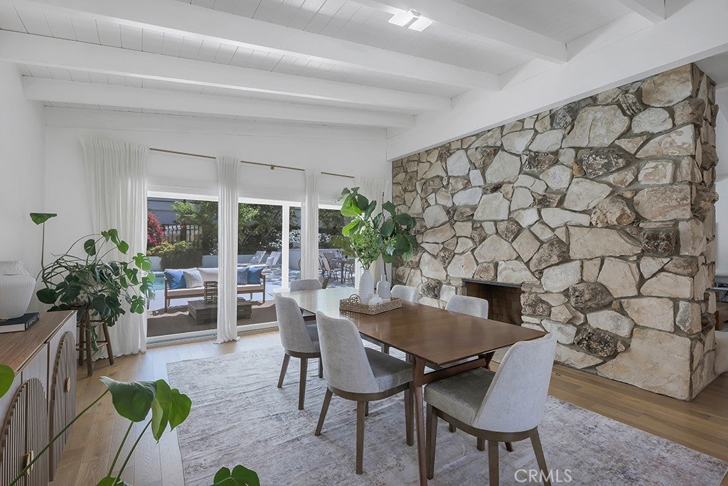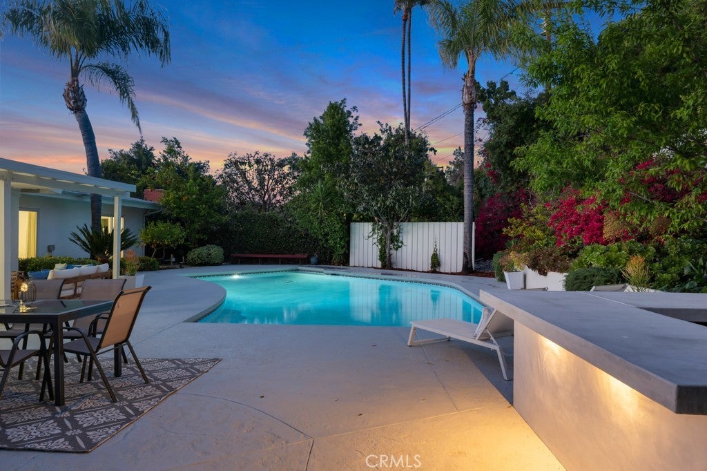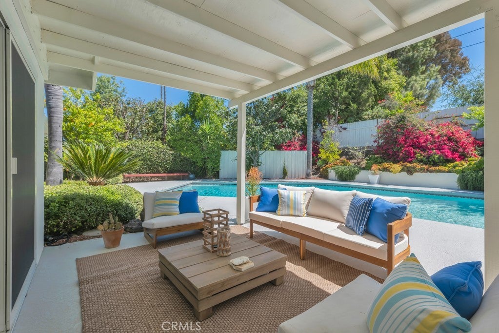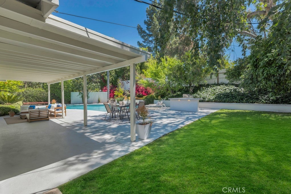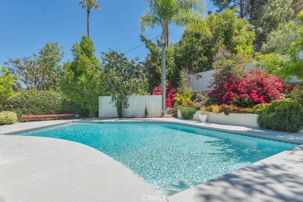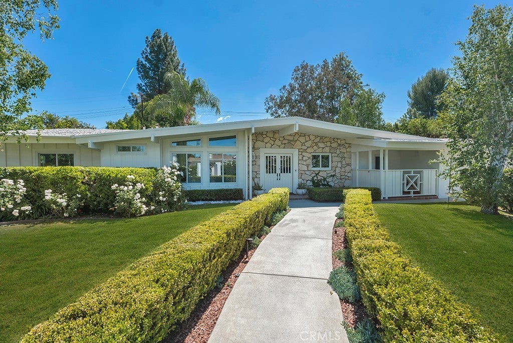 This stunning Charles Du Bois-designed Contemporary Ranch offers 2,115 sq ft of living space on a generous 11,703 sq ft lot in one of Woodland Hills' most sought-after neighborhoods. All the iconic Du Bois signatures are on full display: a striking stone facade, classic double entry doors, a low-pitched roofline with overhanging eaves, and a seamless indoor-outdoor flow that defines the best of mid-century California living. Inside, the sun-drenched open great room is anchored by a dramatic floor-to-ceiling stone fireplace, white-painted wood beam ceilings, and gleaming hardwood floors that connect the living and dining areas with effortless style. The updated kitchen features crisp white cabinetry, a diamond tile backsplash, a gas cooktop, and stainless appliances. The home's two designer bathrooms are showstoppers in their own right, one boasts a freestanding soaking tub, rich deep-green zellige tile, a walnut vanity, and classic penny tile floors, while the other features a dual-sink marble vanity and a glass-enclosed shower. Four well-proportioned bedrooms and a 2-car attached garage round out the interior, while the gated front yard with manicured hedges and lawn provides privacy and outstanding curb appeal. Out back, the resort-worthy yard is an entertainer's dream, a large sparkling pool, an expansive grass area, and a generous covered patio perfect for al fresco dining or relaxed outdoor seating, all framed by vibrant bougainvillea and mature trees for total seclusion. Ideally situated with close proximity to the El Camino Shopping Center, The Commons at Calabasas, easy 101 freeway access, and nearby hiking trails, this is Southern California living at its finest.